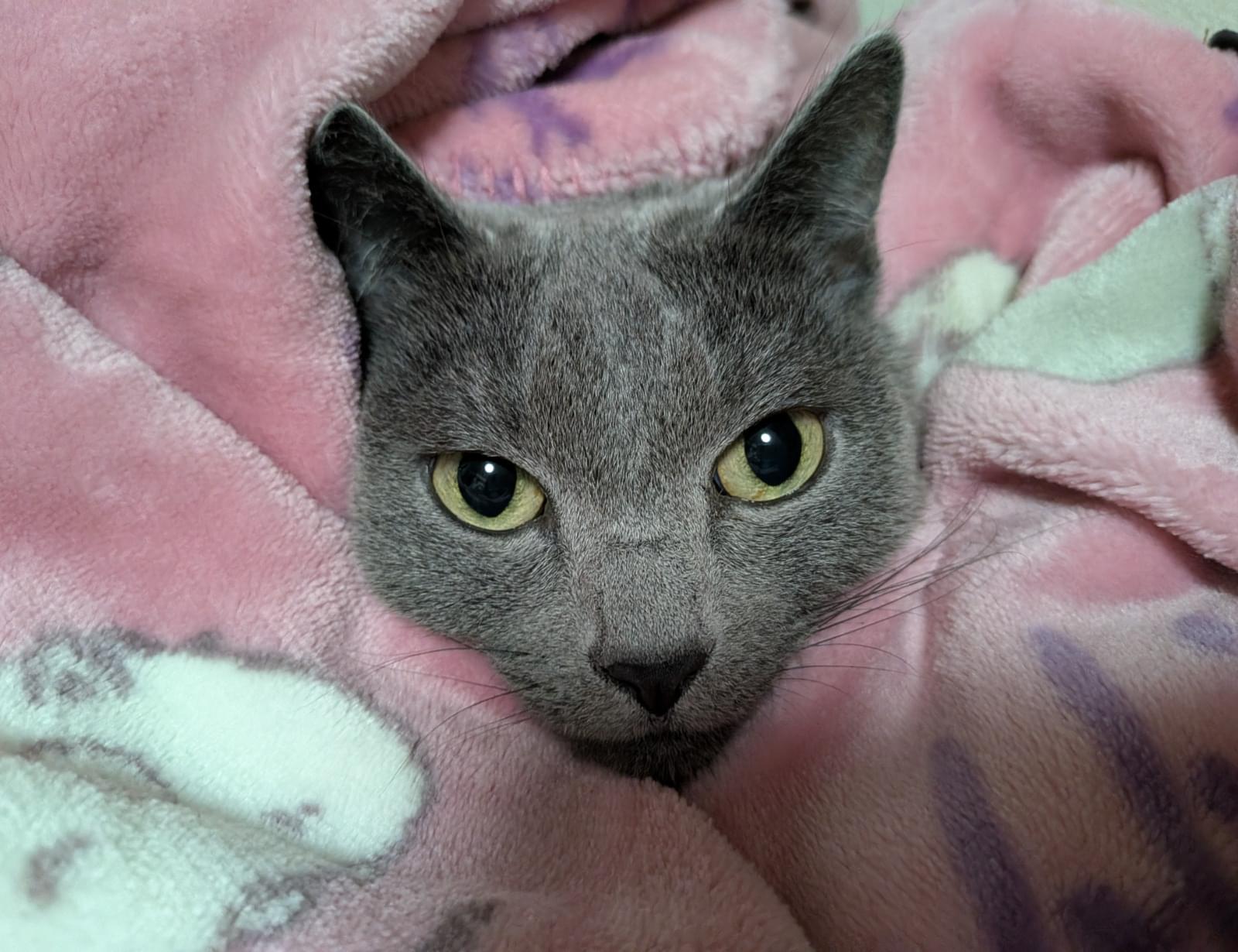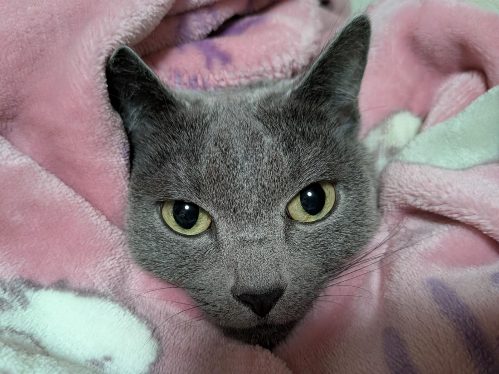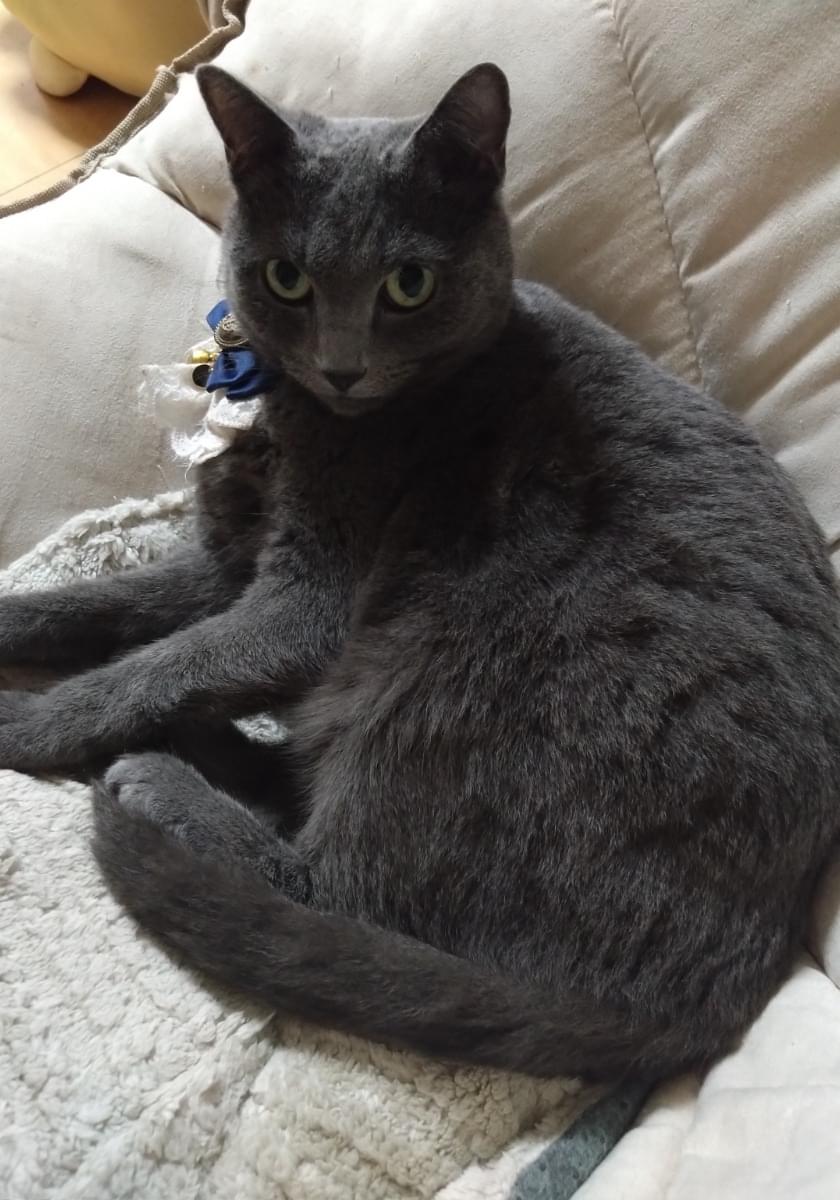 赤いリボンの首輪をつけたロシアンブルーです。