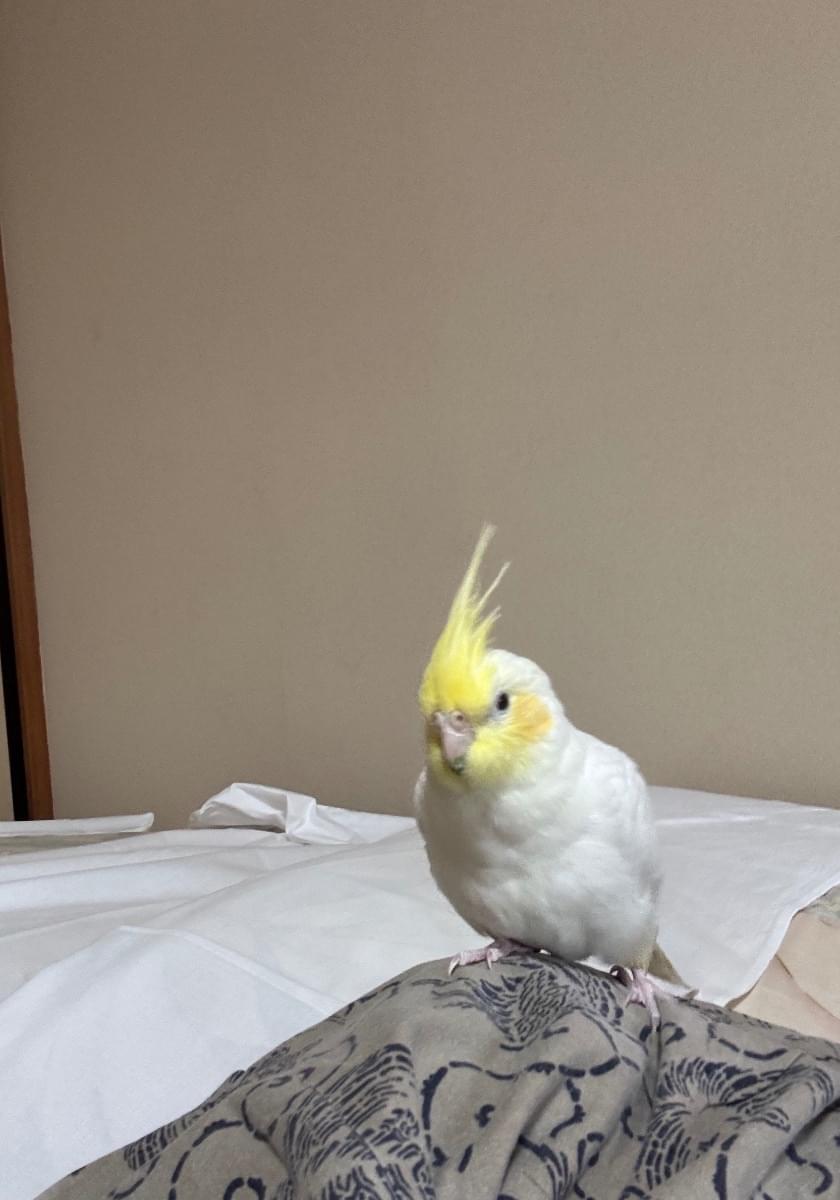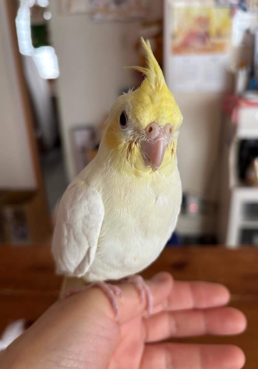 かんむりが黄色で全体は白です。ほっぺの色が薄い黄色です。