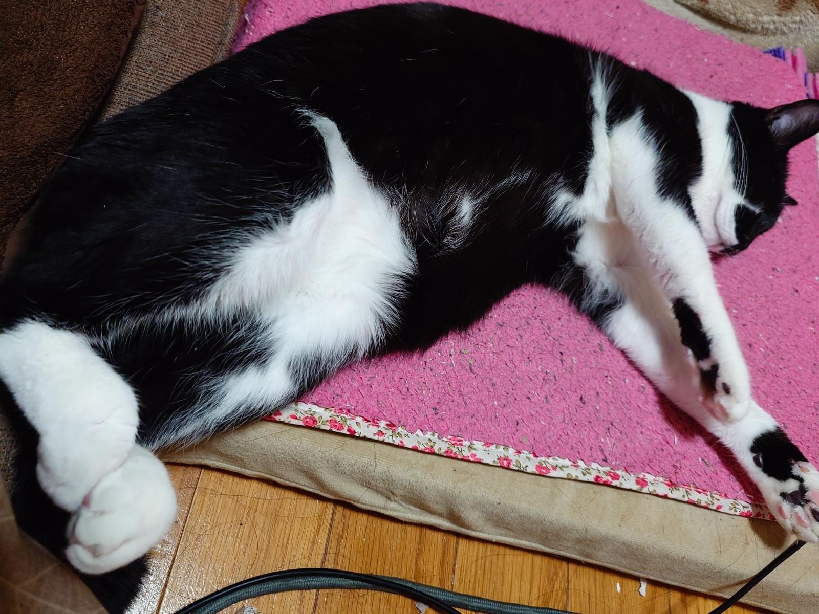 白黒のタキシード柄。胸が白くおなかは黒、下腹付近は白、手足は白です。