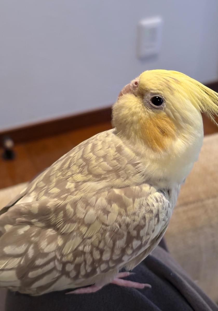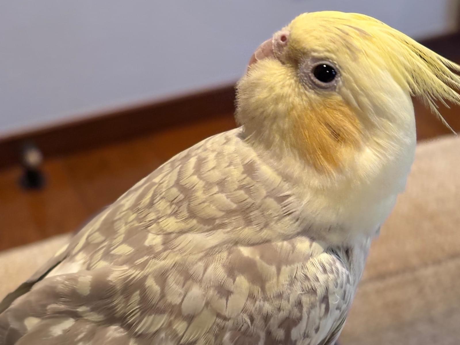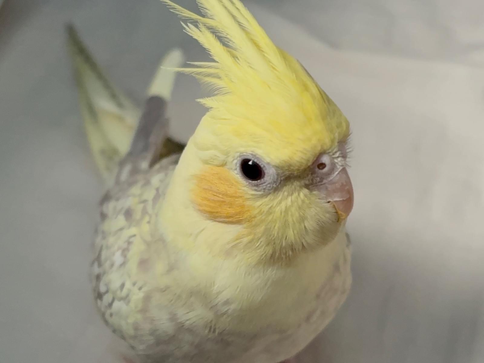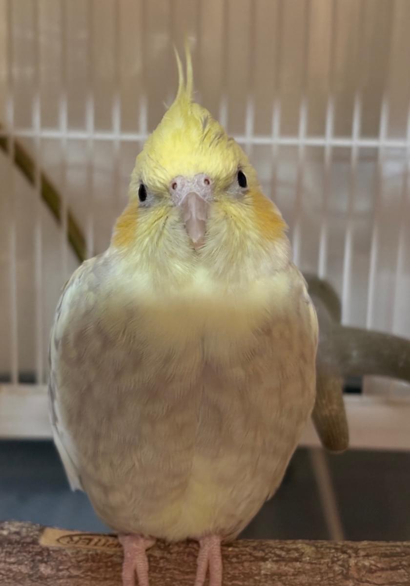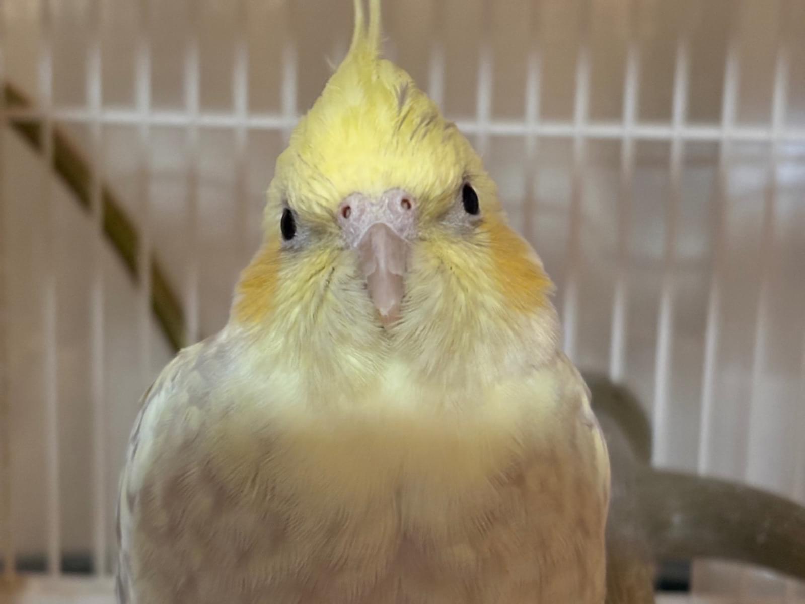特徴:全体的に薄い黄色で、背中の羽は灰色と白のまだら模様。ほっぺは薄いオレンジ色です。甘えん坊で常に人間にくっついています。さんちゃんと名前を呼ぶと、「ぴーー!」っと返事をしてくれます。