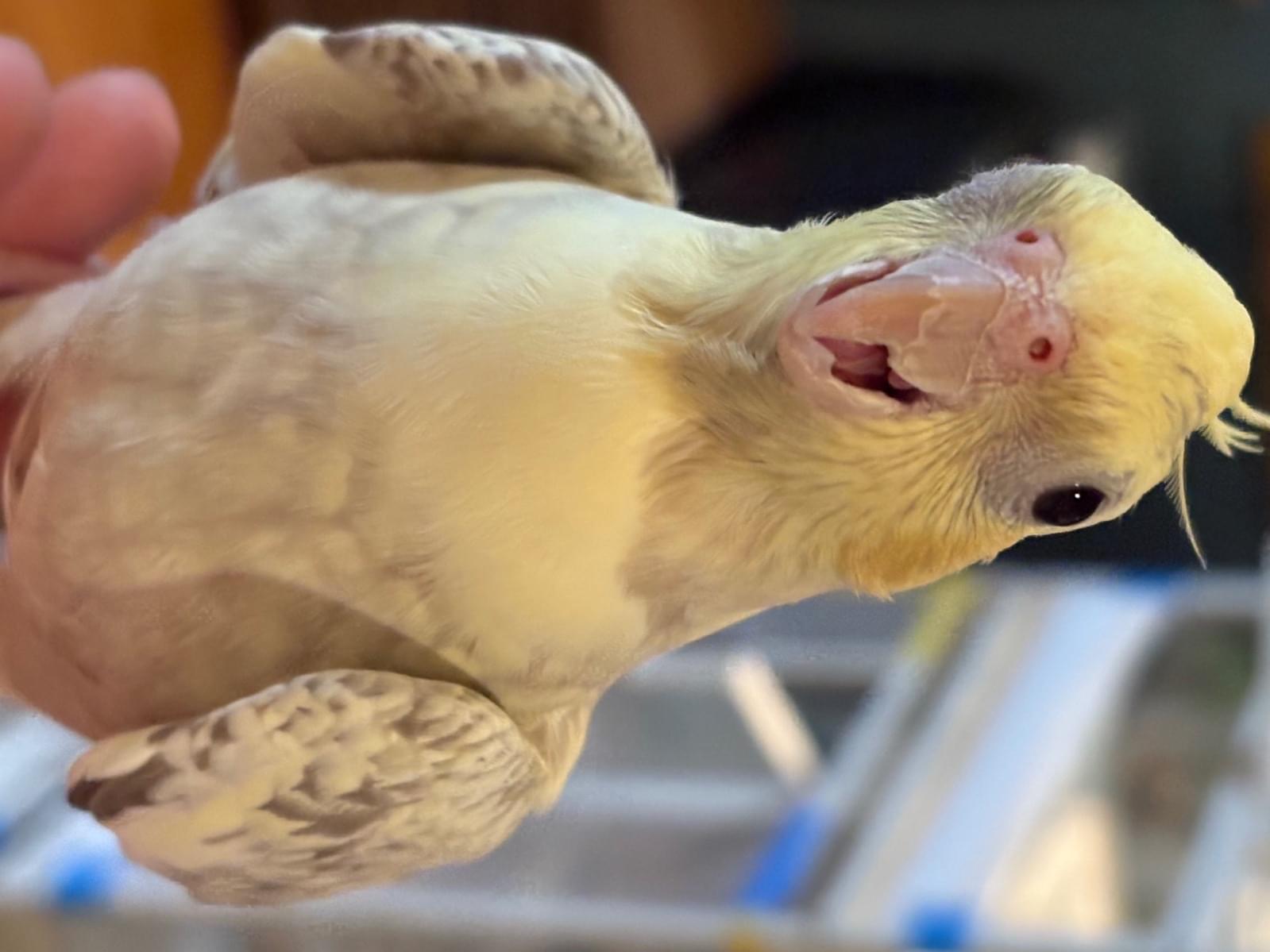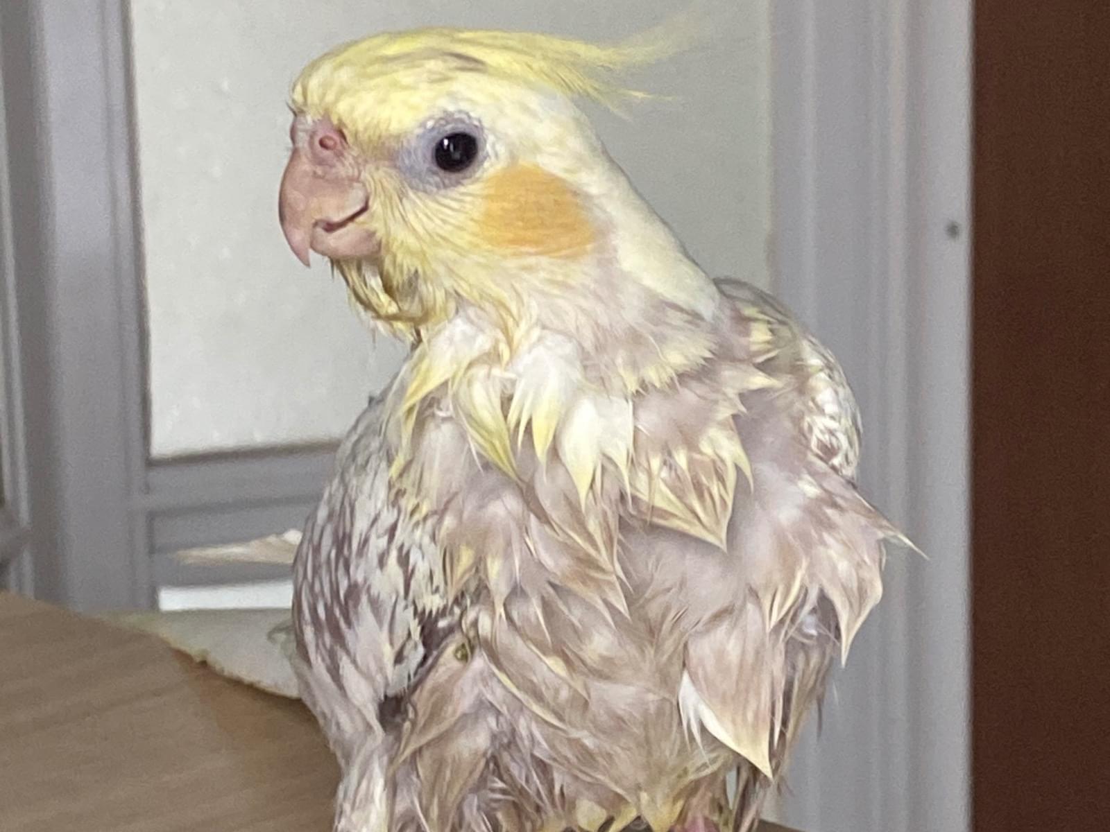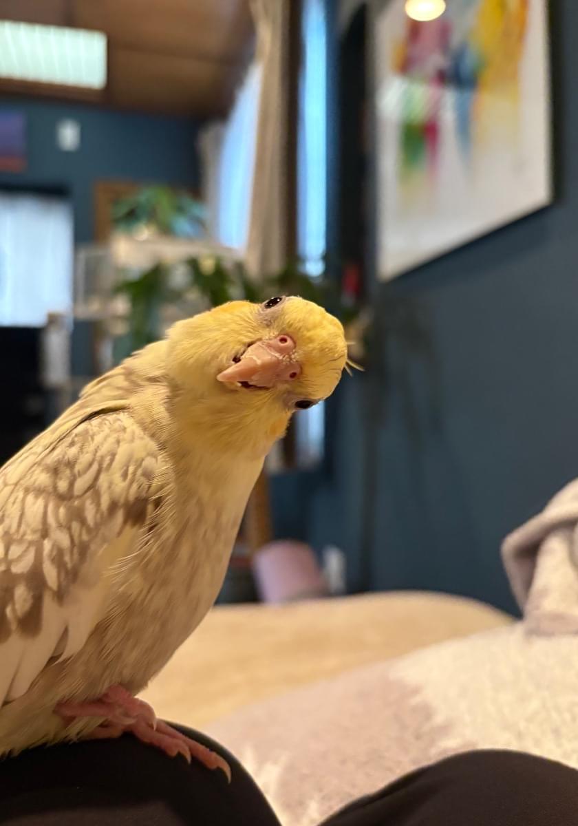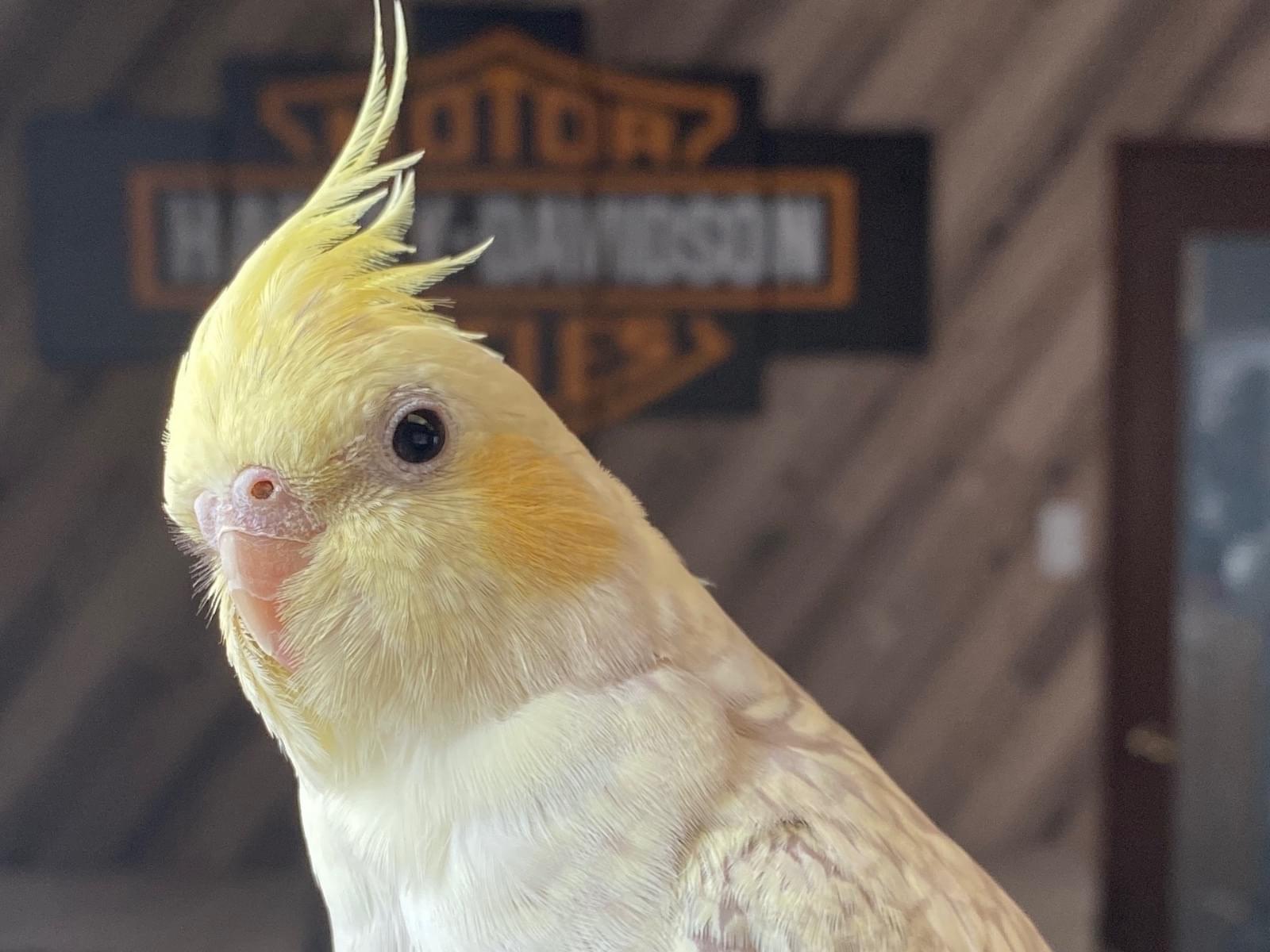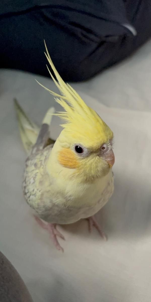 特徴:全体的に薄い黄色で、背中の羽は灰色と白のまだら模様。ほっぺは薄いオレンジ色です。甘えん坊で常に人間にくっついています。さんちゃんと名前を呼ぶと、「ぴーー!」っと返事をしてくれます。