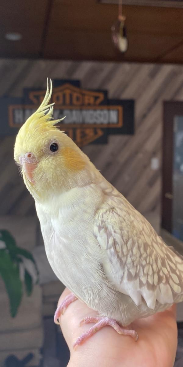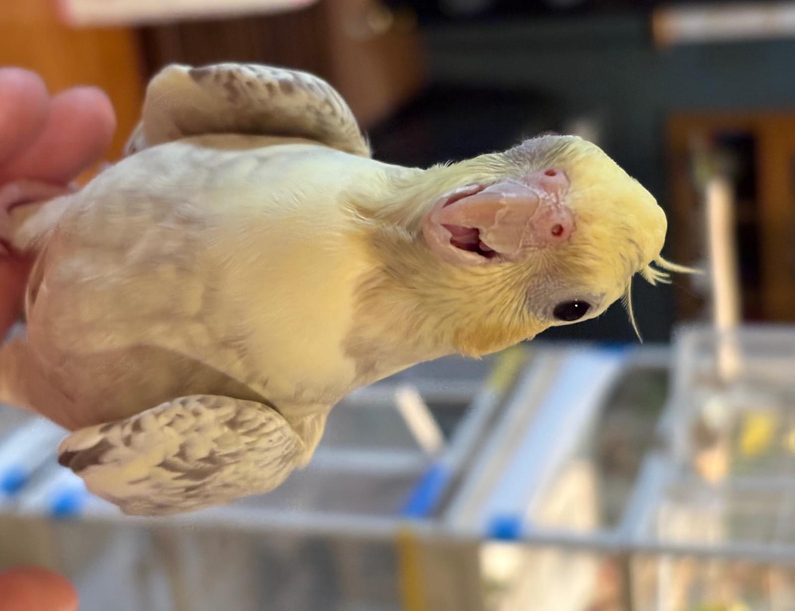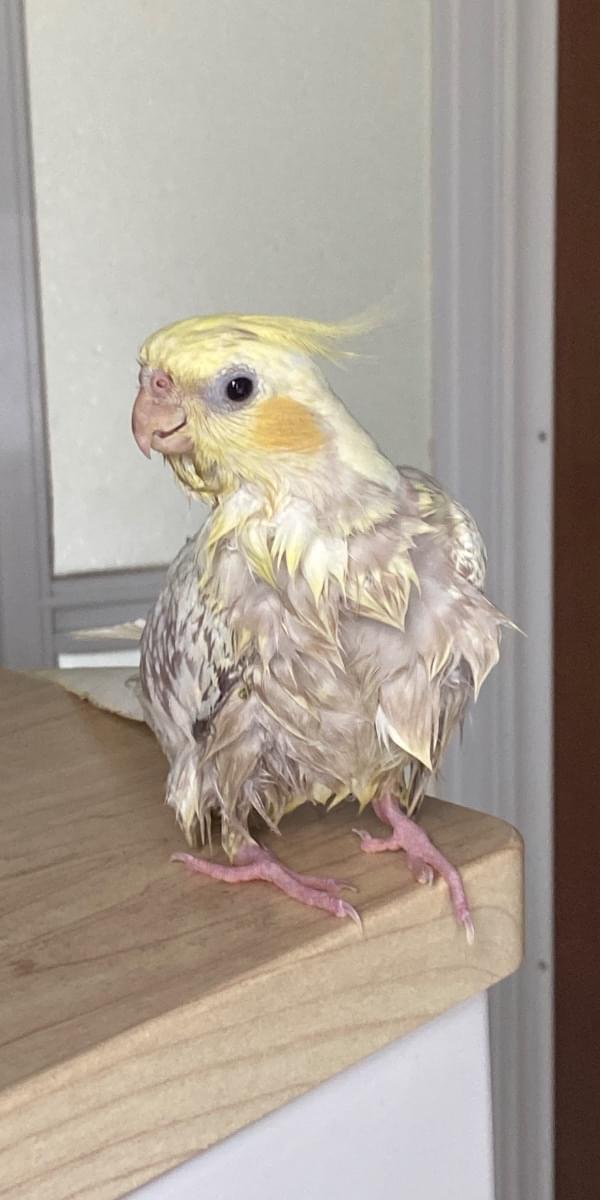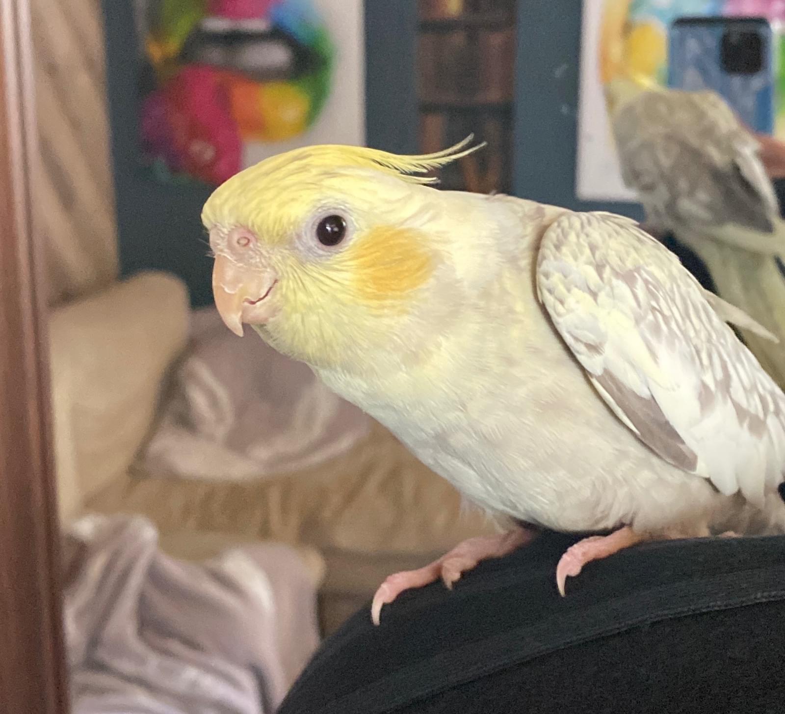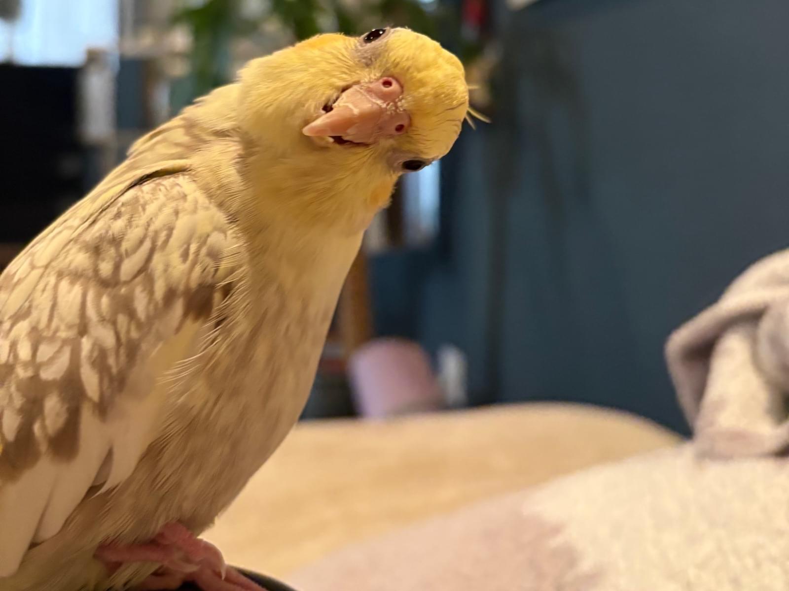 特徴:全体的に薄い黄色で、背中の羽は灰色と白のまだら模様。ほっぺは薄いオレンジ色です。甘えん坊で常に人間にくっついています。さんちゃんと名前を呼ぶと、「ぴーー!」っと返事をしてくれます。