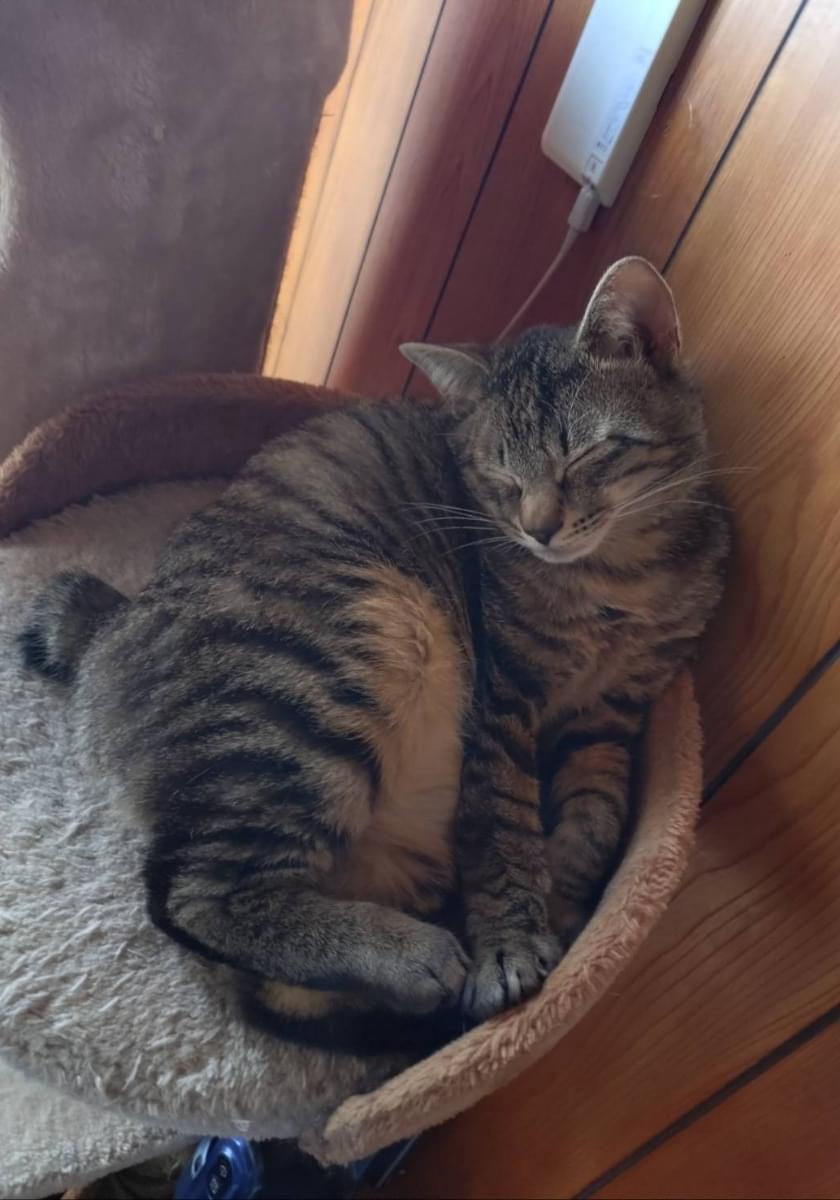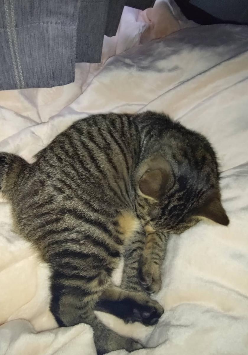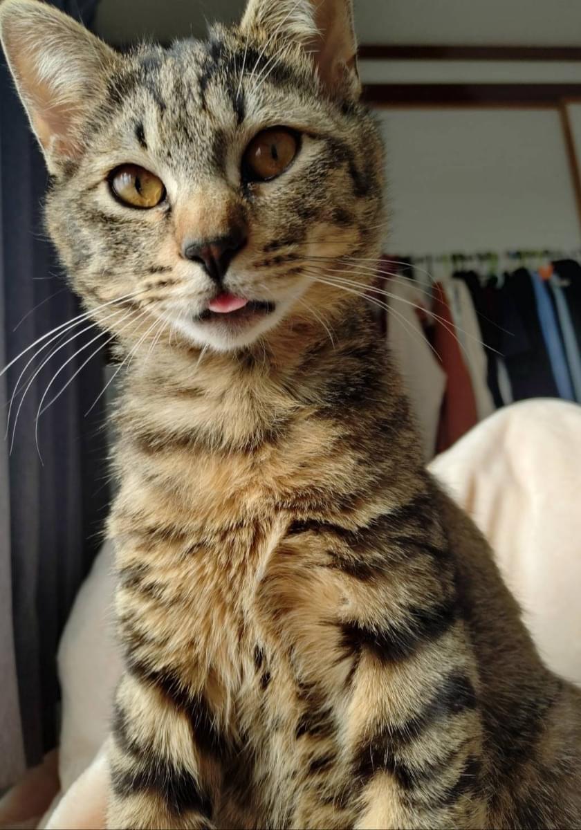 生後8ヶ月のオスの子猫、去勢していない、黒と茶色のキジトラ模様、瞳の色は茶色、鼻の色は濃い茶色、肉球の色は黒、しっぽが短くて丸い形、眉毛と下腹部の毛が薄い、首輪・鑑札なし、体重3〜4kg、体長約40cm