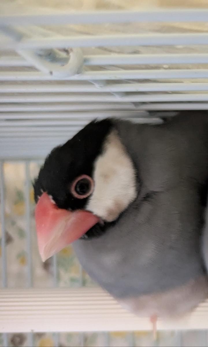 胸もとに白い毛が紛れており、くちばしの色が薄い桜文鳥を探しています。