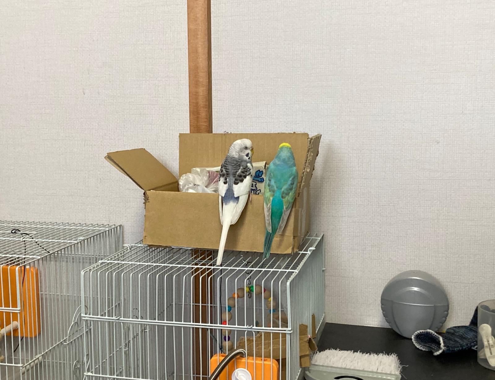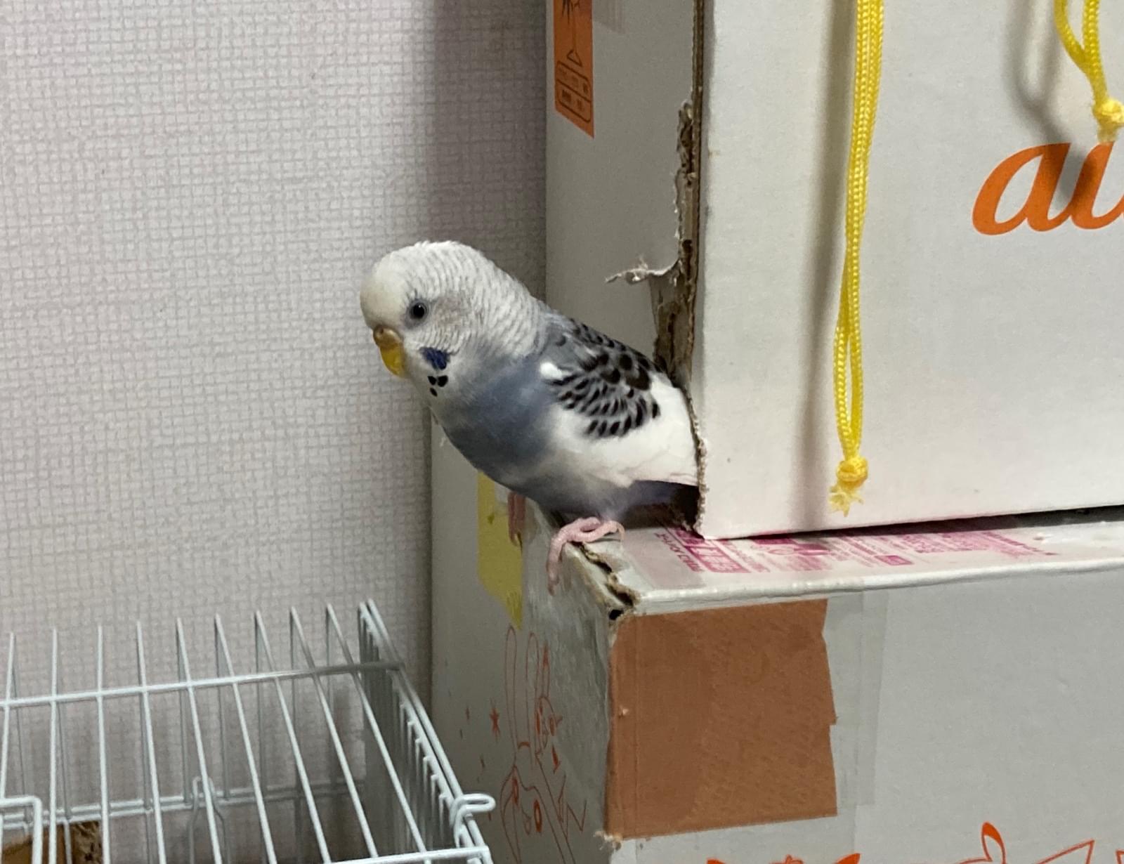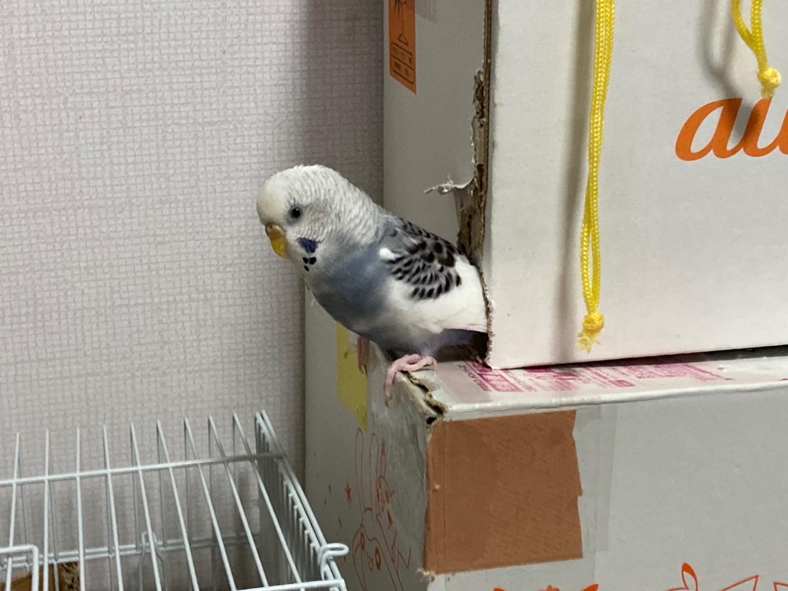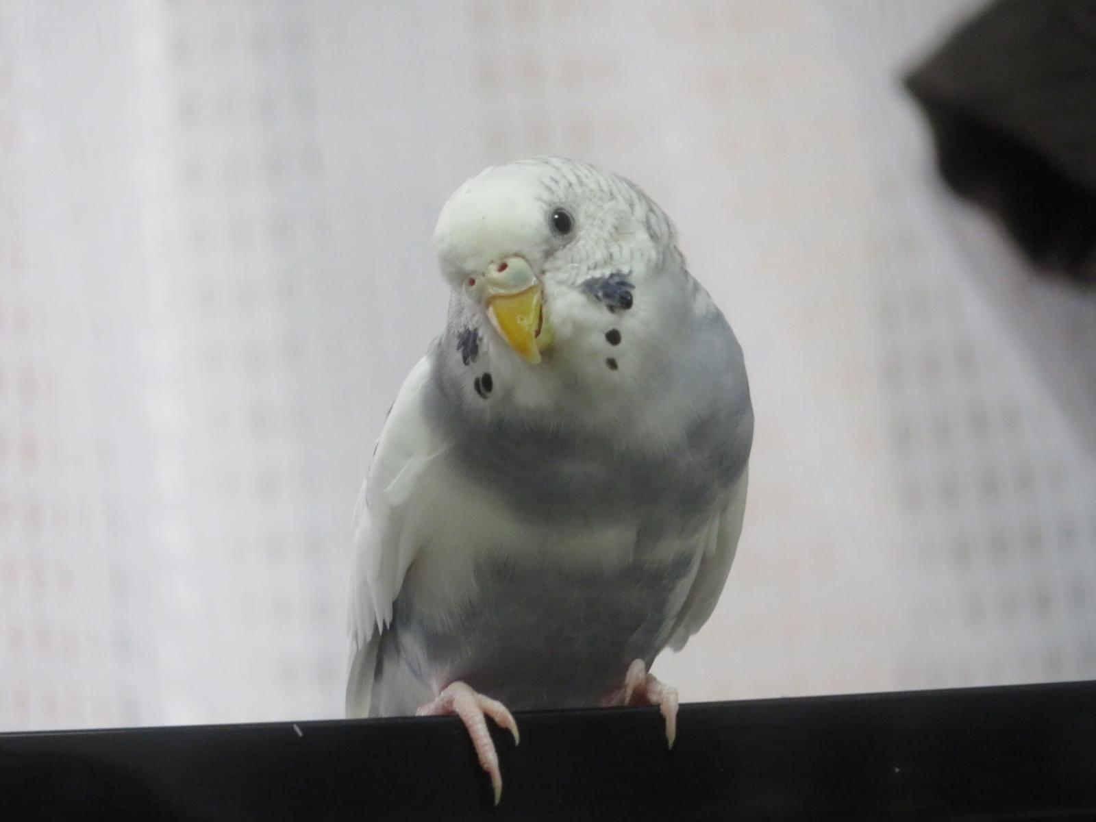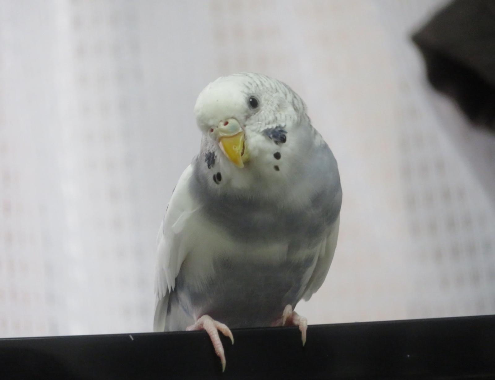 白色ベースで羽根に黒い斑点、胸元が水色のセキセイインコを探しています