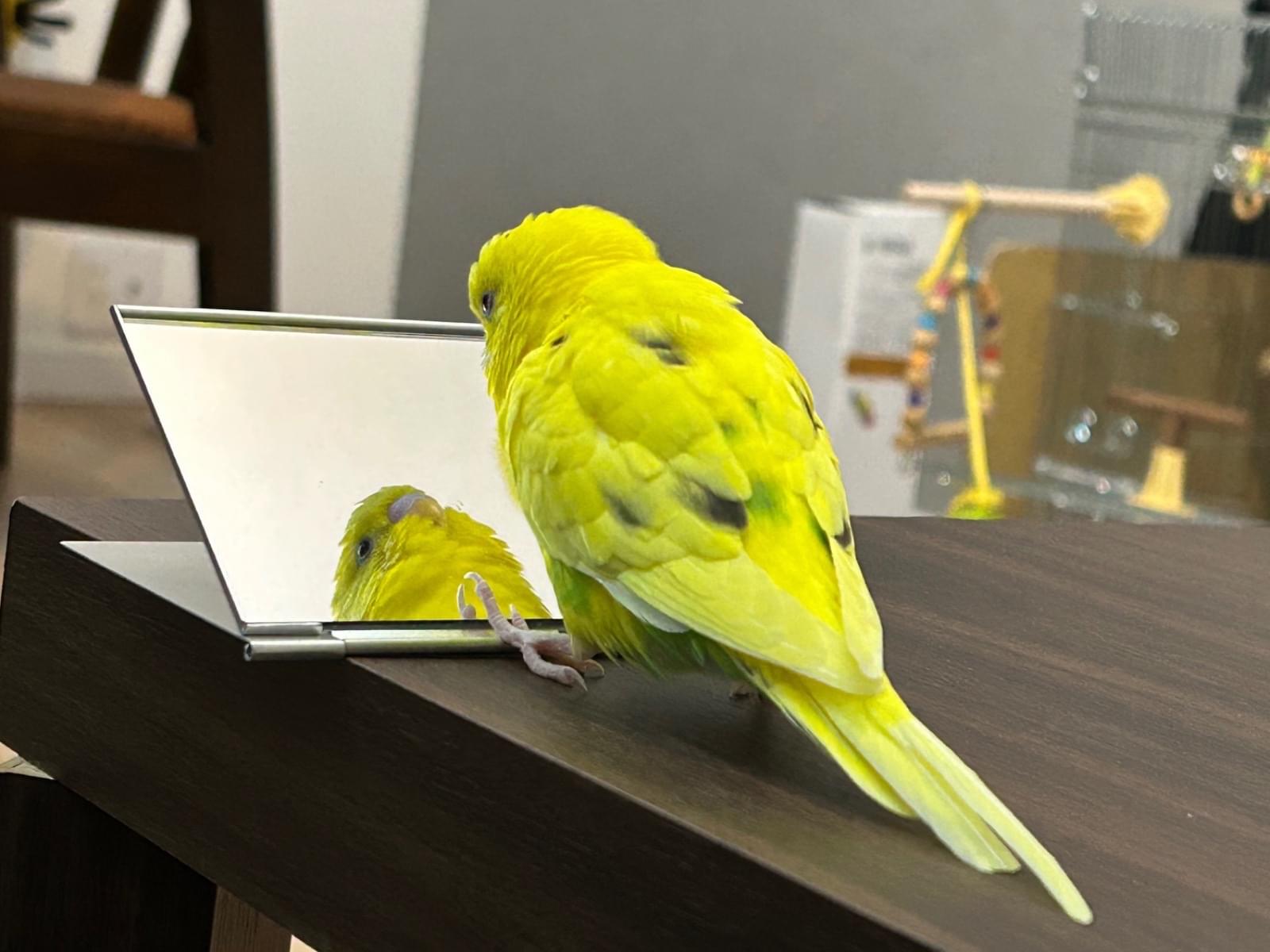 「ピー助」「ぴーちゃん」など話します。鏡が好きです。