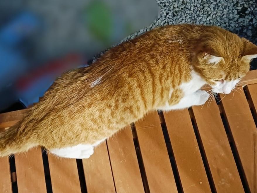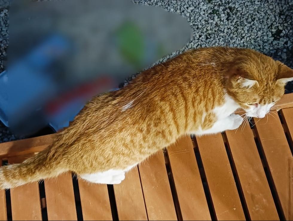 鼻の横の模様や右ひじの模様が個性的で 背中にも白い斑点が2つあります。
