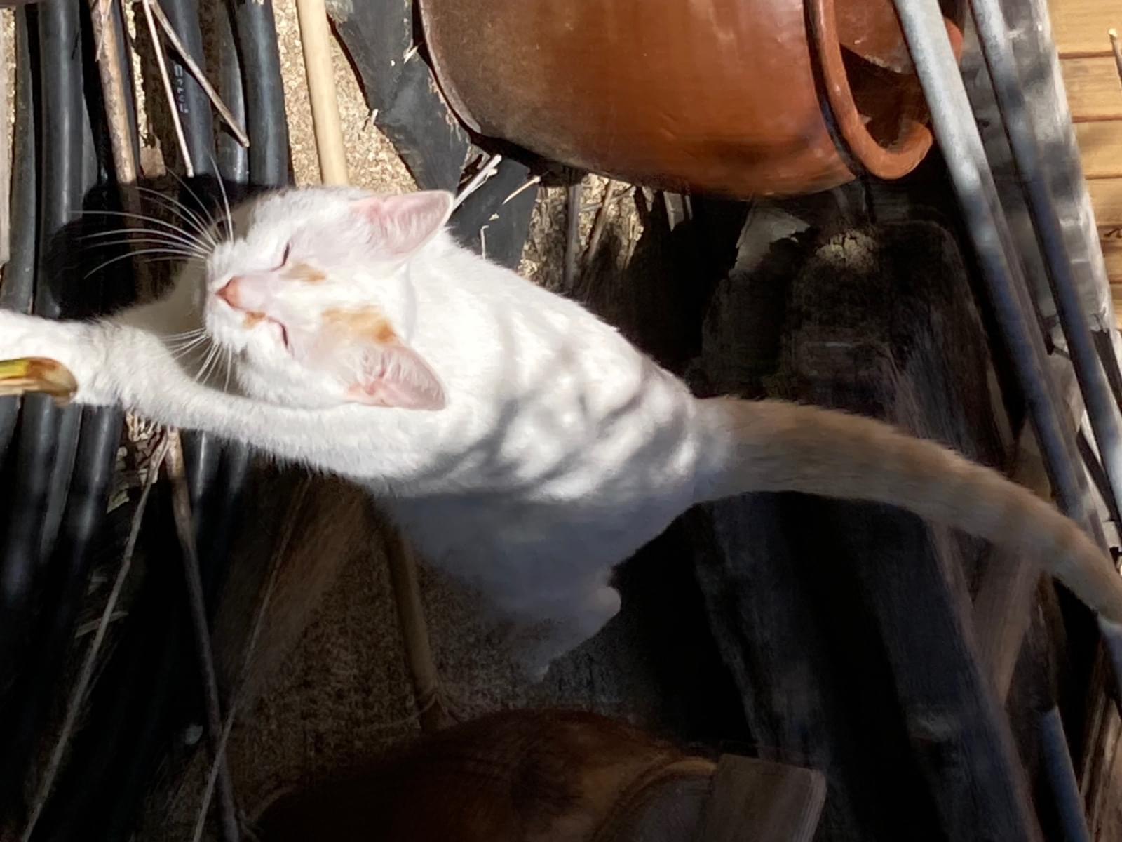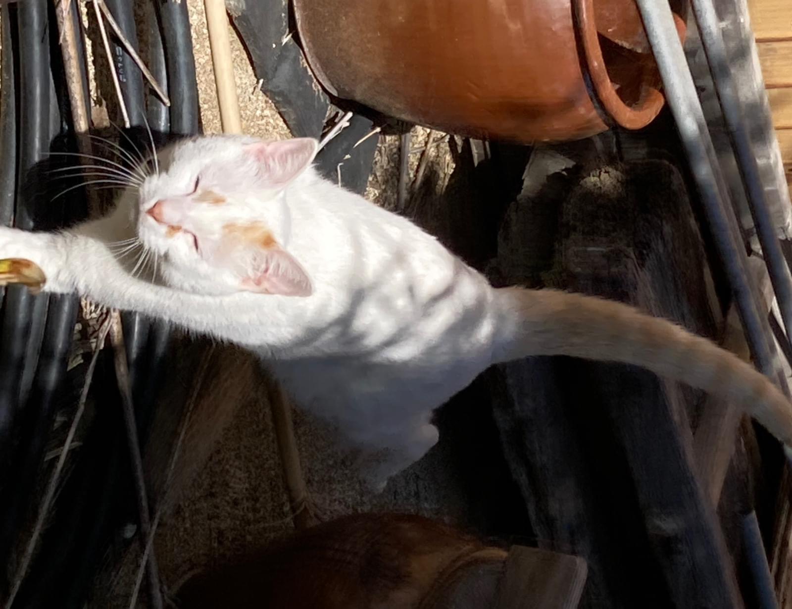 白色に尻尾が茶色の縞模様の猫を探しています。