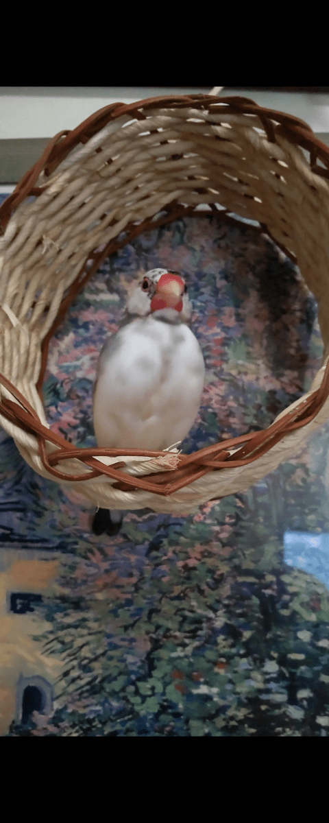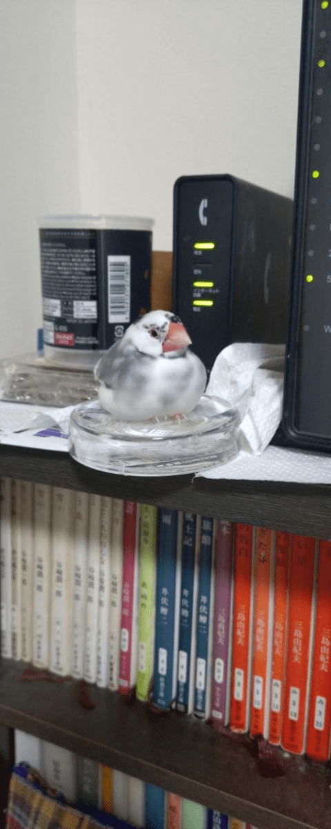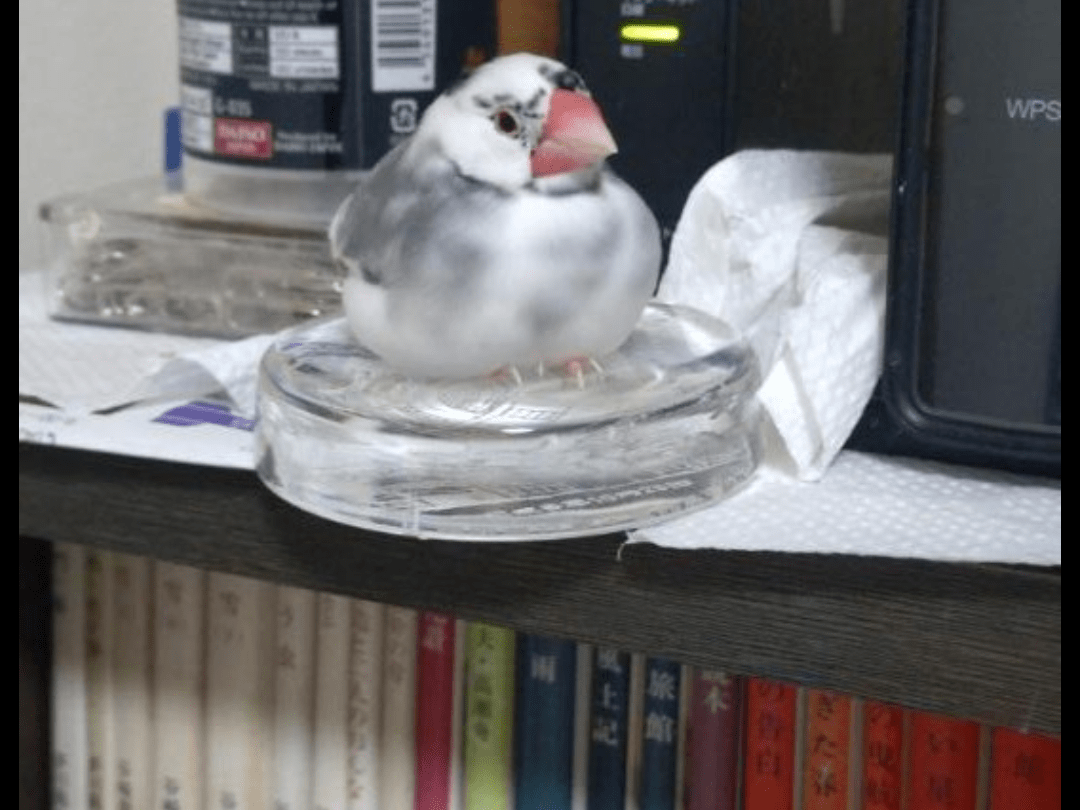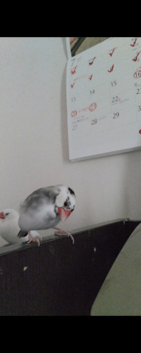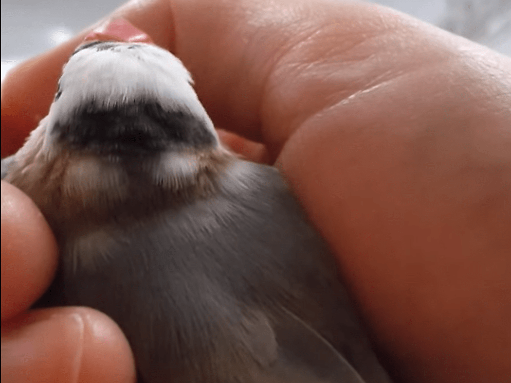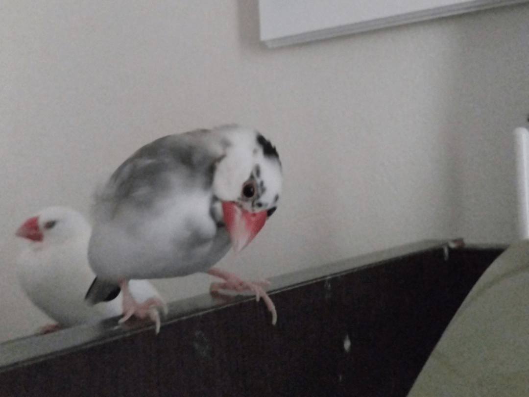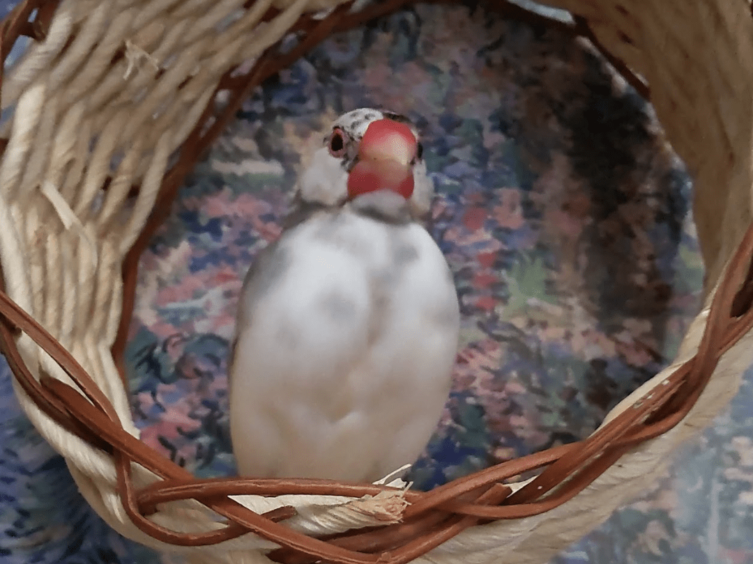 成鳥ですが一般的な文鳥より小さく(四十雀程度の大きさ)、鳴き声はメスですが、「あ"っ あ"っ」と潰れたような鳴き声を発します。気分で人に甘えて手の中に入ってくることもあります。