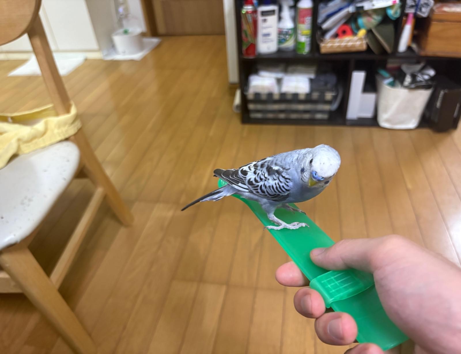 青い手乗りサイズのセキセイインコです。