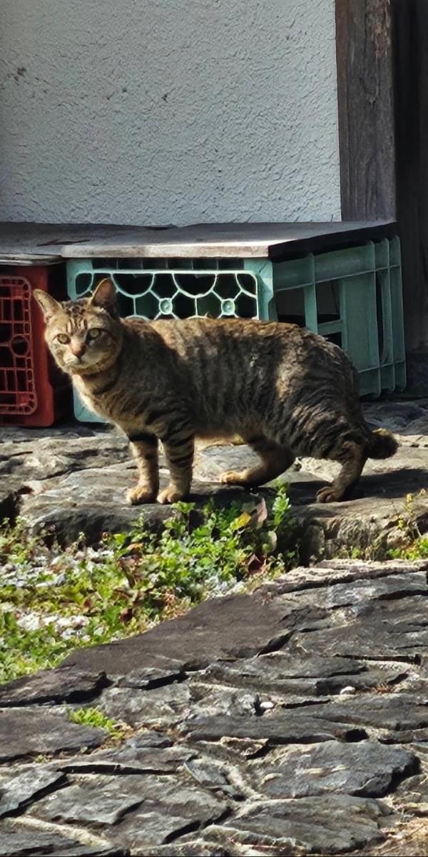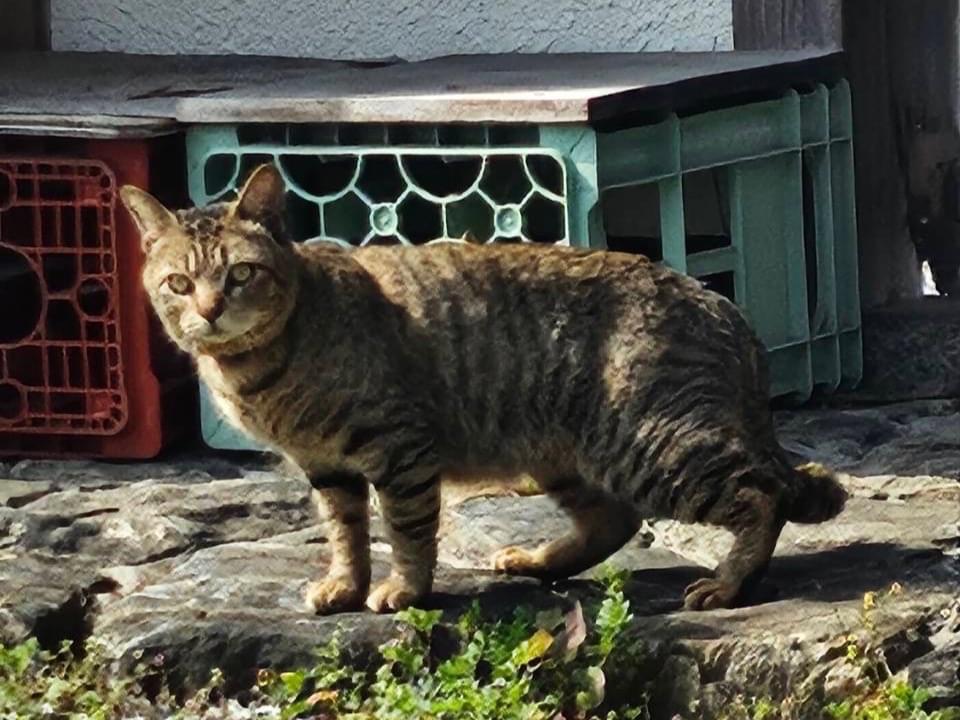 家の庭に首輪ハーネスをつけた迷い猫がいます