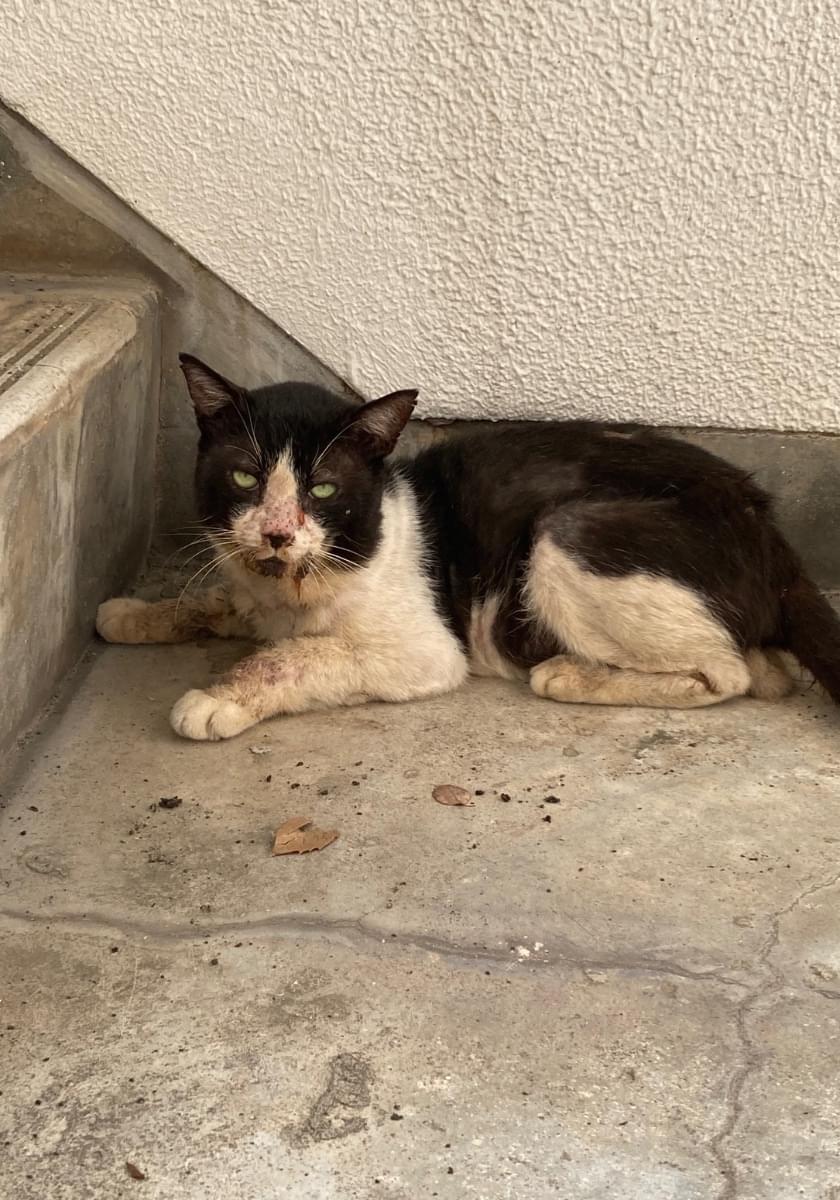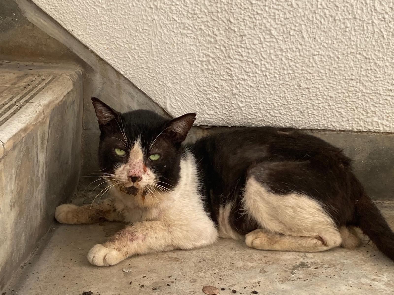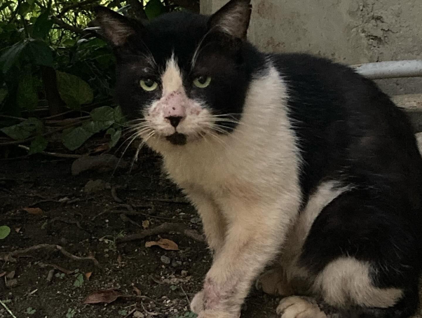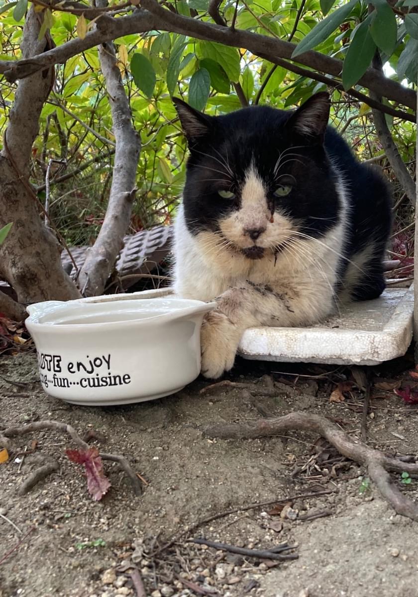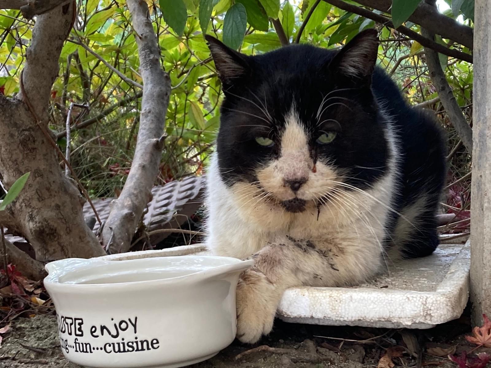白黒で小柄ですが、足は体に比べて太く、全体的に汚れています。警戒心の強い猫です。