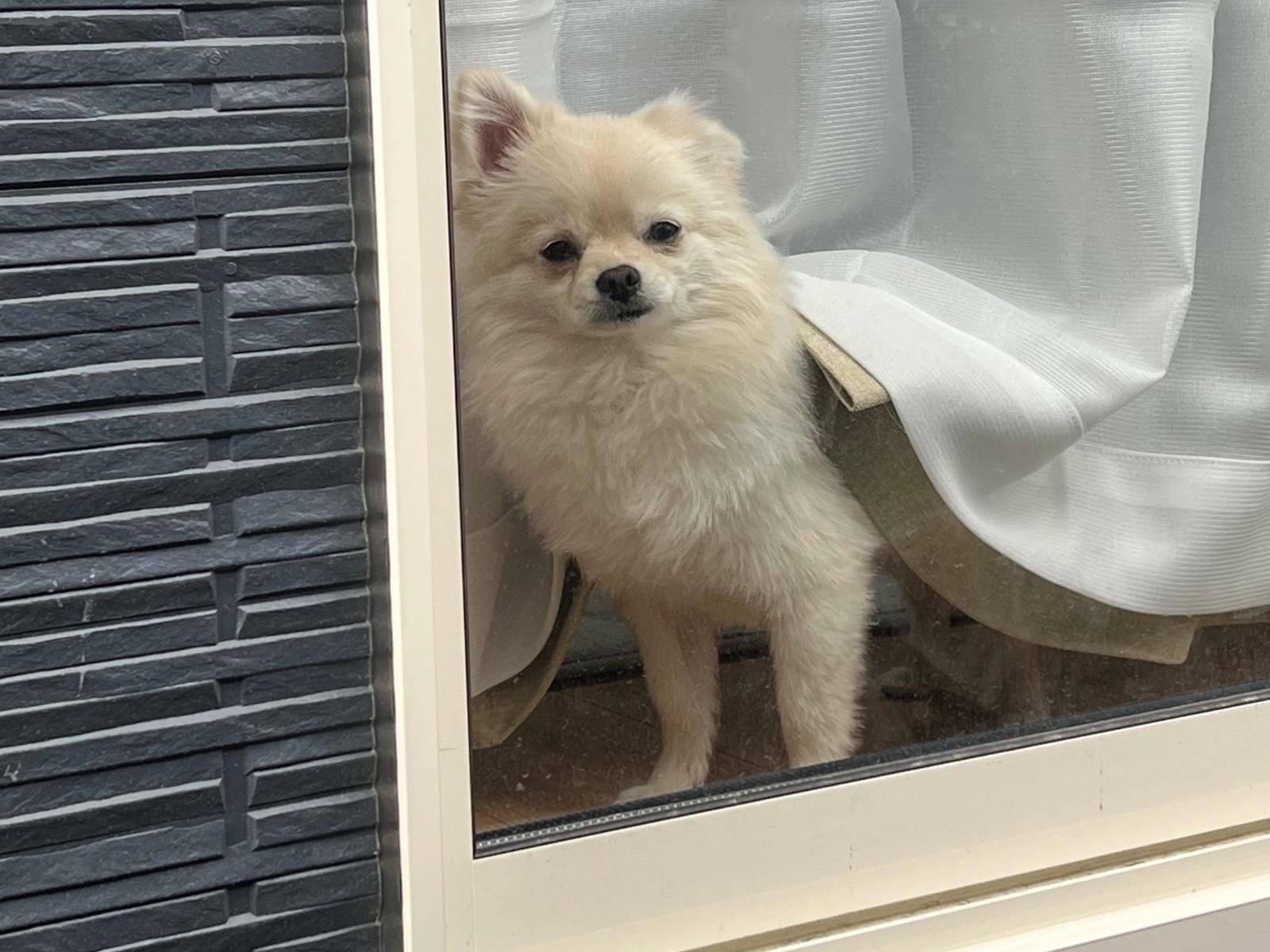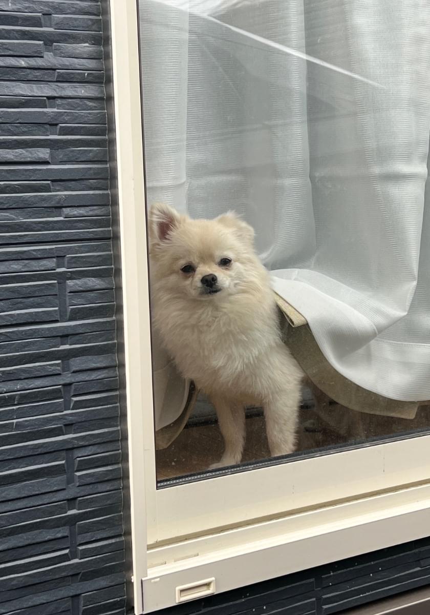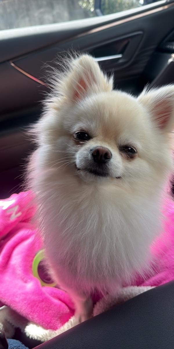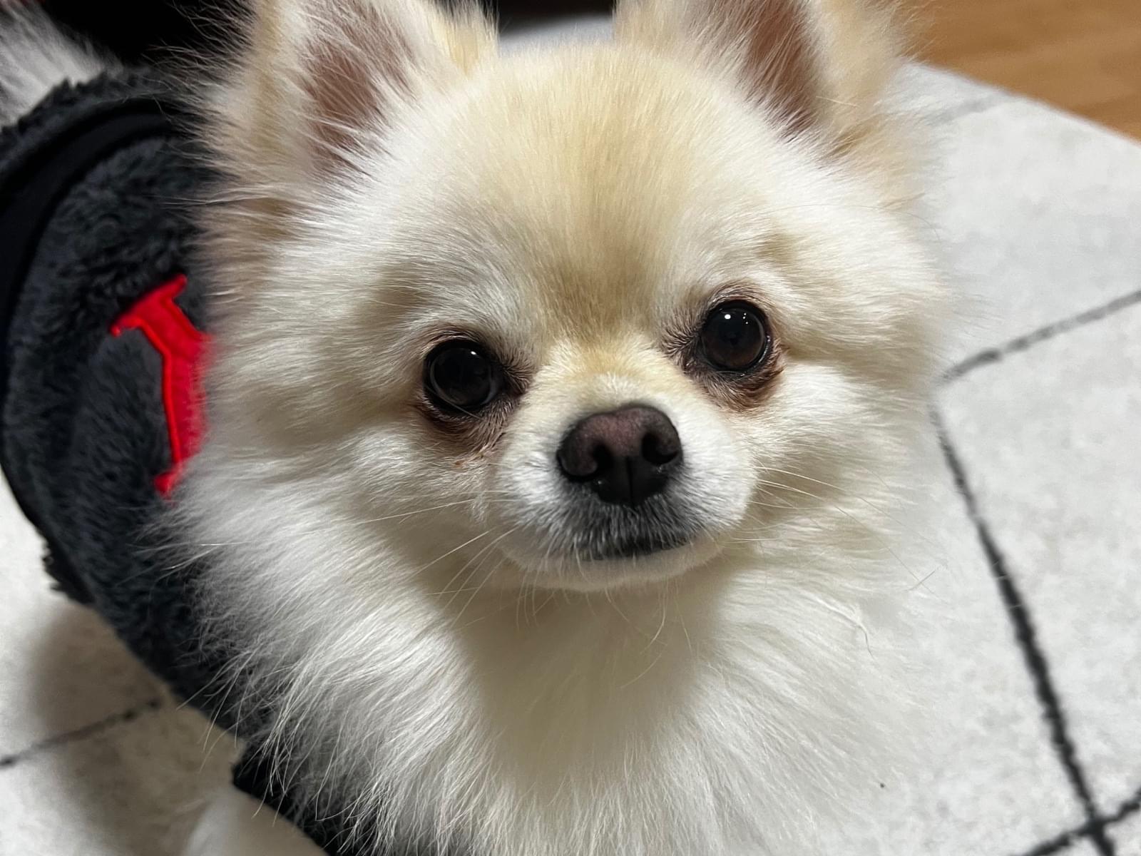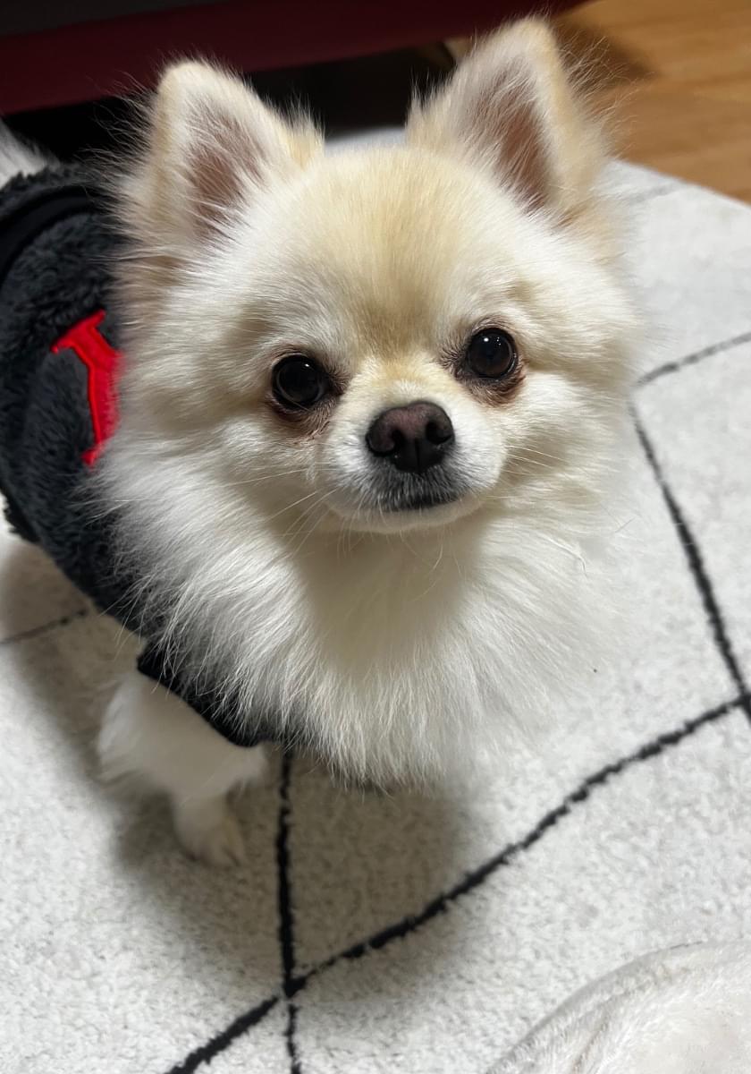 赤の首輪を付けてる真っ白のチワポメを探してます
