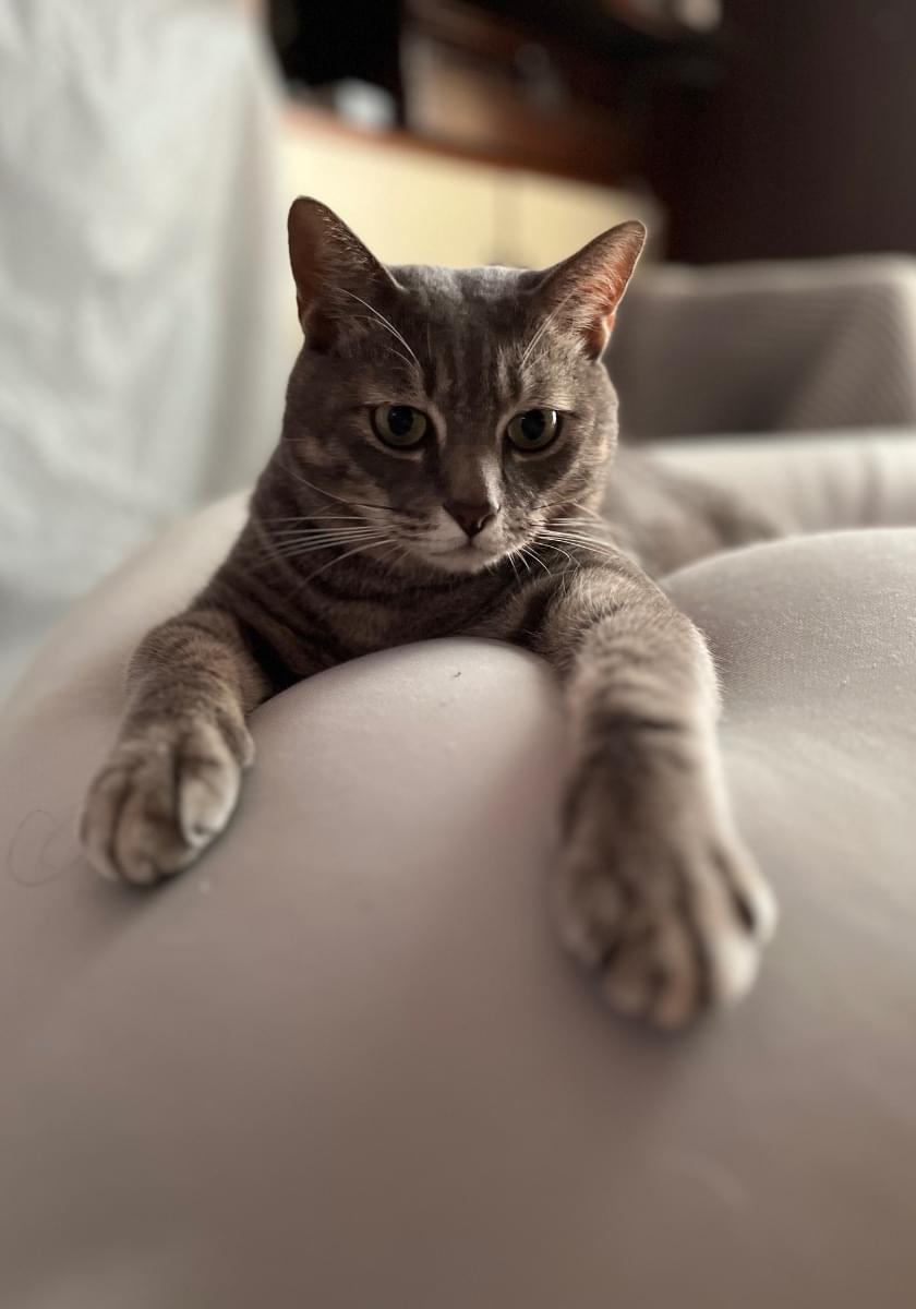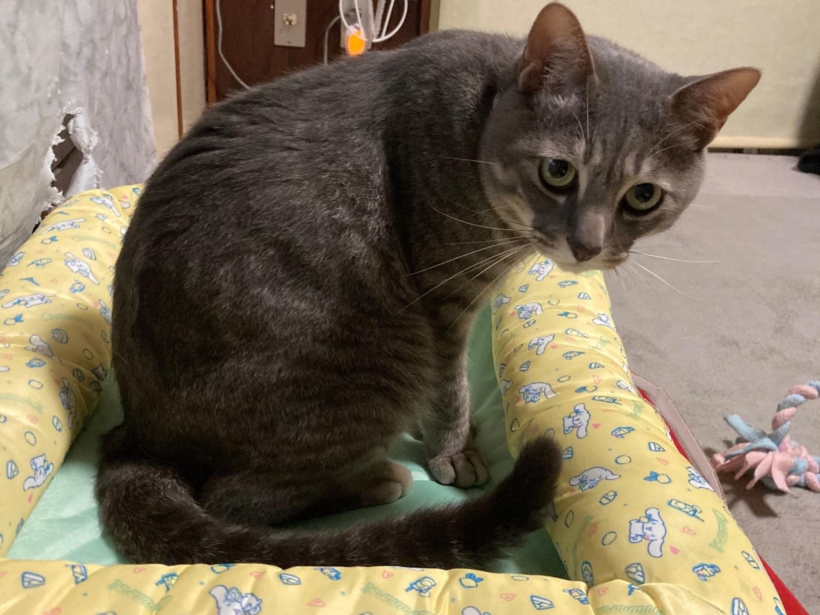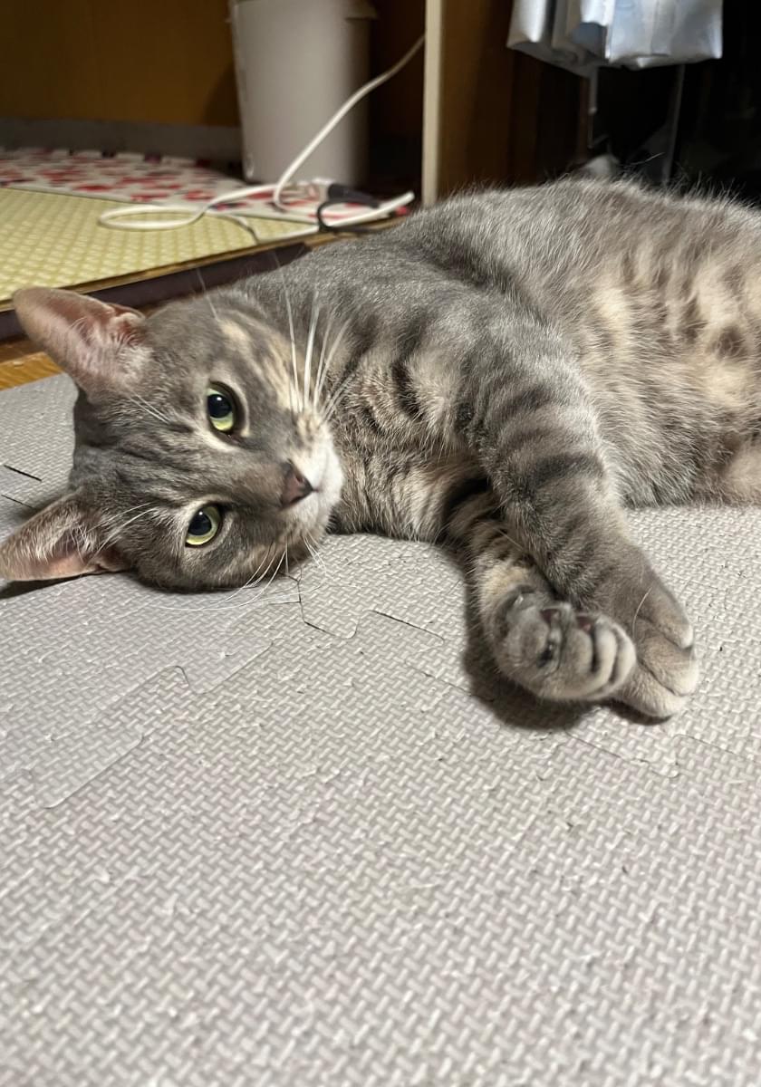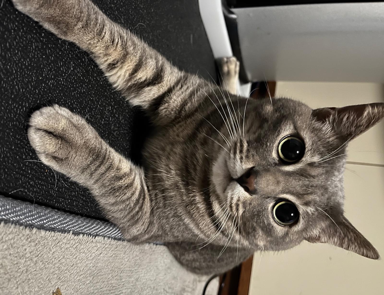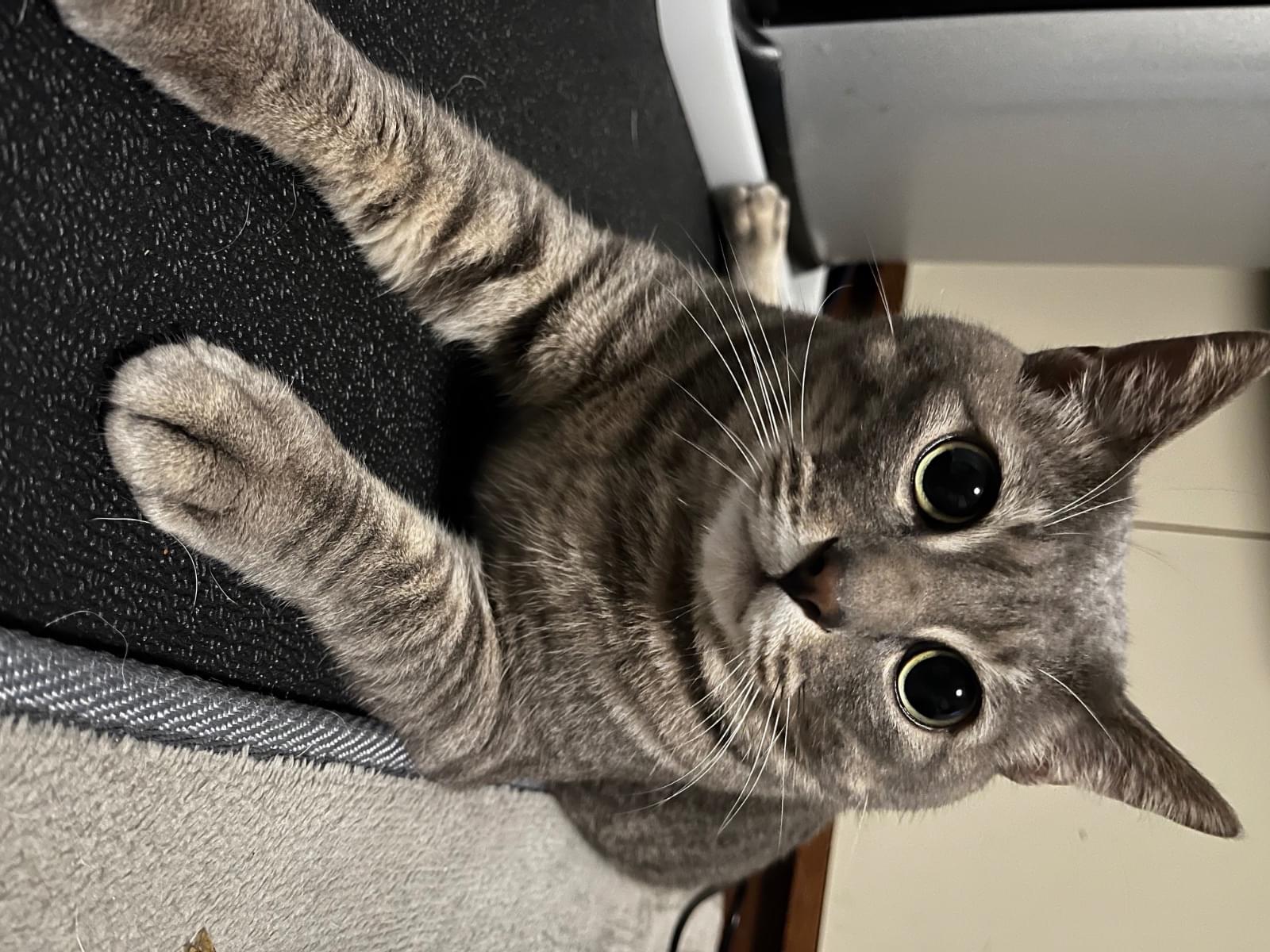 サバトラで目が少しタレ目、手が大きく尻尾がまっすぐで長めです。