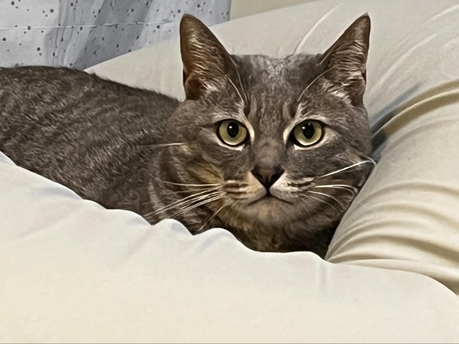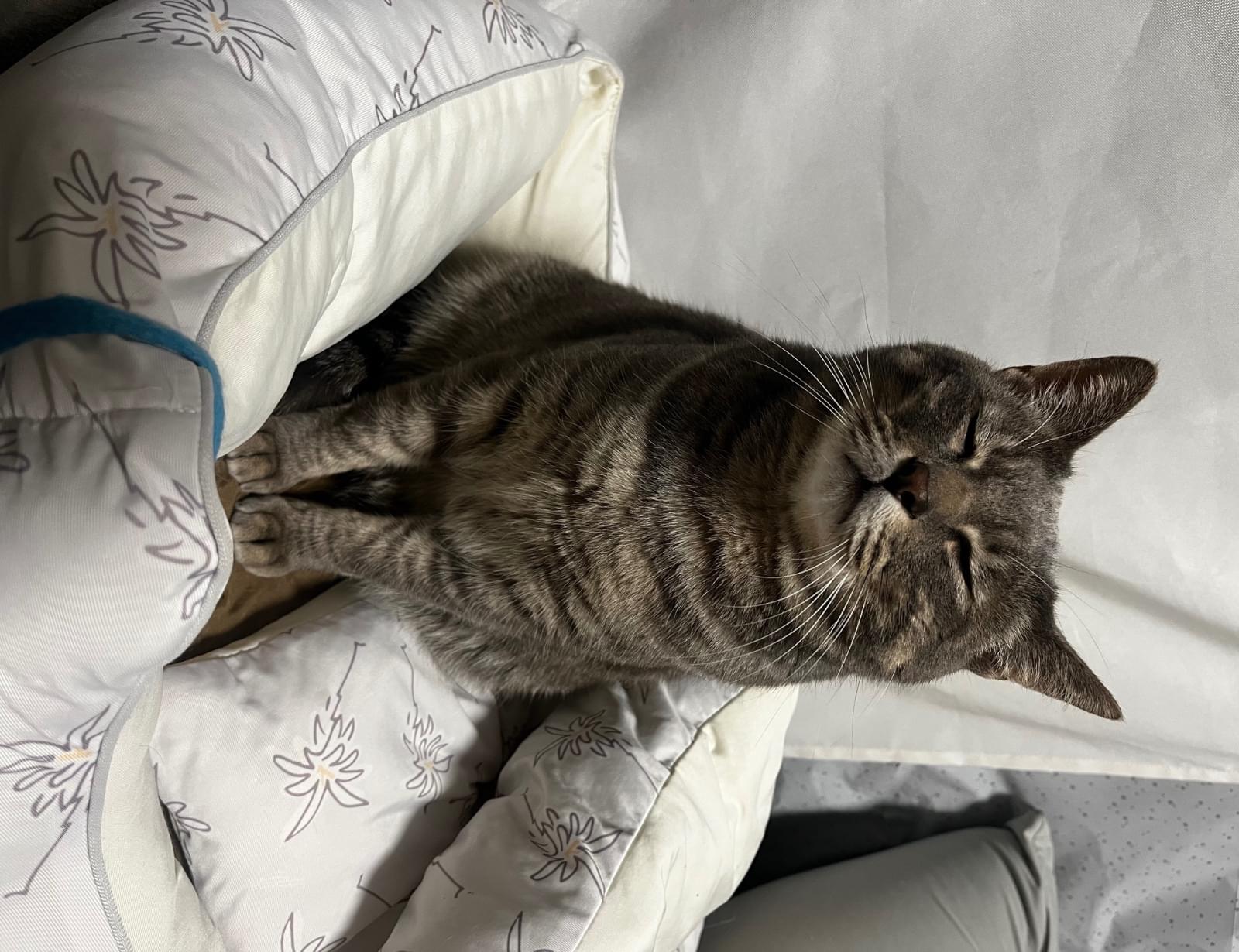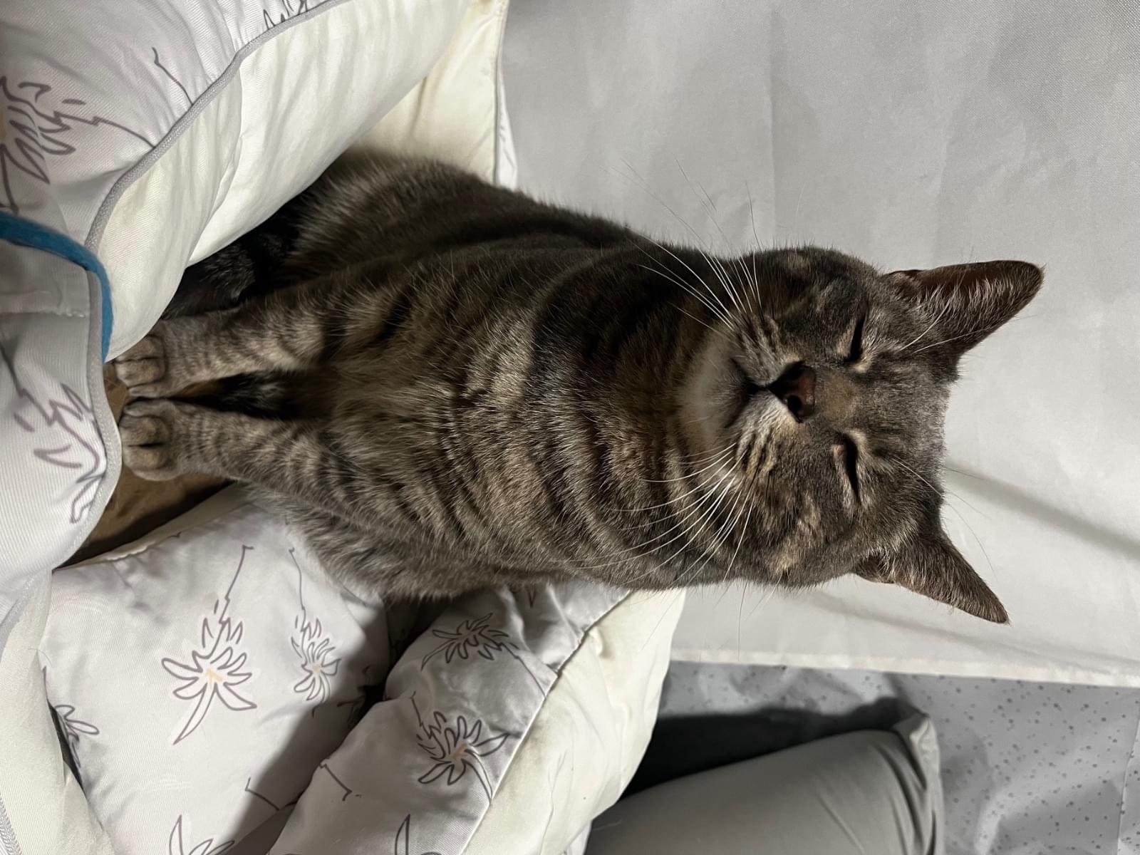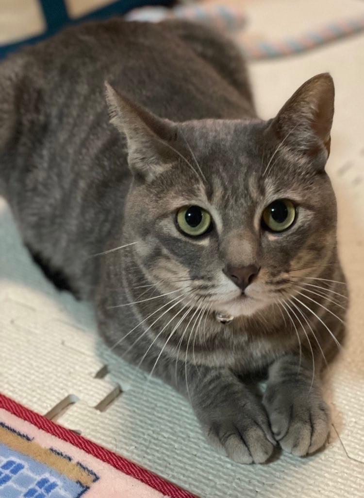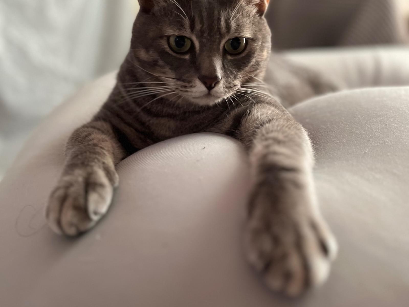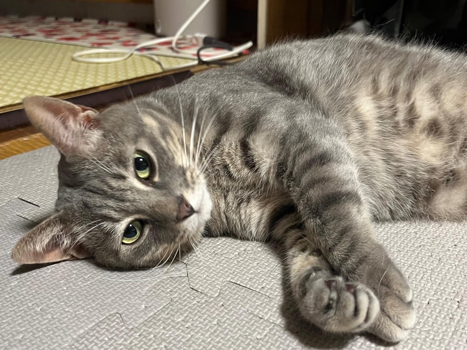 サバトラで目が少しタレ目、手が大きく尻尾がまっすぐで長めです。