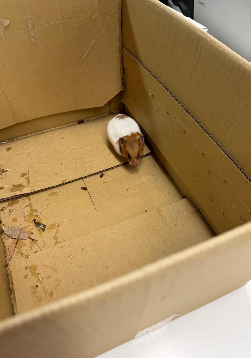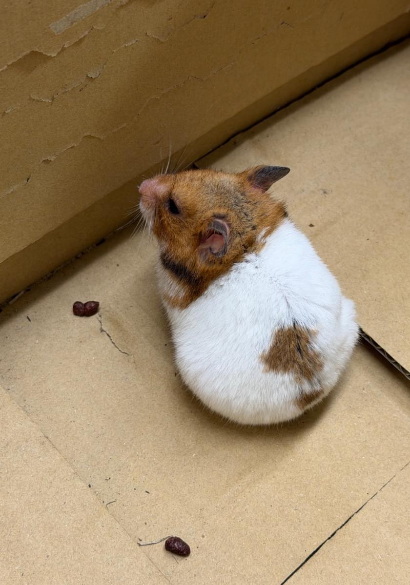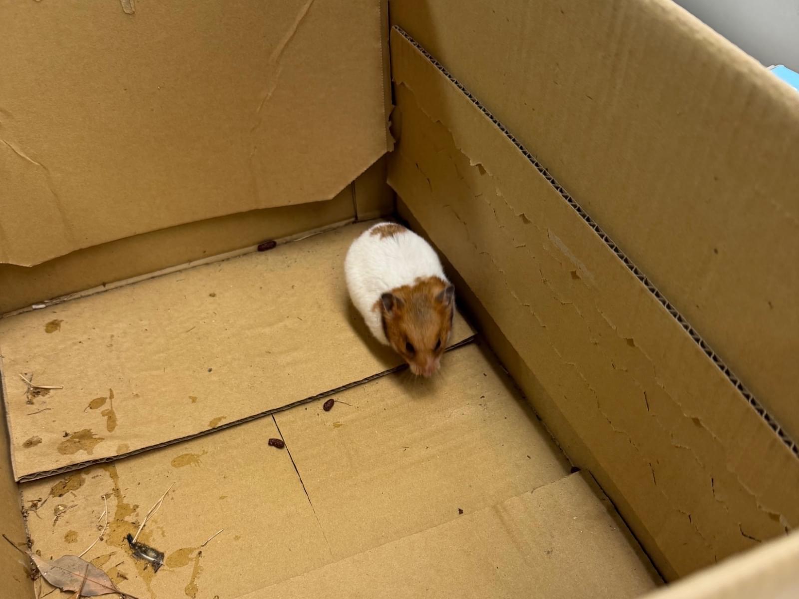 3/23(月)19:30頃、ノーマルのゴールデンハムスターを公園の隅で捕まえました。元気に動いており、痩せていません。おそらく大人で、毛並みもきれいで、段ボールに入れたらすぐうんちをしたので、脱走して間もないと思います。