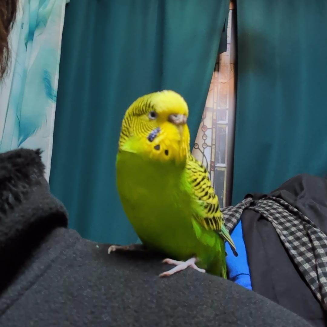 かなり 人馴れしています。なまえは まだ覚えてくれてない状態。元々 他人の駐車場で保護したインコです。尻尾が 青から 黒に変わり始めてます。ケーキや ご飯つぶも たべたがらます。