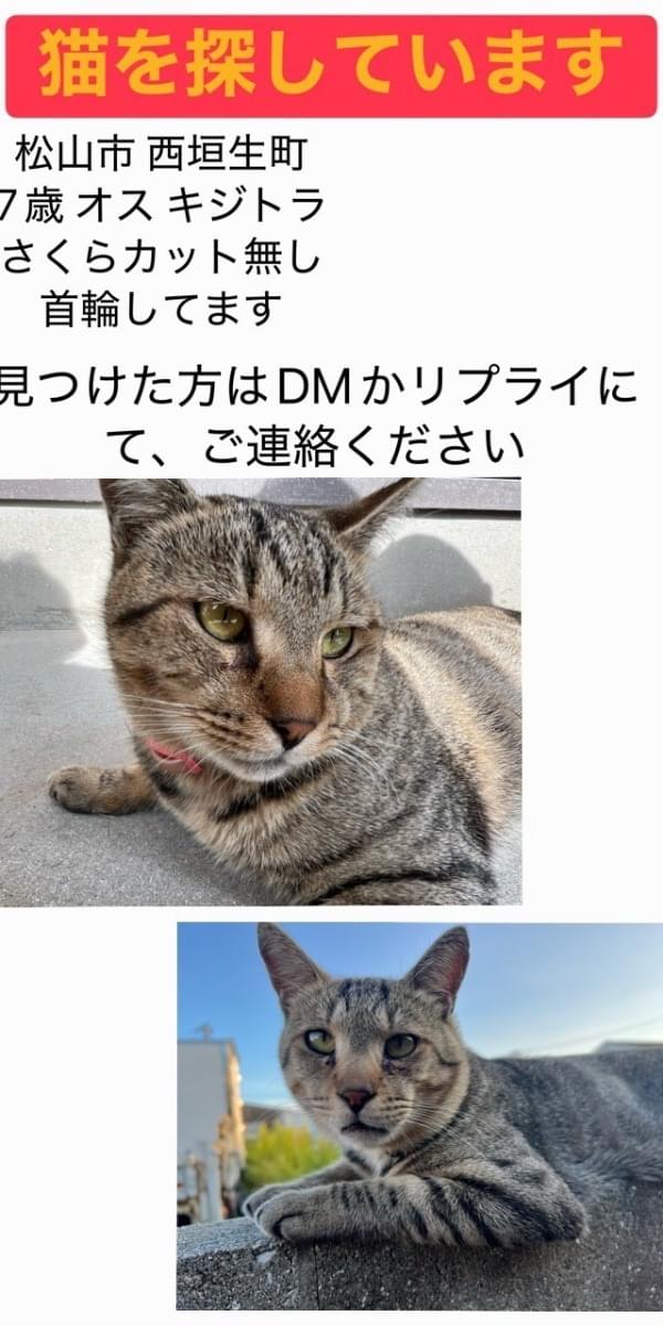 ホーム迷子猫愛媛県中肉のキジネコです。…中肉のキジネコです。去勢はしておらず。人懐こいです管理復旧するこの案件は、掲載が終了しました。情報用件迷子名前会長場所愛媛県 松山市西垣生町発生日時2026年3月21日(土)終了日時2026年3月27日(金)飼い主ニャフ報告お世話になります!暖かい言葉と遭わせて保護していただきました!お陰で無事に帰ってきました!本当にありがとうございます!!
