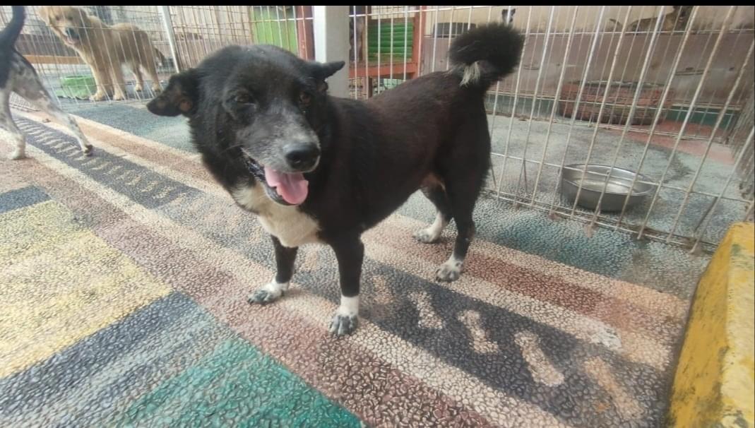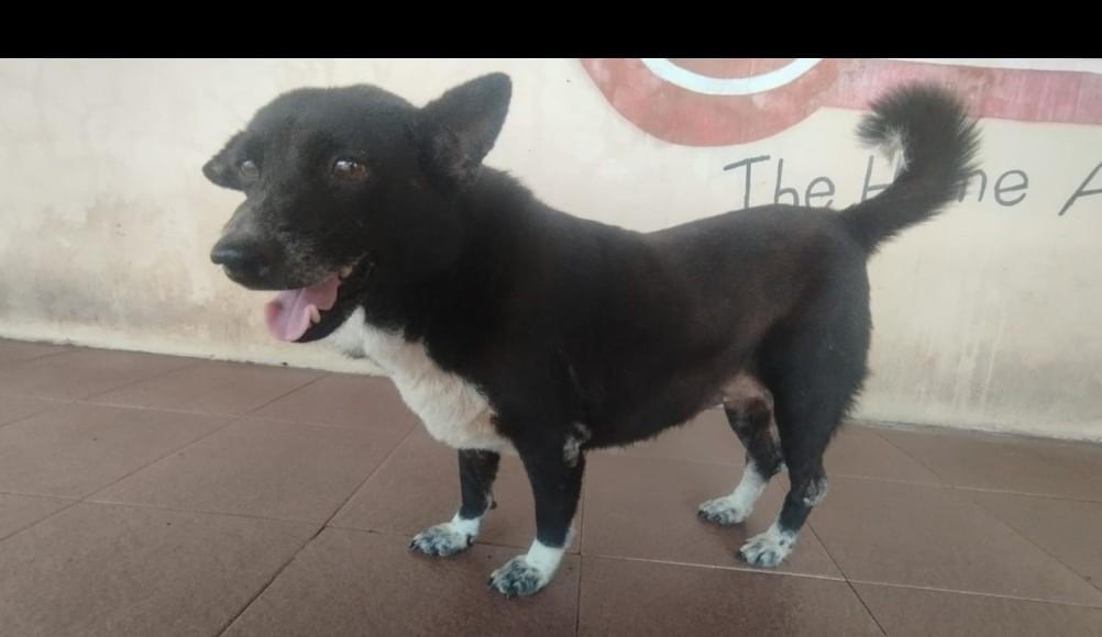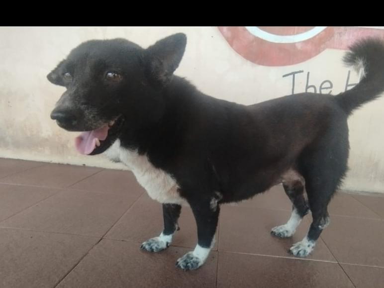 全体的に黒い脚先、しっぽ先、お腹の白い雑種犬