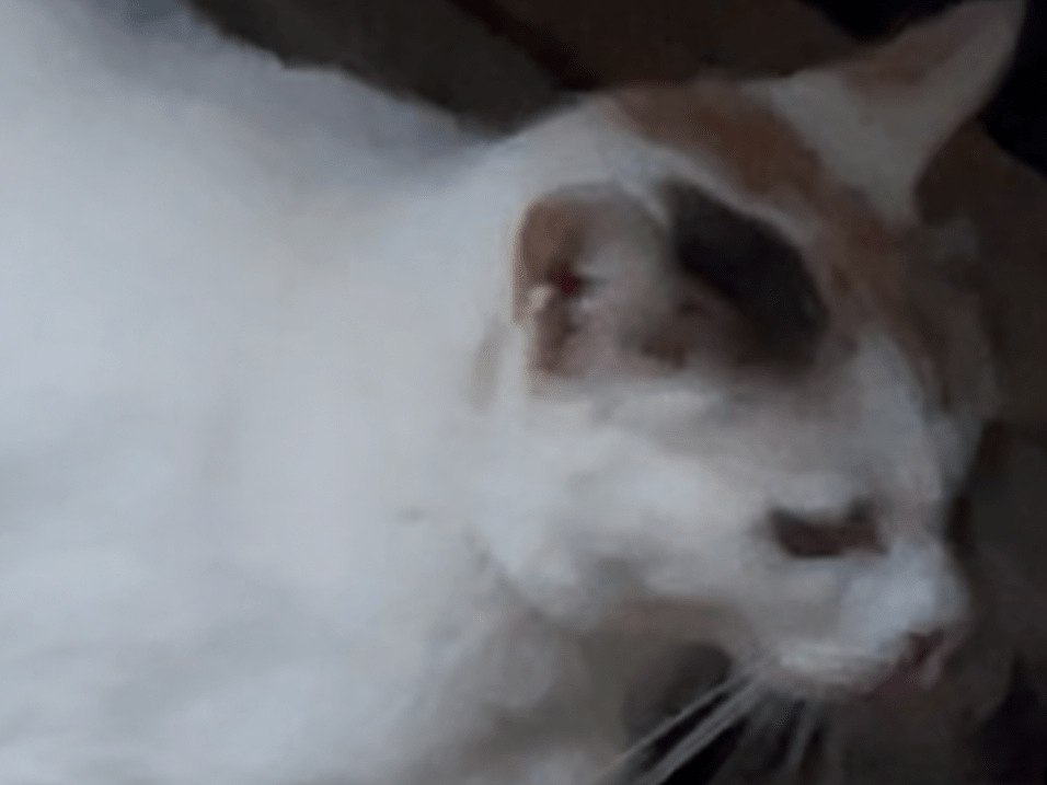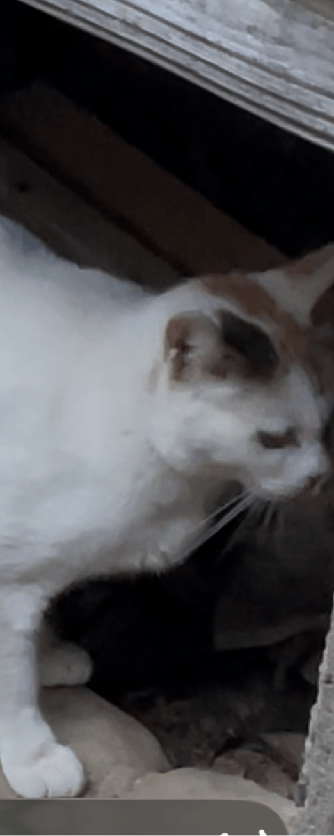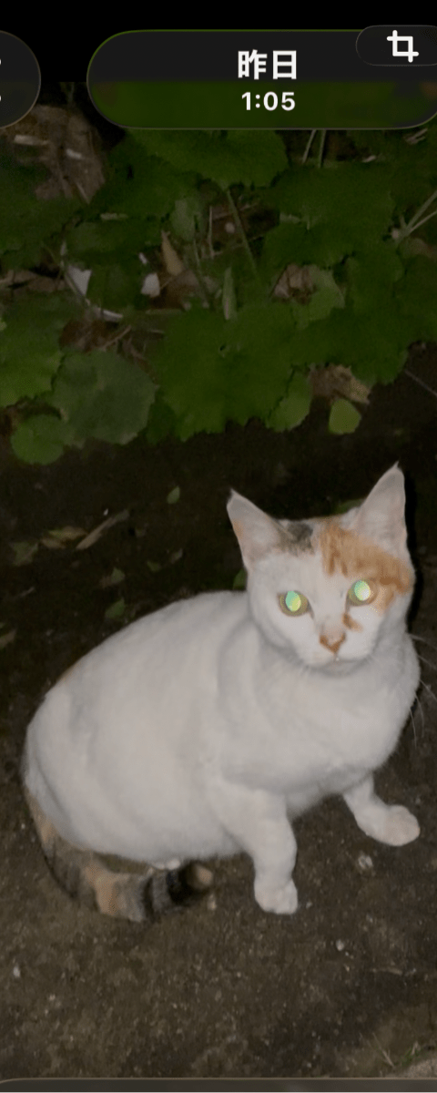 とても綺麗な真っ白に頭と尻尾は、三毛色。逃げるけど、声をかけると振り向きます。体は大きく、目が大きくて、光加減でオッドアイにもみえるような。