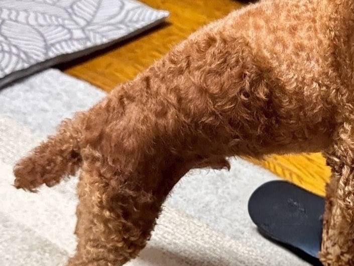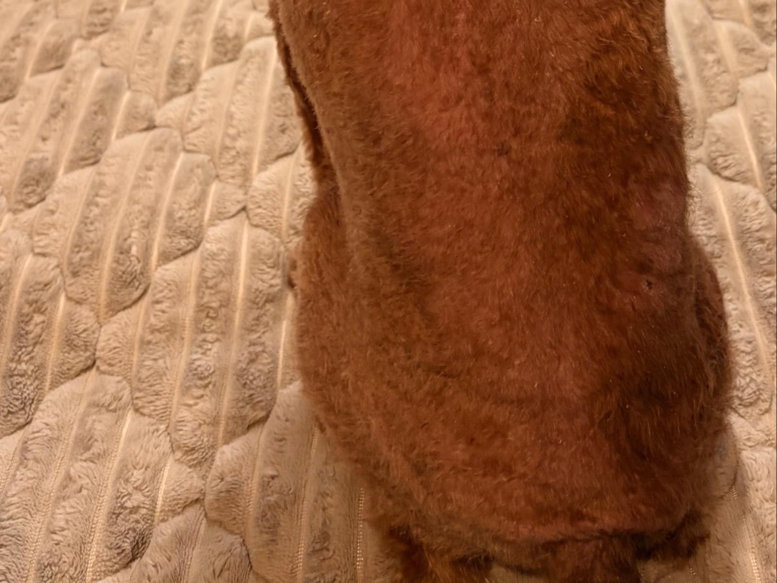右脚周辺からお腹にかけて、毛を抜くクセがあり、毛の色が違う.赤みがあり毛が抜けている可能性があります。お腹は黒いシミが多数あります。