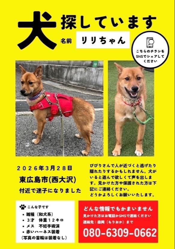 【広島県東広島市】赤いハーネス⚠️茶色犬迷子⚠️