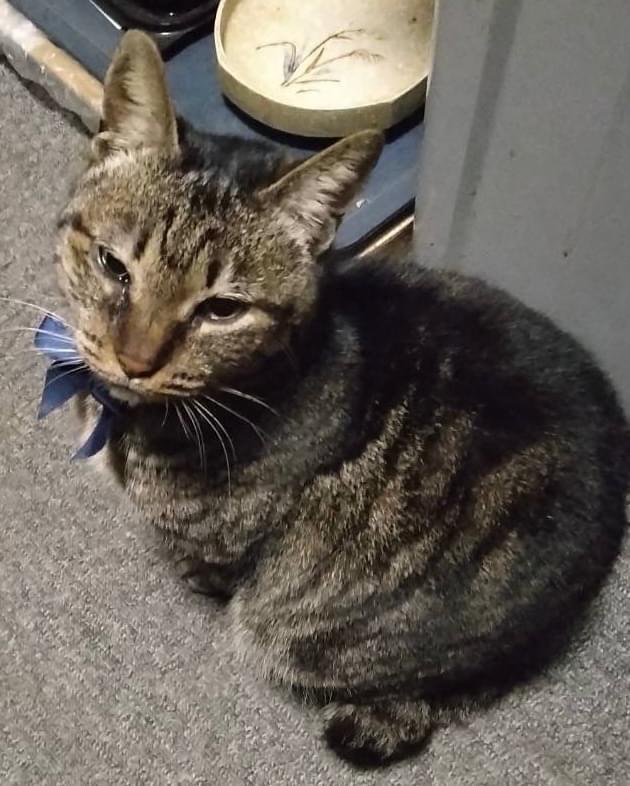 青いリボンを付けたキジトラの猫を探しています