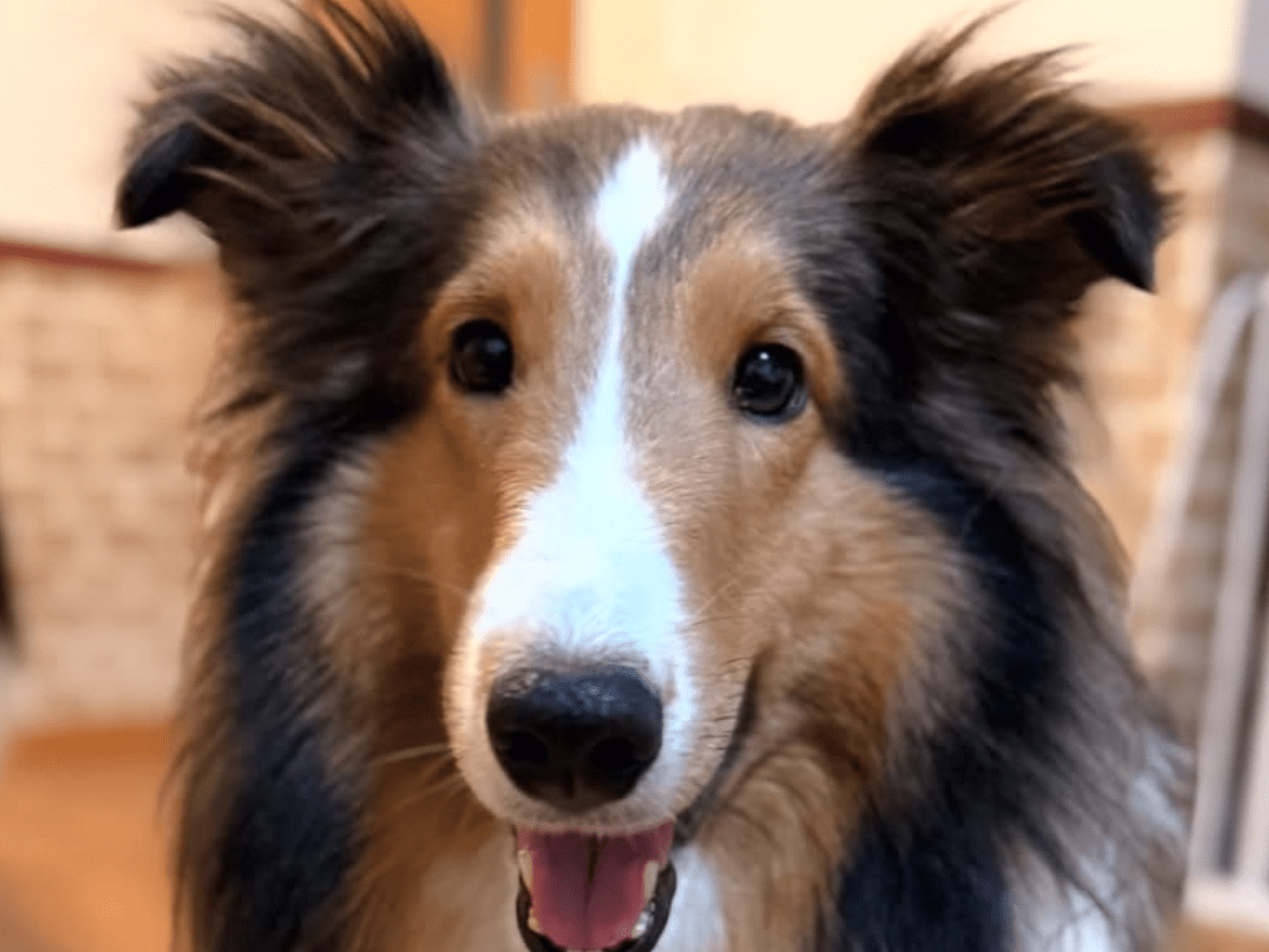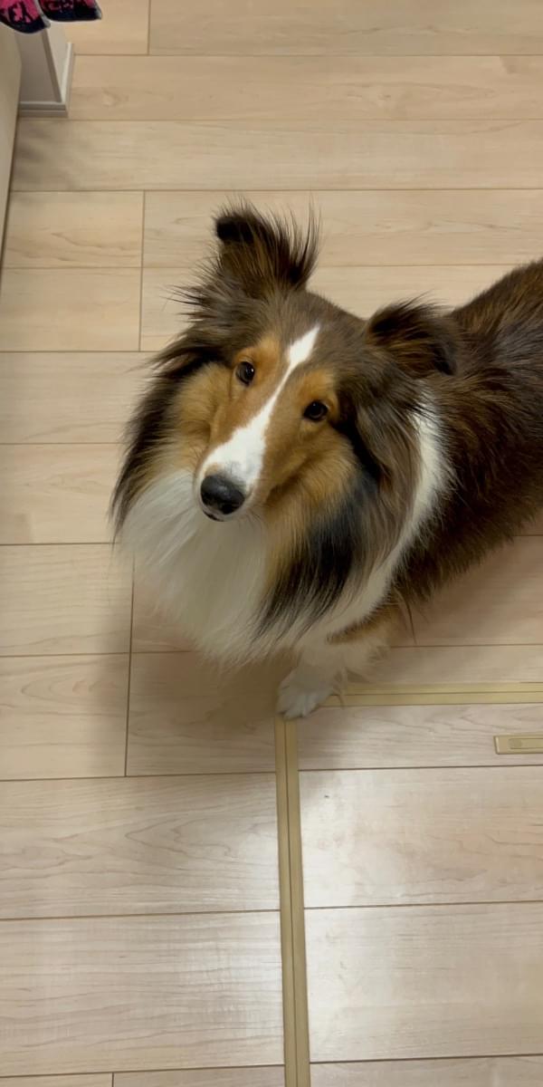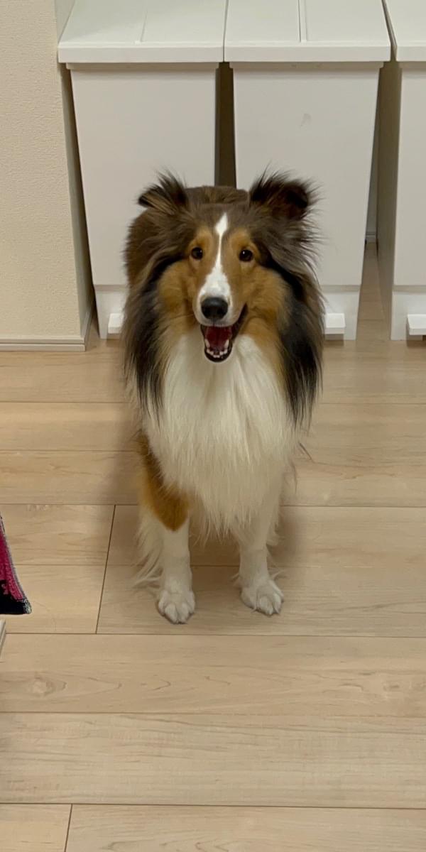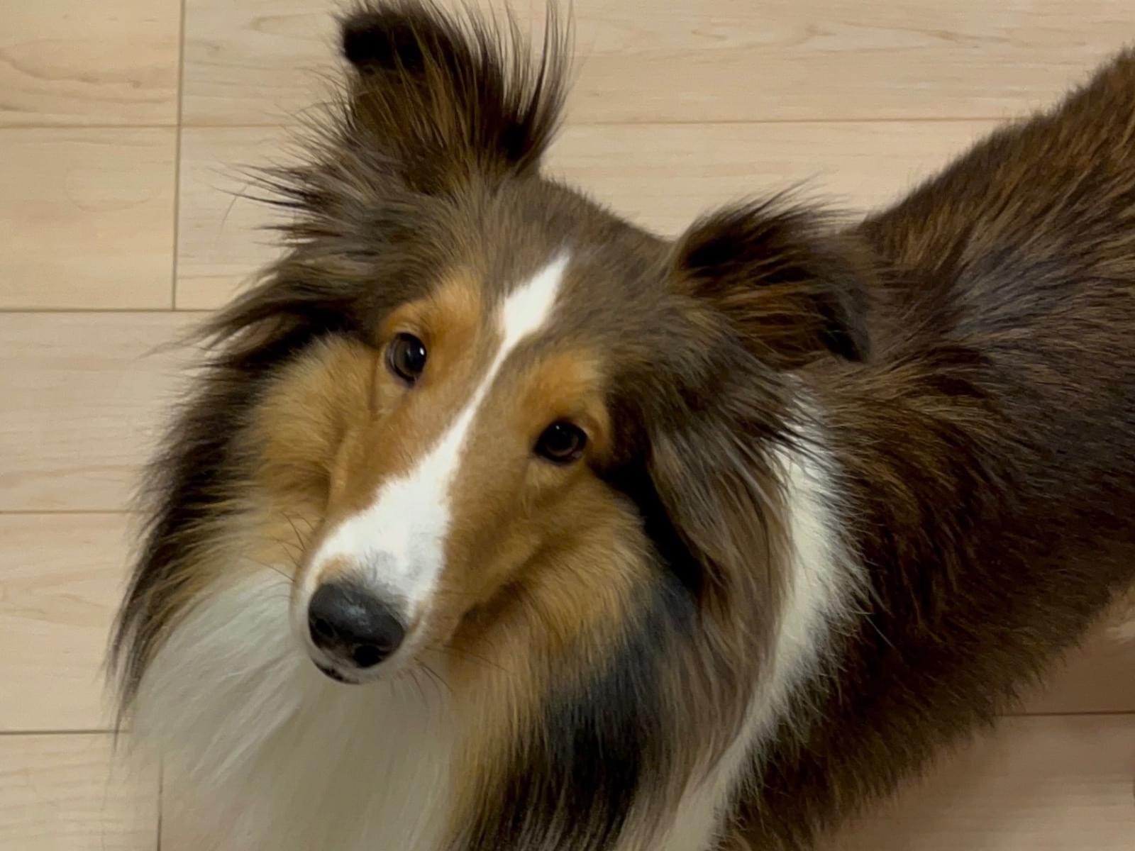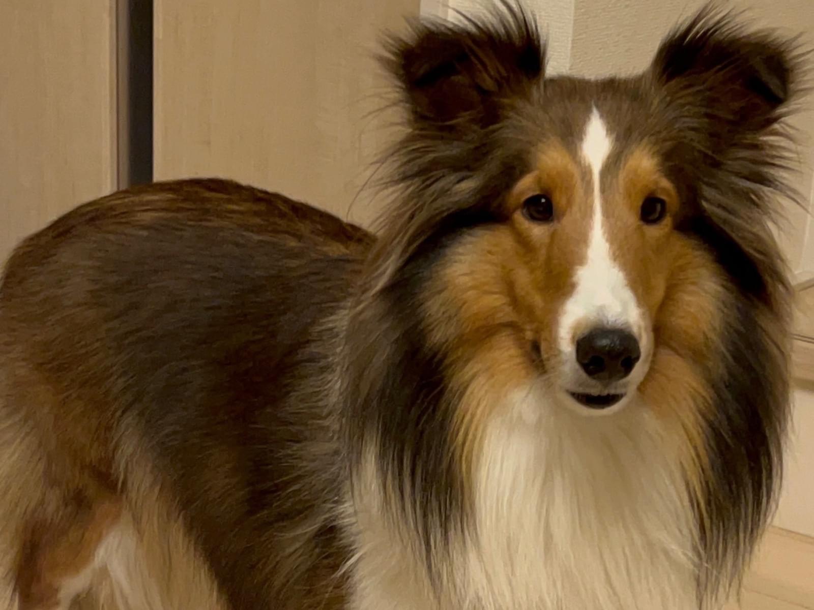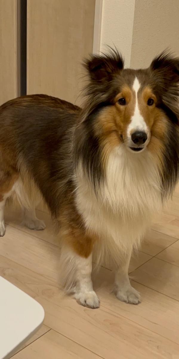 垂れ耳で茶色と首周りが白いシェルティーです。
