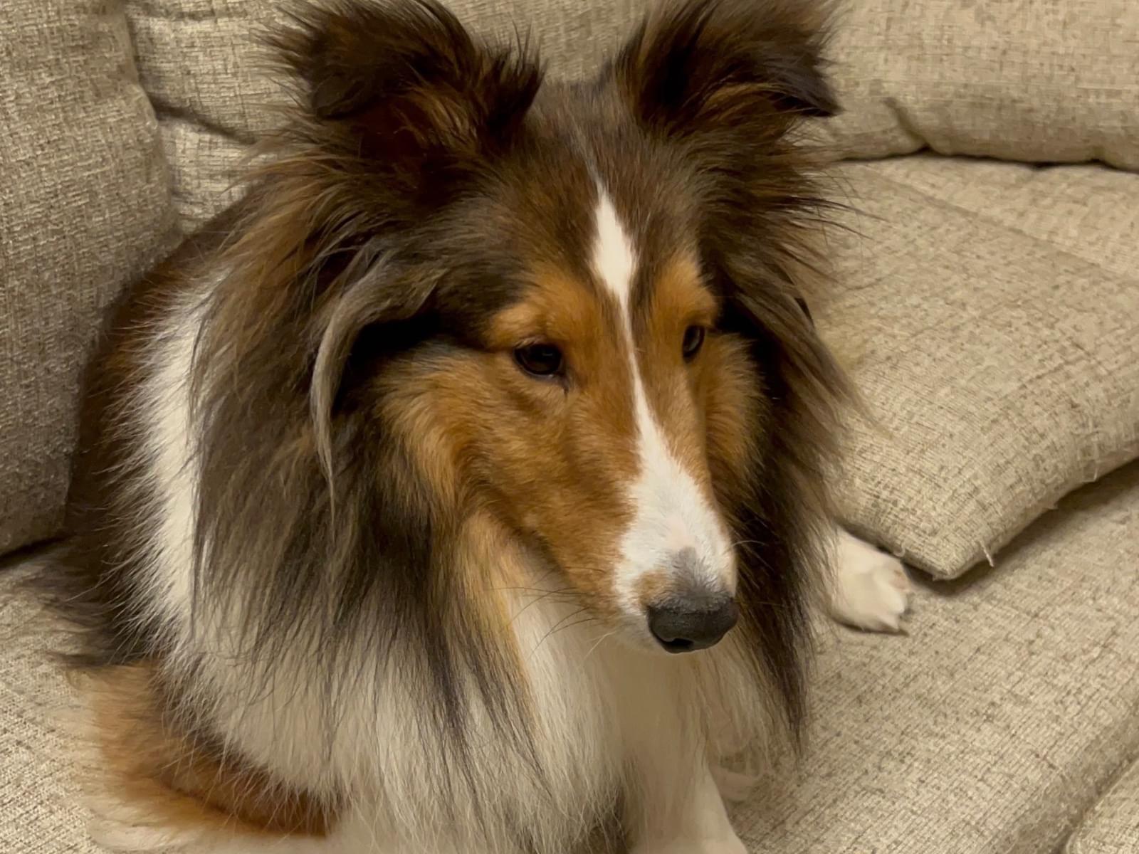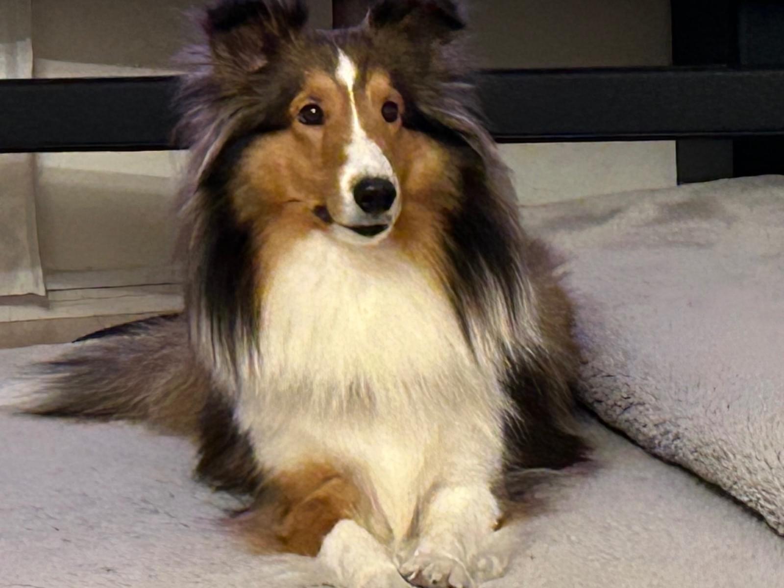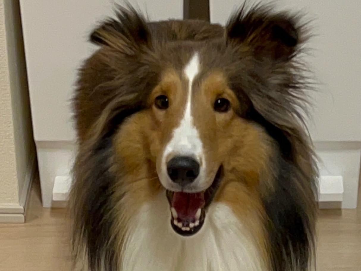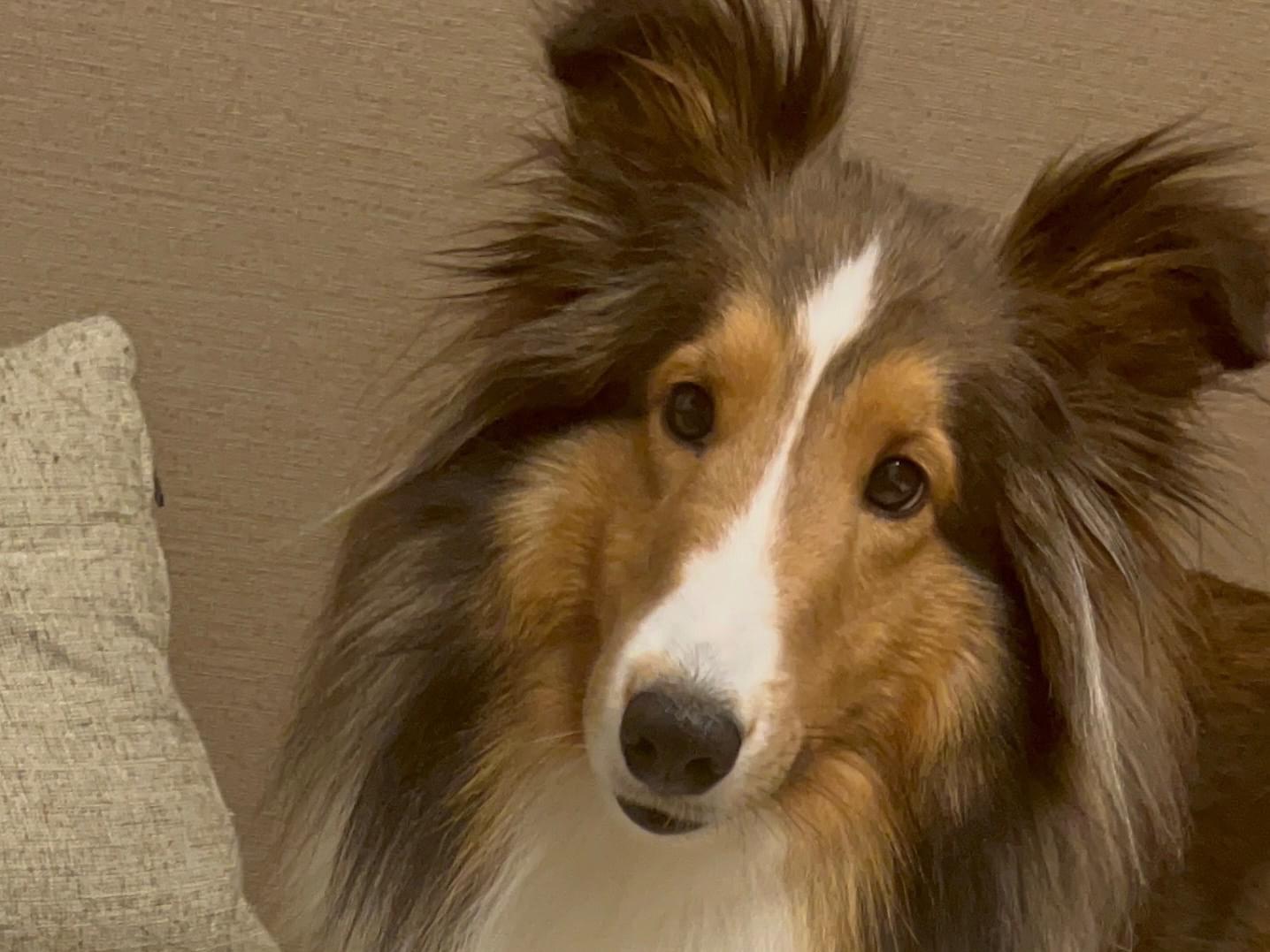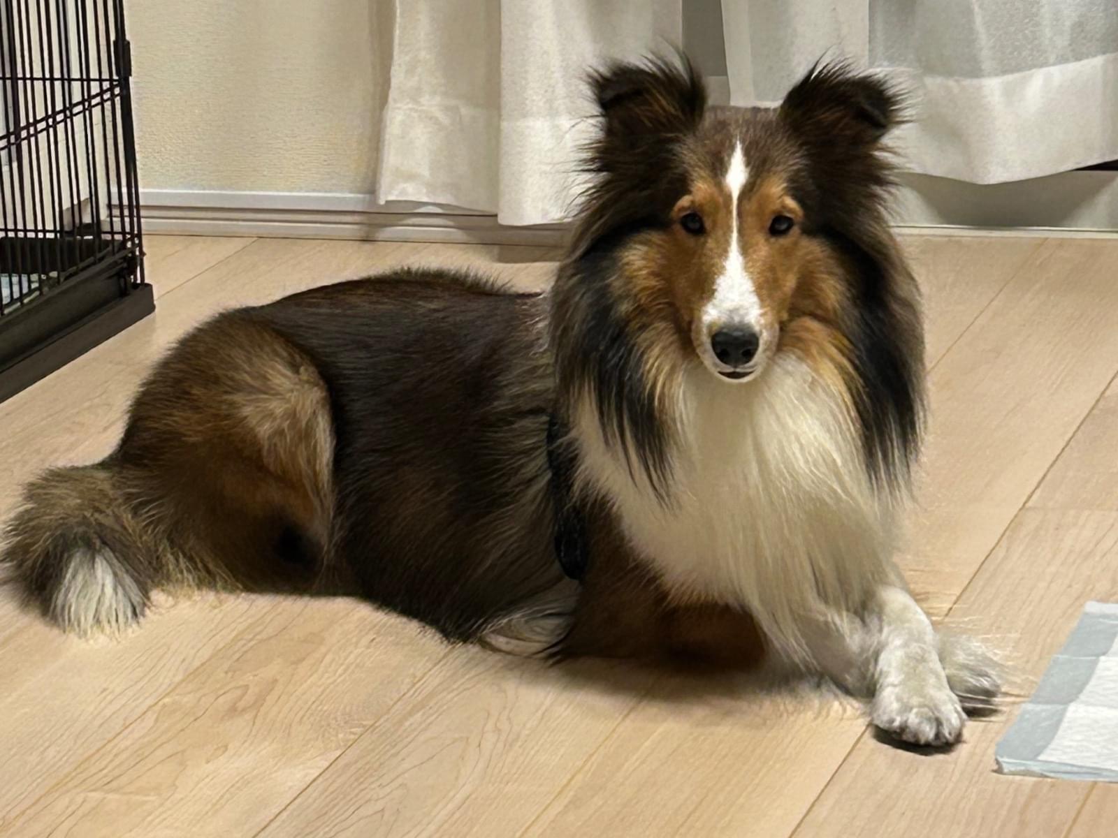 垂れ耳で茶色と首周りが白いシェルティーです。