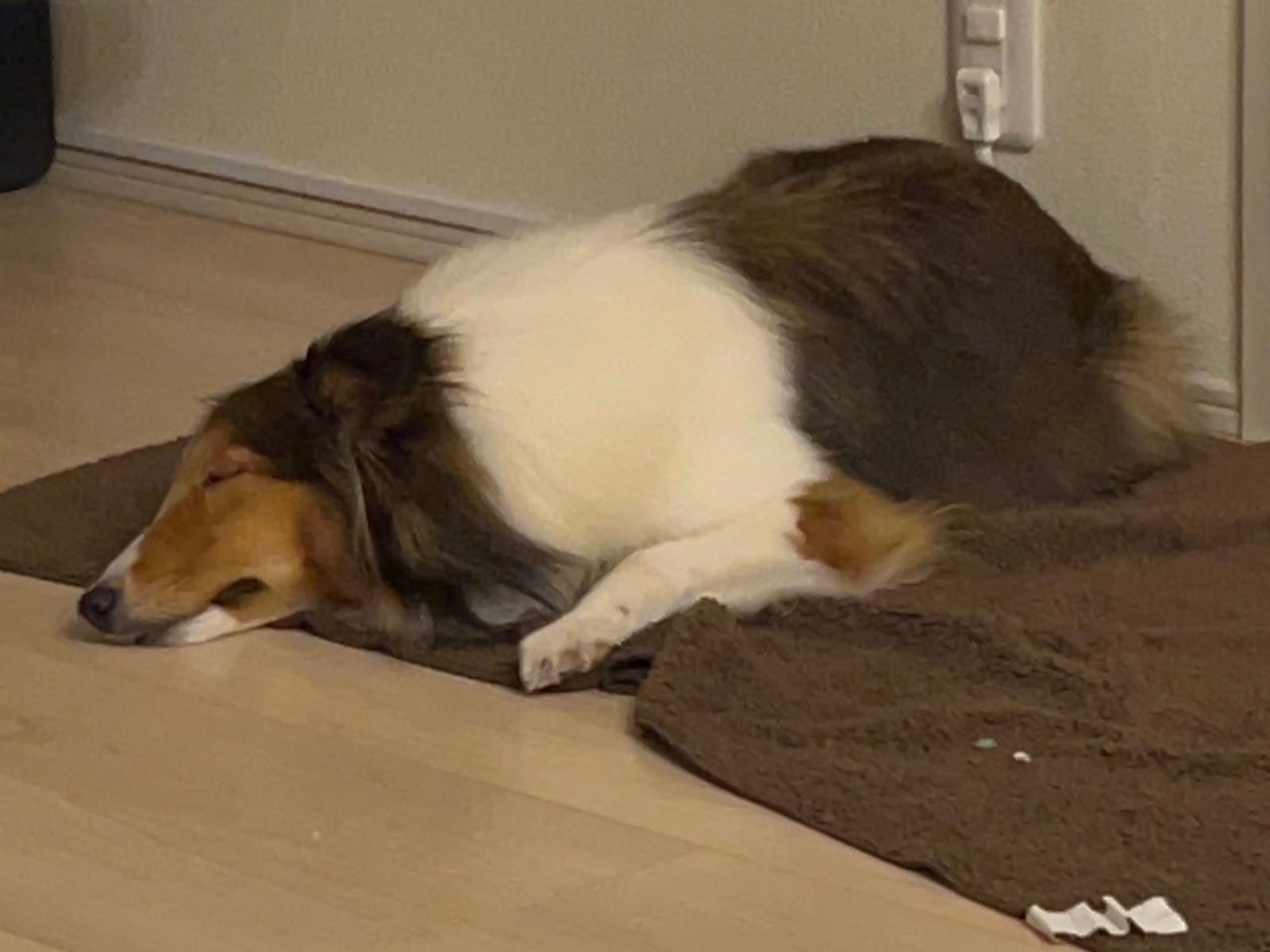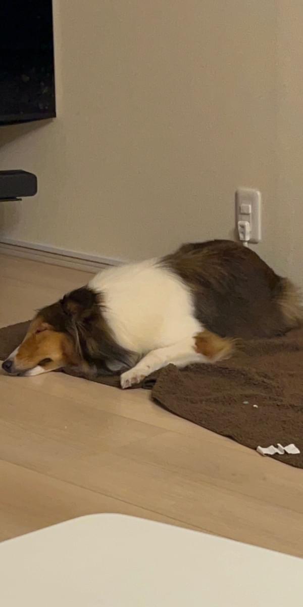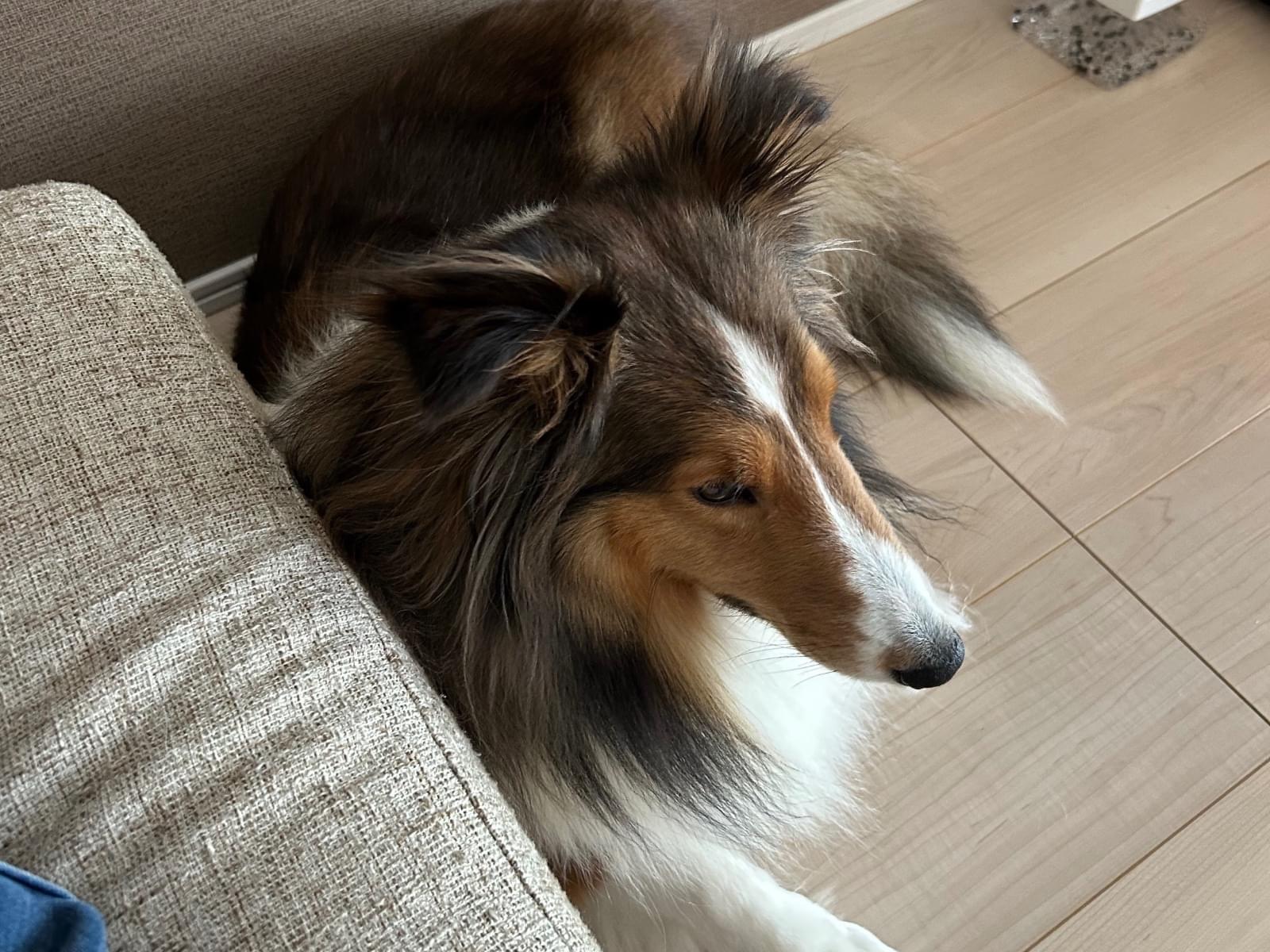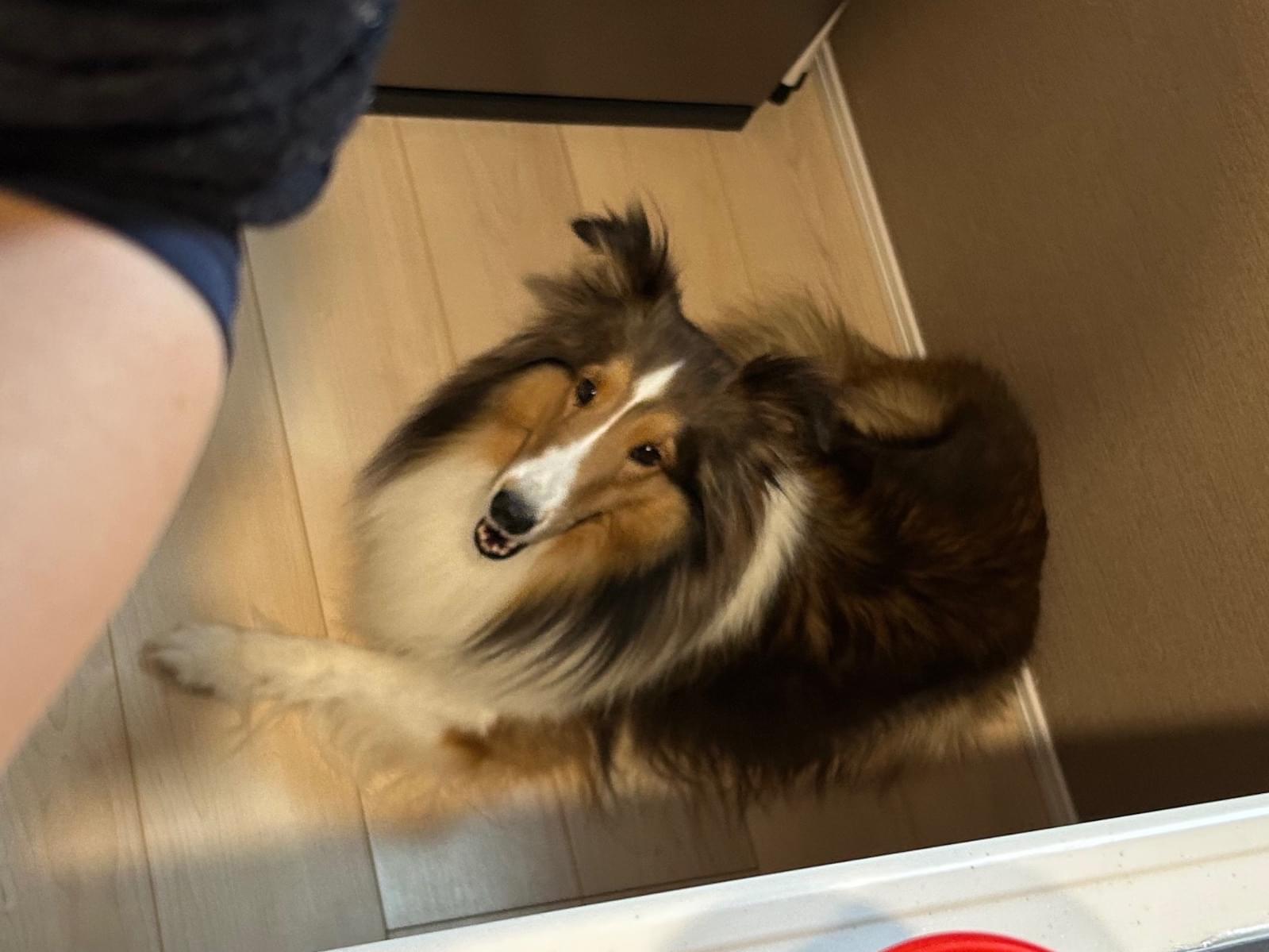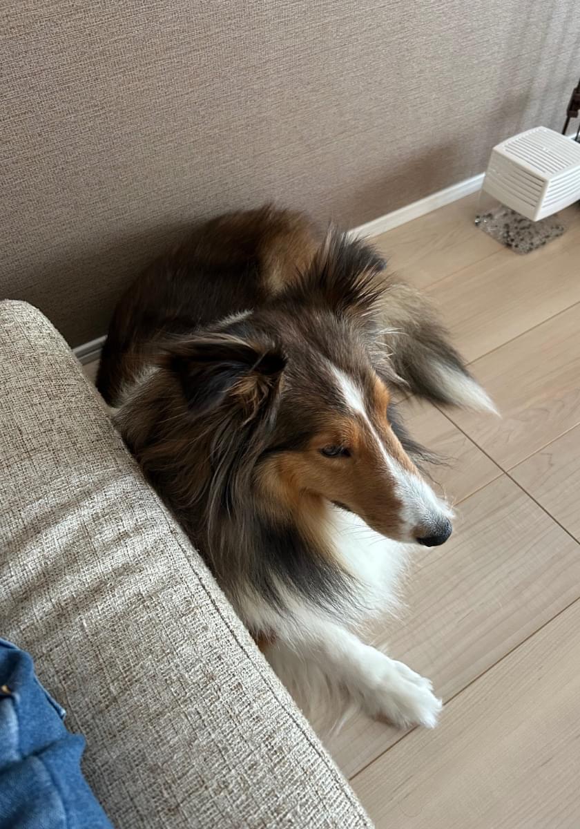 垂れ耳で茶色と首周りが白いシェルティーです。