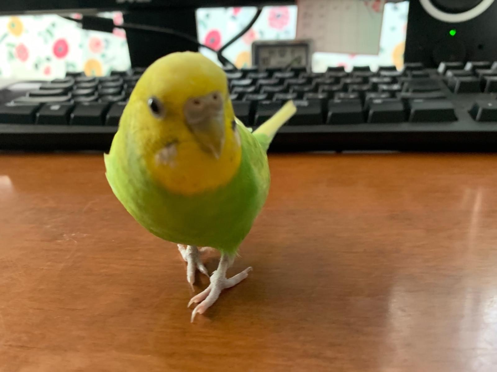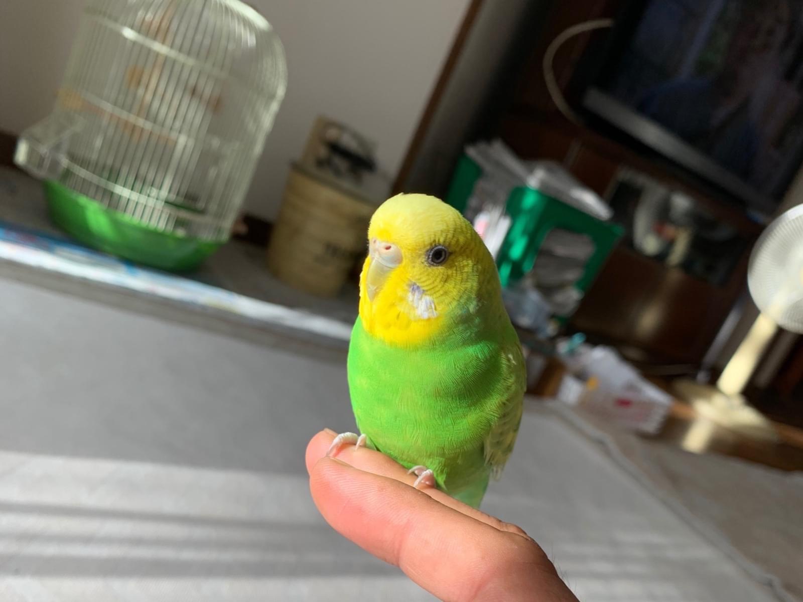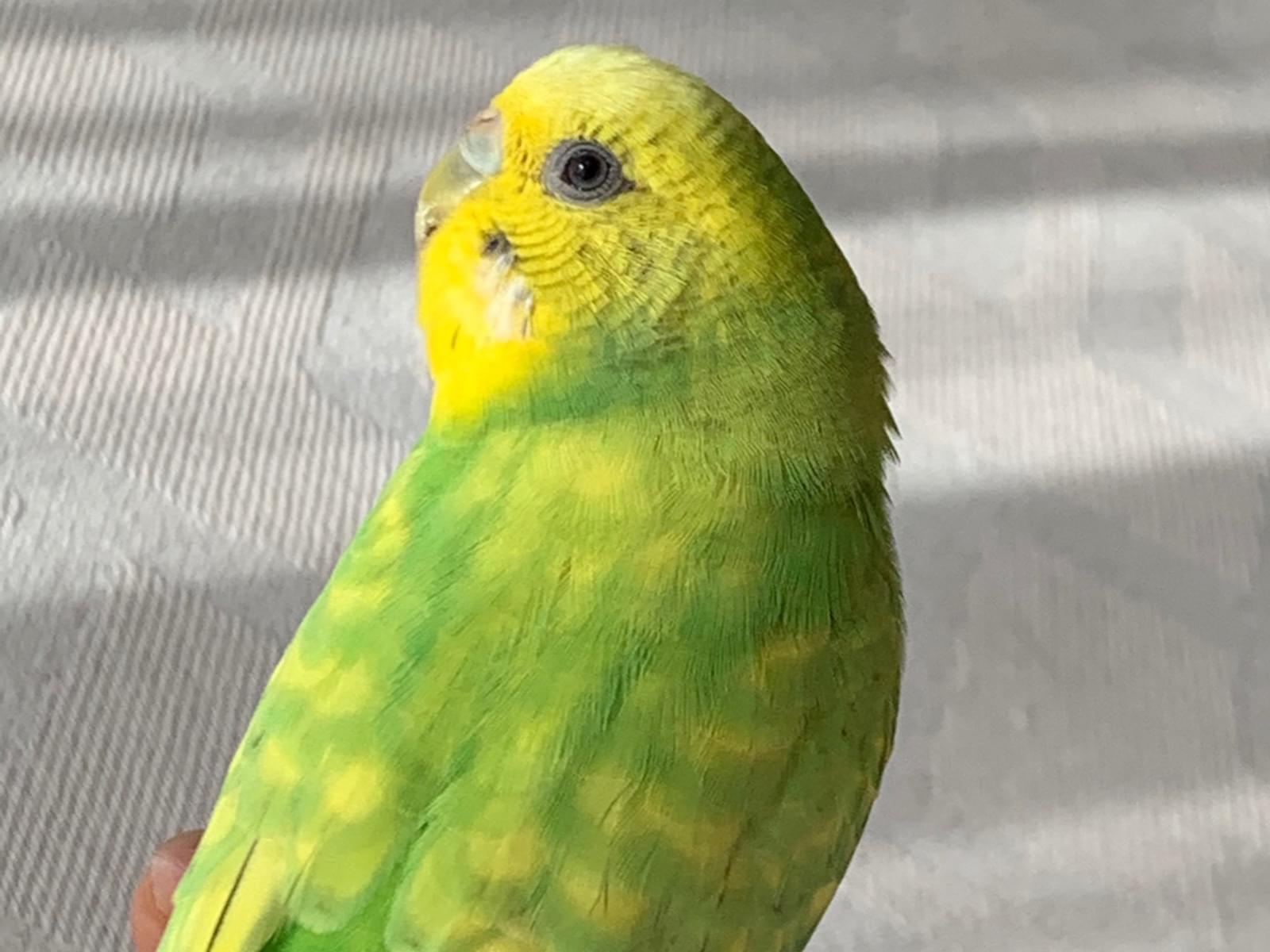 黄色と緑の混ざった色のセキセイインコ、生後7ヶ月、名前はキキと言います。人懐っこいので、手や肩や頭に乗ったりします。泣き声は一般的なインコと同じような泣き声です。