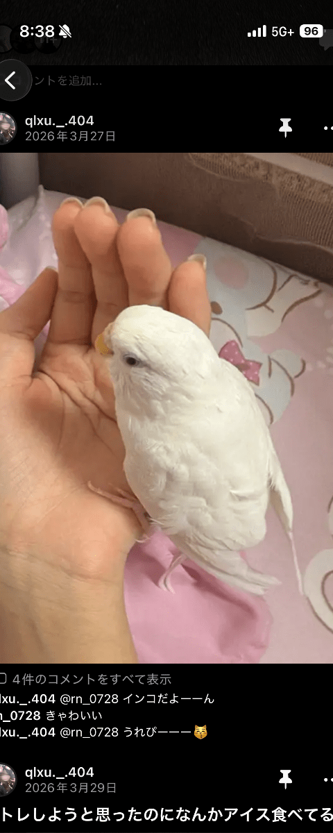 ホーム迷子鳥東京都全身白くて赤目のイン…全身白くて赤目のインコを探しています管理編集するポスター掲載終了最終更新日時:2026/04/01 22:29写真情報用件迷子名前ぴの性別メス年齢5歳場所東京都 渋谷区恵比寿発生日時2026年3月31日(火)飼い主すい説明全身白くて赤目のインコを探しています。 臆病だし着地が下手なので地上で隠れてる可能性が高いです。連絡先URLsui00827@icloud.com掲示板情報交換のための掲示板です。ユーザーからの情報提供、オーナーからの連絡などにご利用下さいませ。コメントを書き込む東京都ではnikita返信0件2026/04/01 16:26