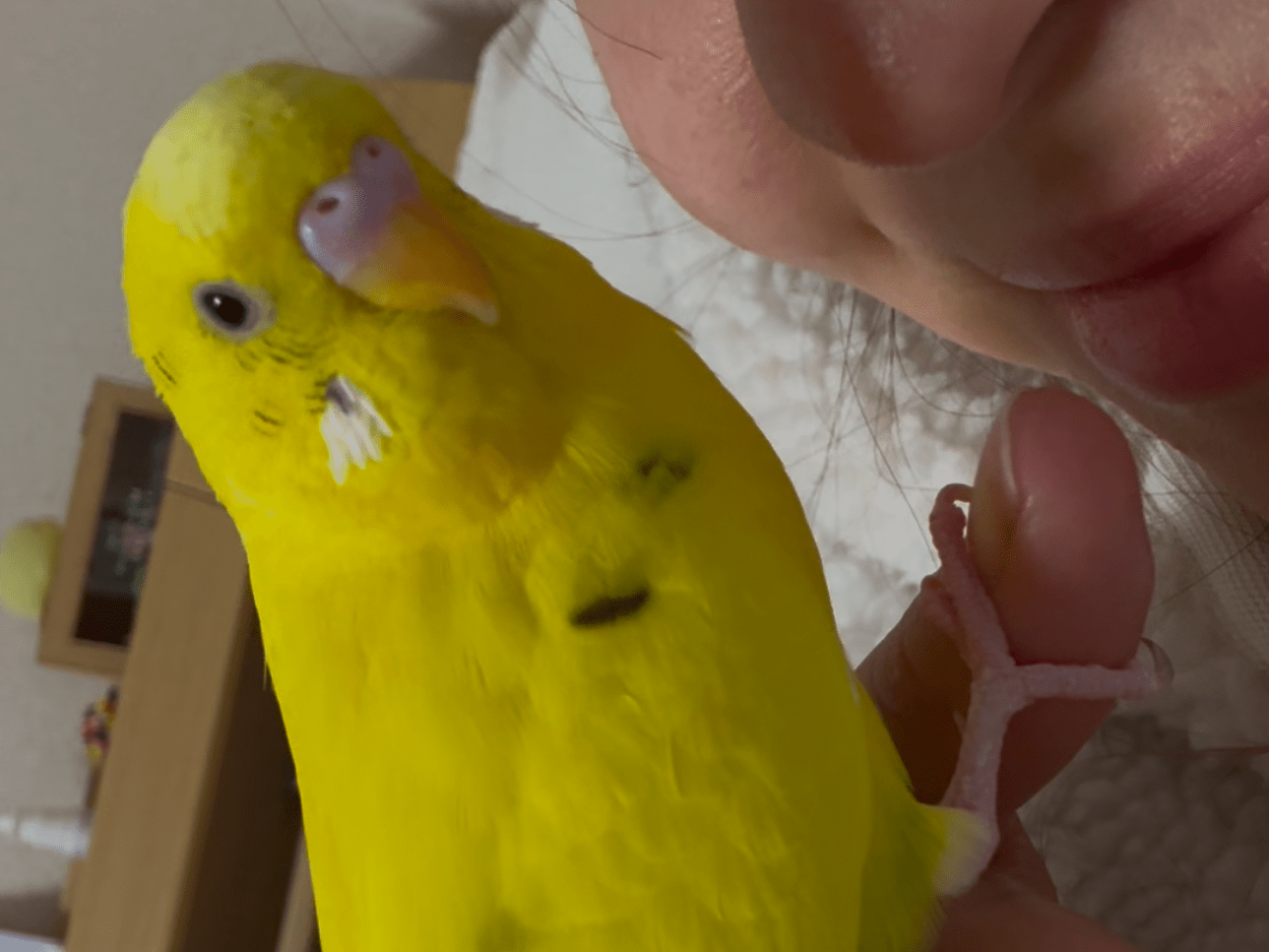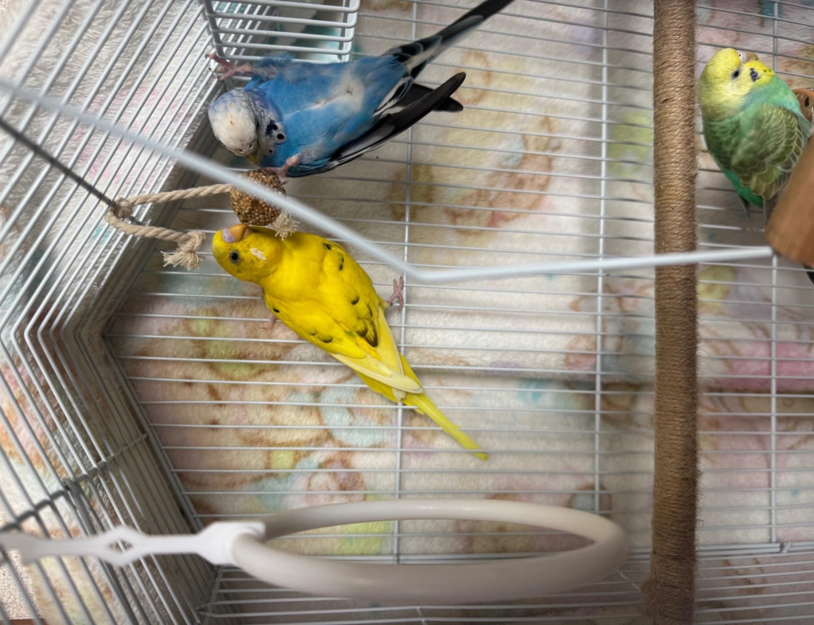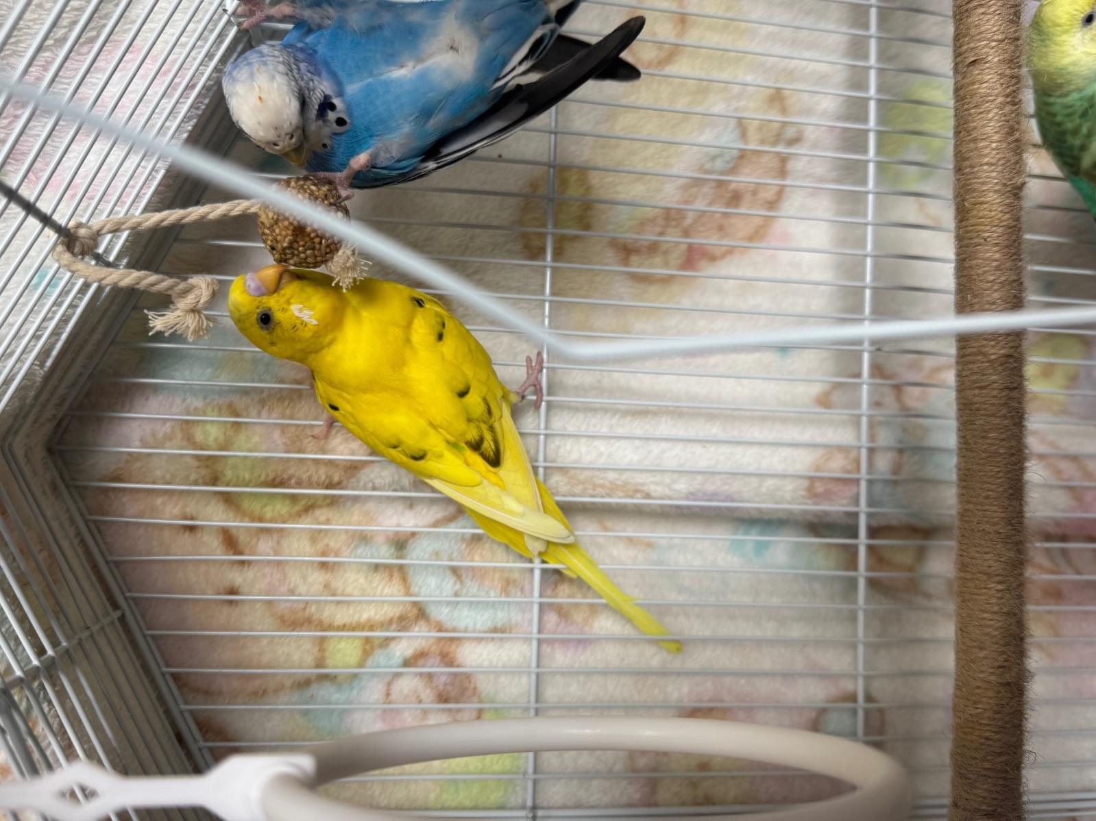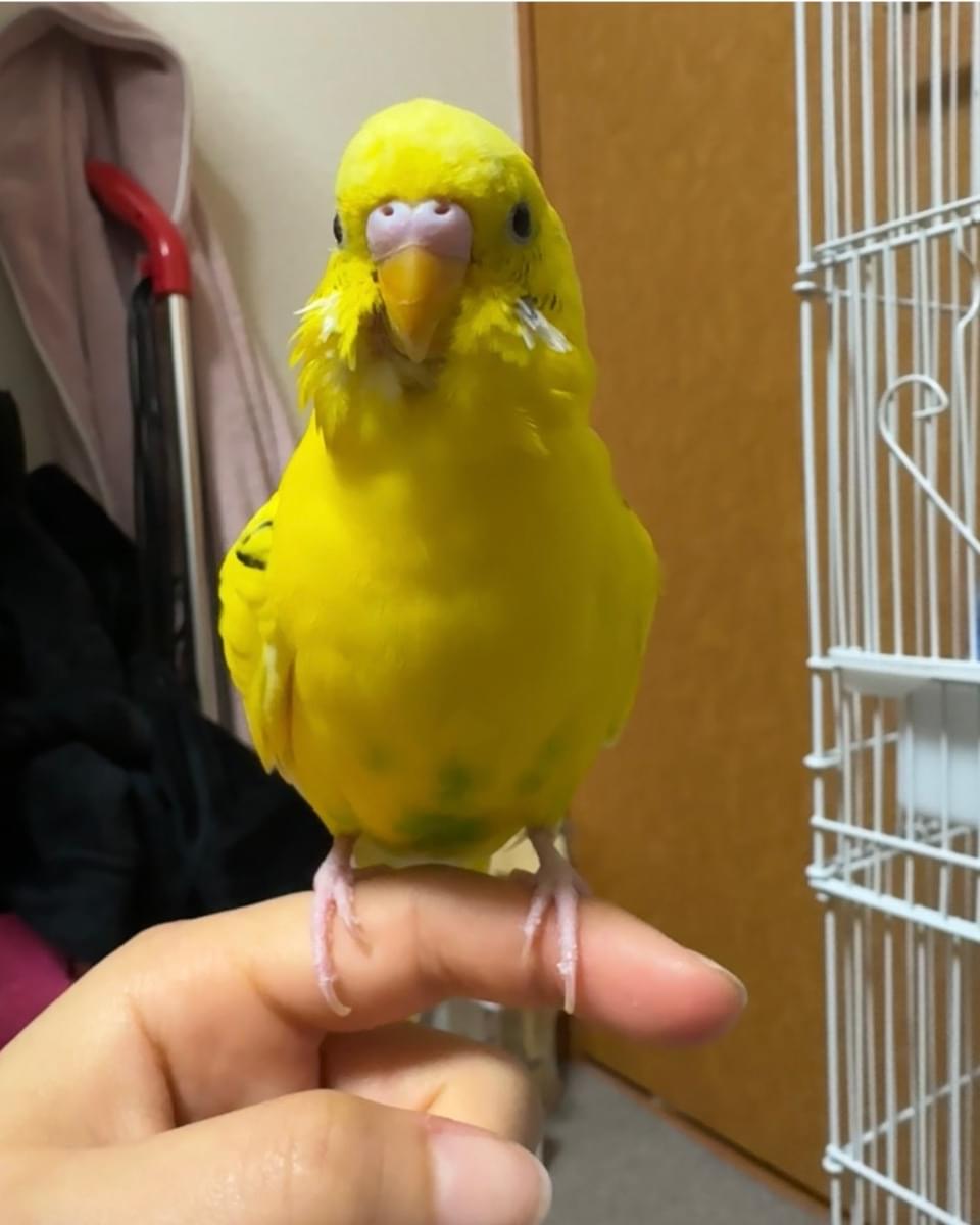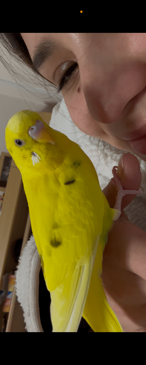 お腹のところに緑色ついてる、すごい歌う。はなはピンク、尻尾のところもちょっと緑色ついてる