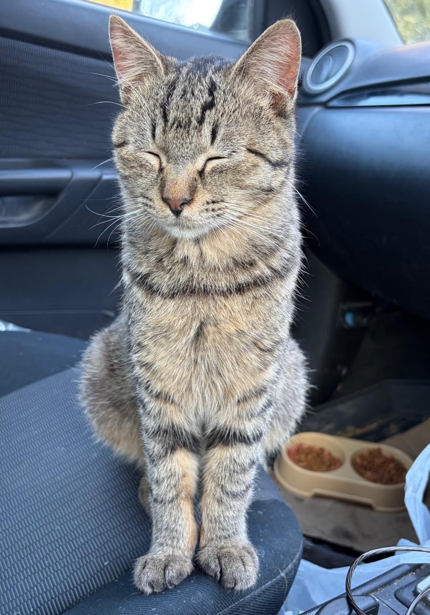 キジトラ、鳴き声はとても小さくご飯が欲しい時にかすかに泣くぐらいです。首輪などない。しっぽはストレート。去勢なし。