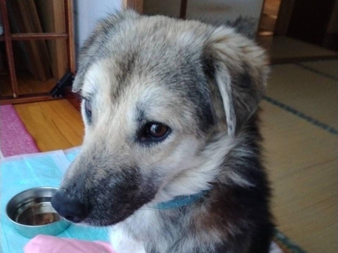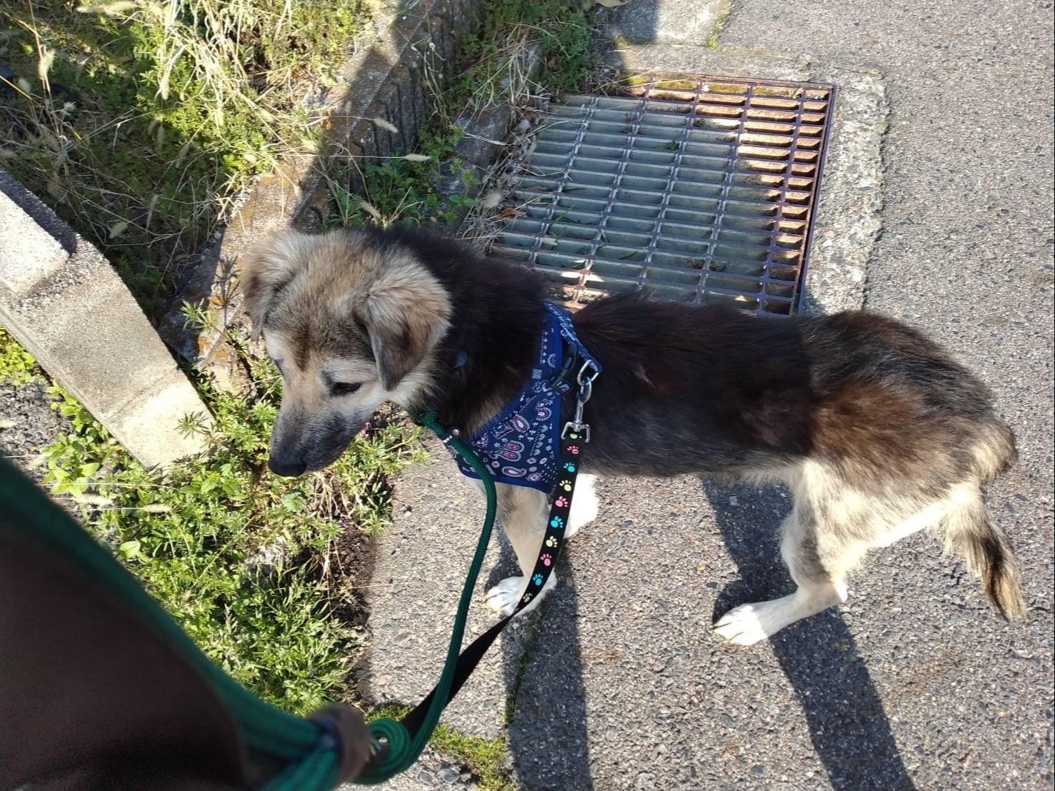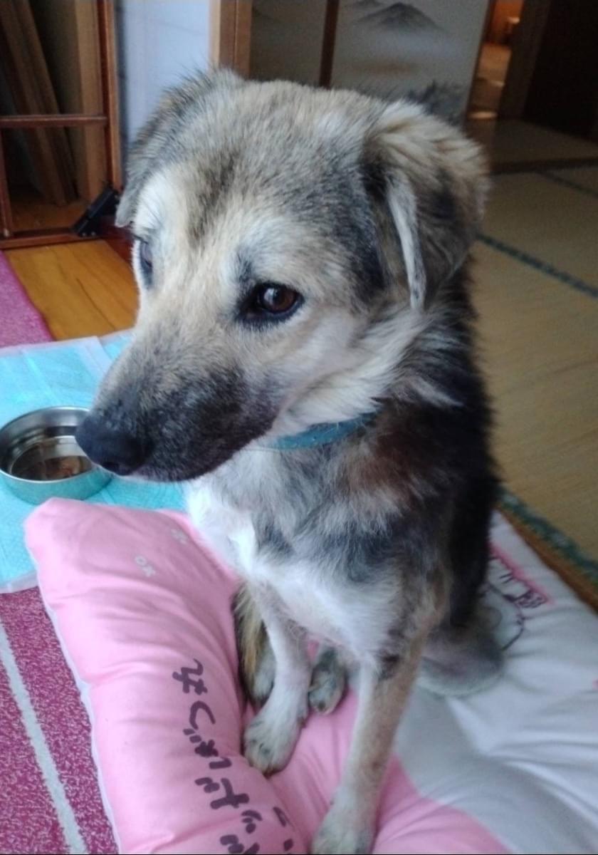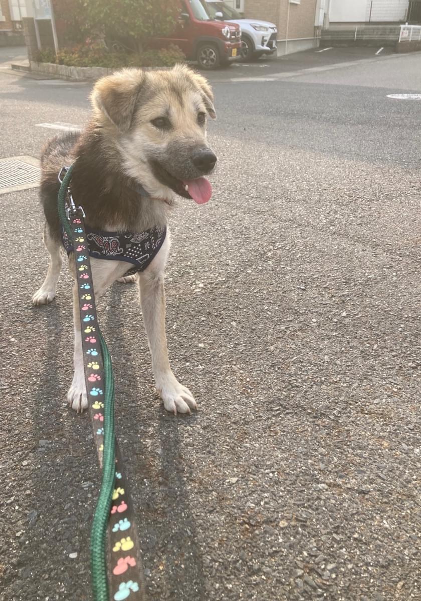 雑種の中型犬で、顔は灰や茶、体は黒色です。首輪をしています。怖がりな性格です。実家から脱走しました。