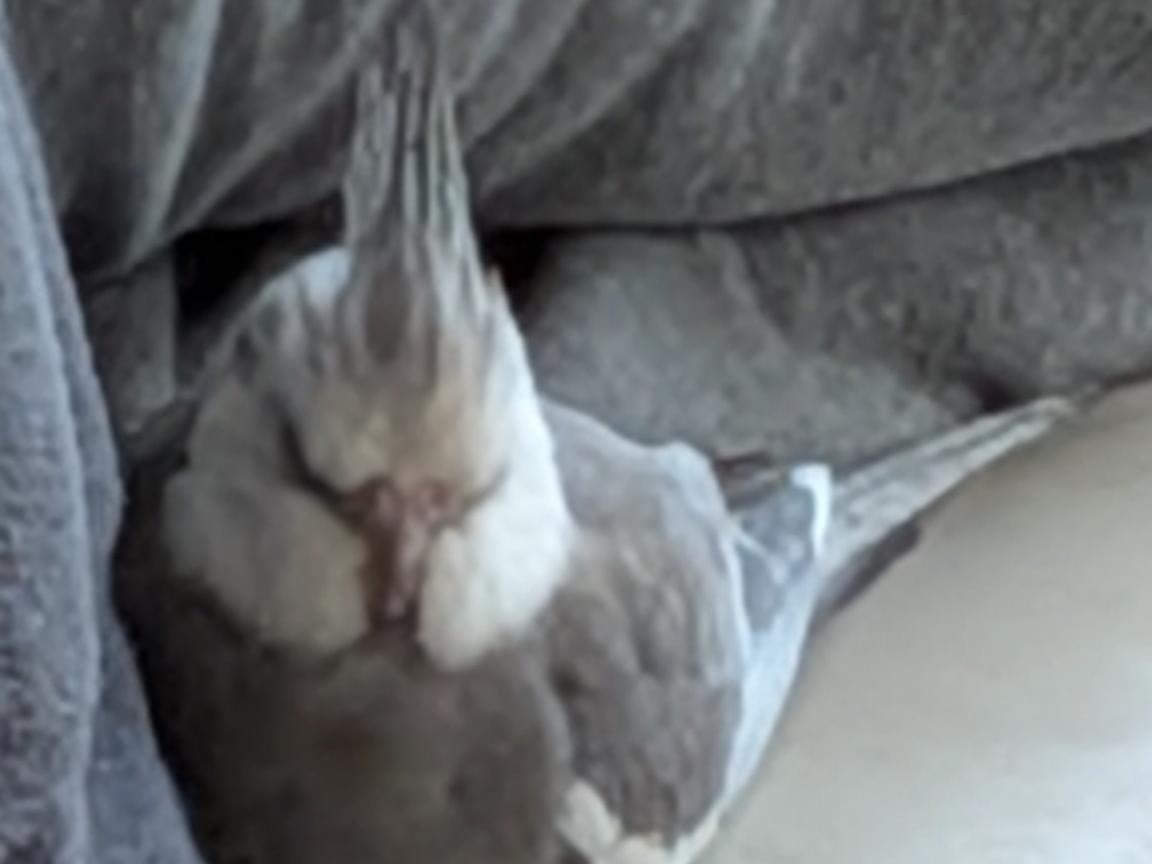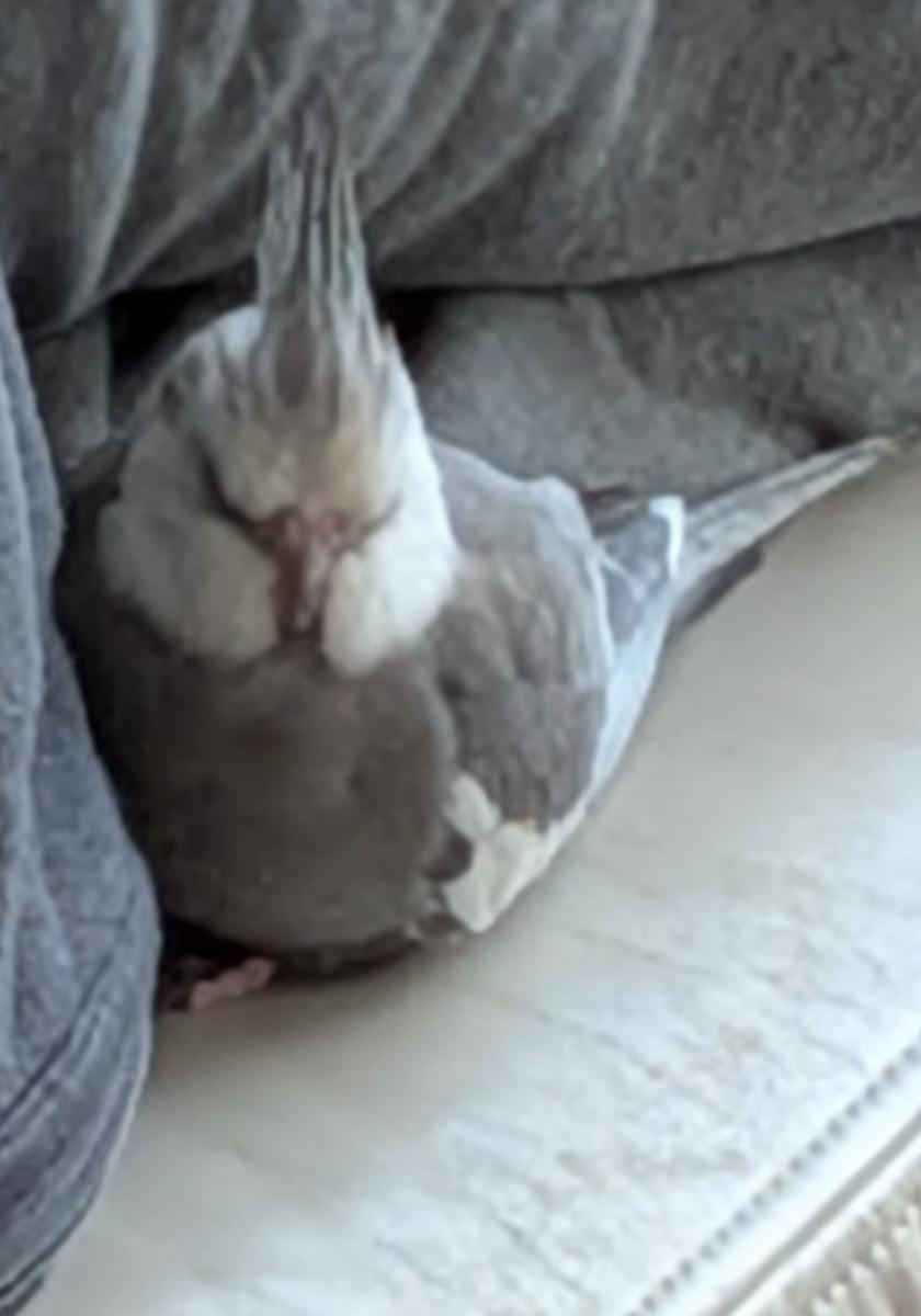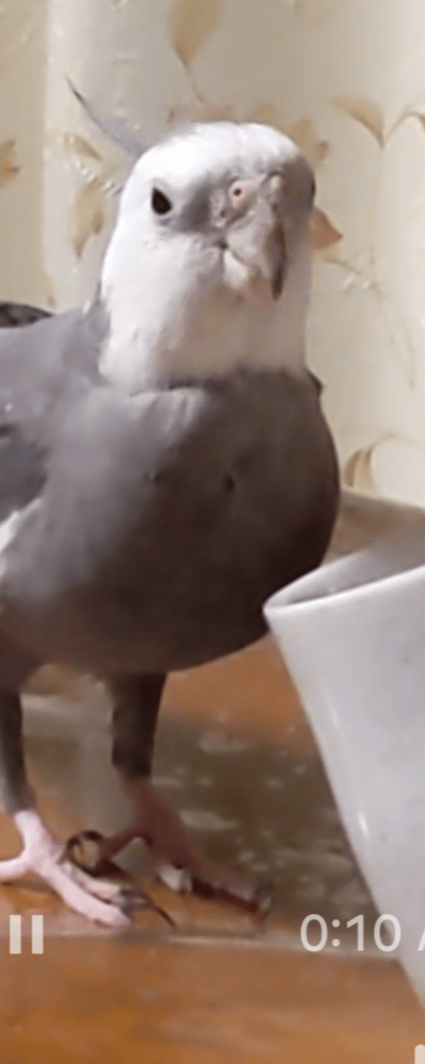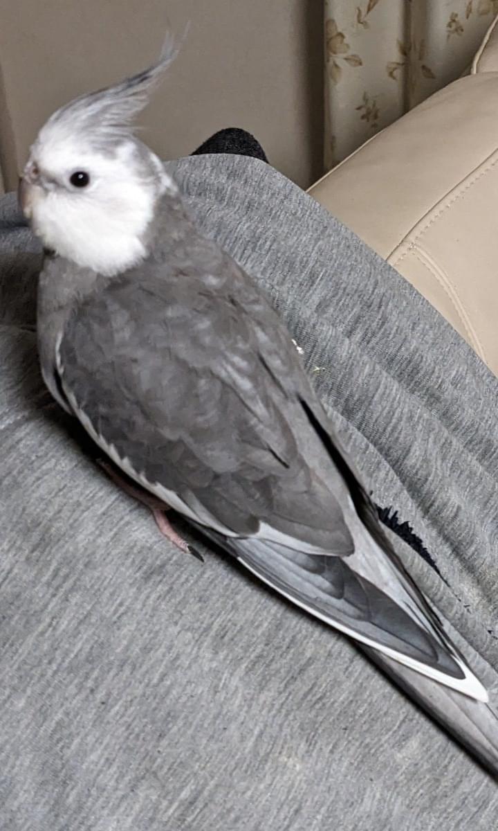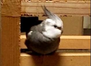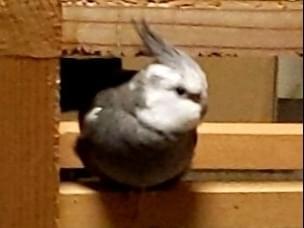 体が灰色で顔が真っ白のオカメインコです。よそのオカメと違って、頭の上にある冠羽(とさかのようになっている毛)がバサッと開いていることが多いです。とても臆病で一人になるのが苦手なので誰でも見つけたら肩に乗ります。でも触られるのは嫌いなので、手を出すと逃げてしまいます。来客があって、玄関を開けていたので、逃げてしまいました。