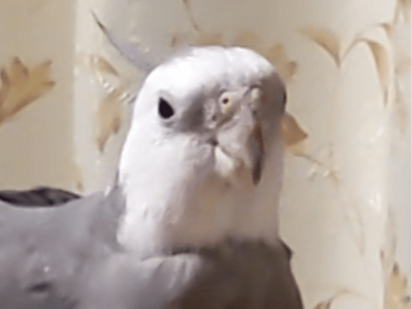 体が灰色で羽の縁と顔が真っ白のオカメインコ
