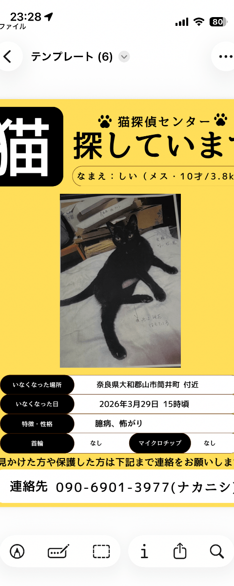 ホーム迷子猫奈良県黒猫探しています。黒猫探しています。管理編集するポスター掲載終了最終更新日時:2026/04/02 23:33写真情報用件迷子名前しい性別メス年齢10歳場所奈良県 大和郡山市杉町発生日時2026年3月29日(日)飼い主ナカニシ説明3月29日杉町235周辺の郡山警察署の近くでいなくなった黒猫を探しています お腹のところに白い毛が生えています。連絡先URL未設定掲示板情報交換のための掲示板です。ユーザーからの情報提供、オーナーからの連絡などにご利用下さいませ。まだコメントはありません。トピックを作成する