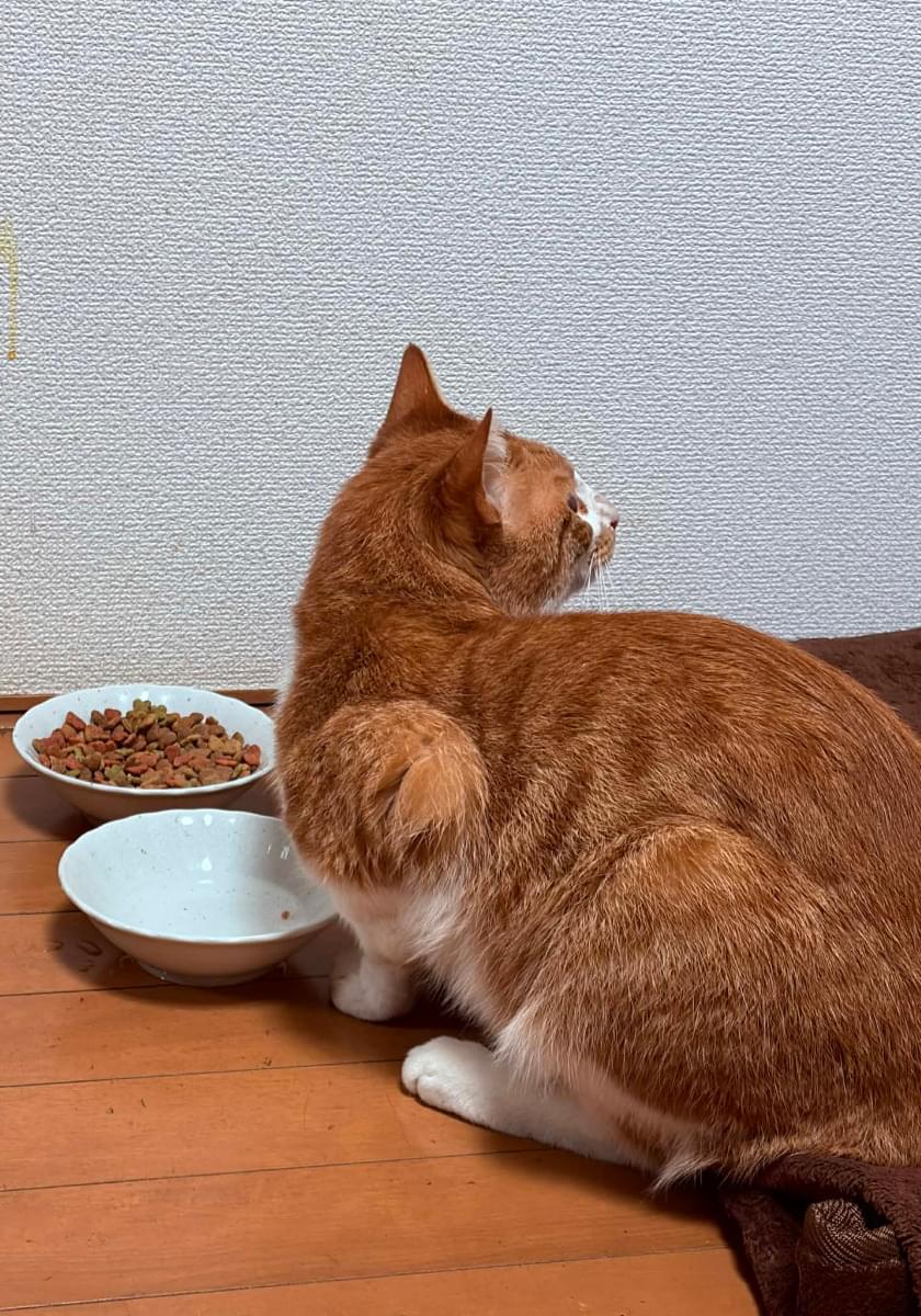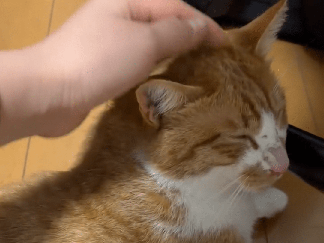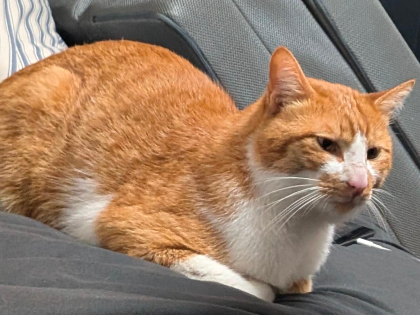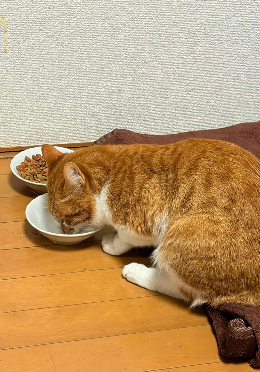 茶トラ白の猫です。顔は白い部分が広いハチワレで、ピンク色の鼻の周りにも小さな斑点があります。