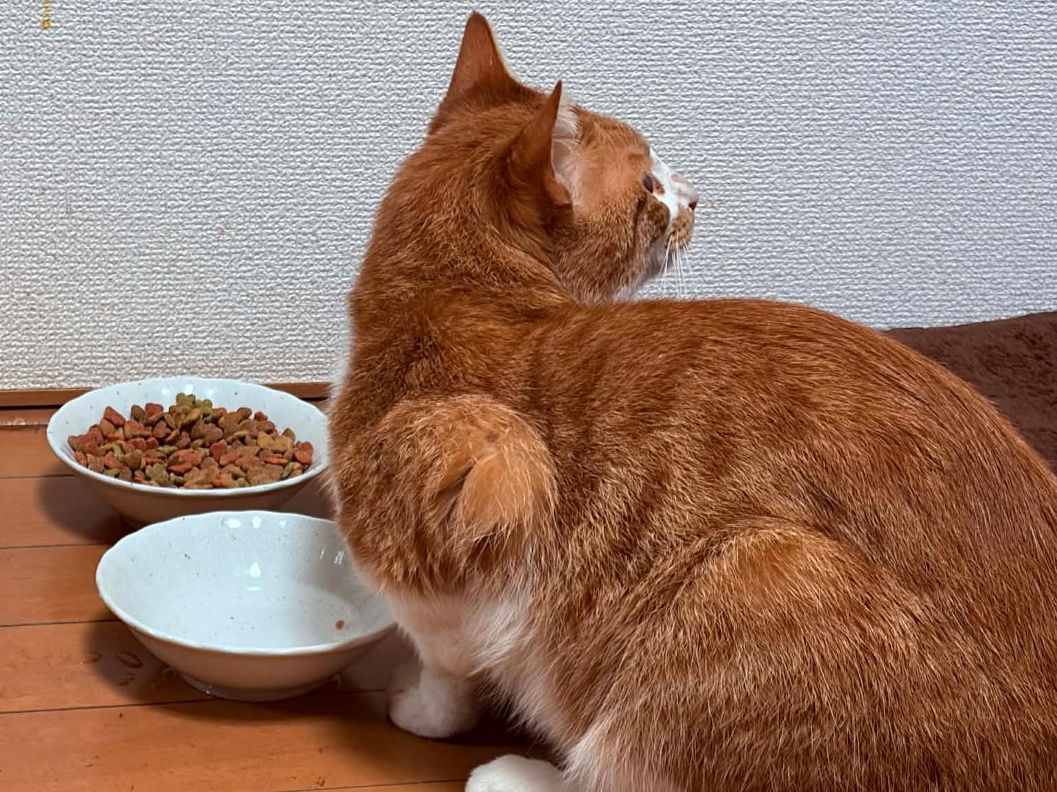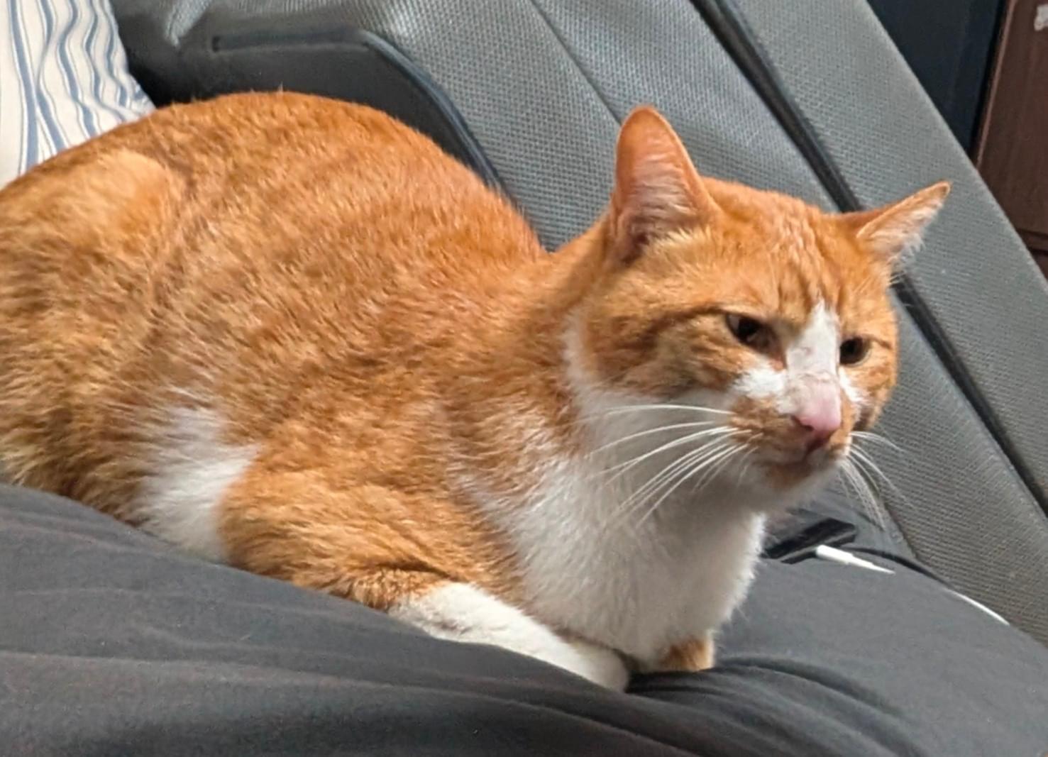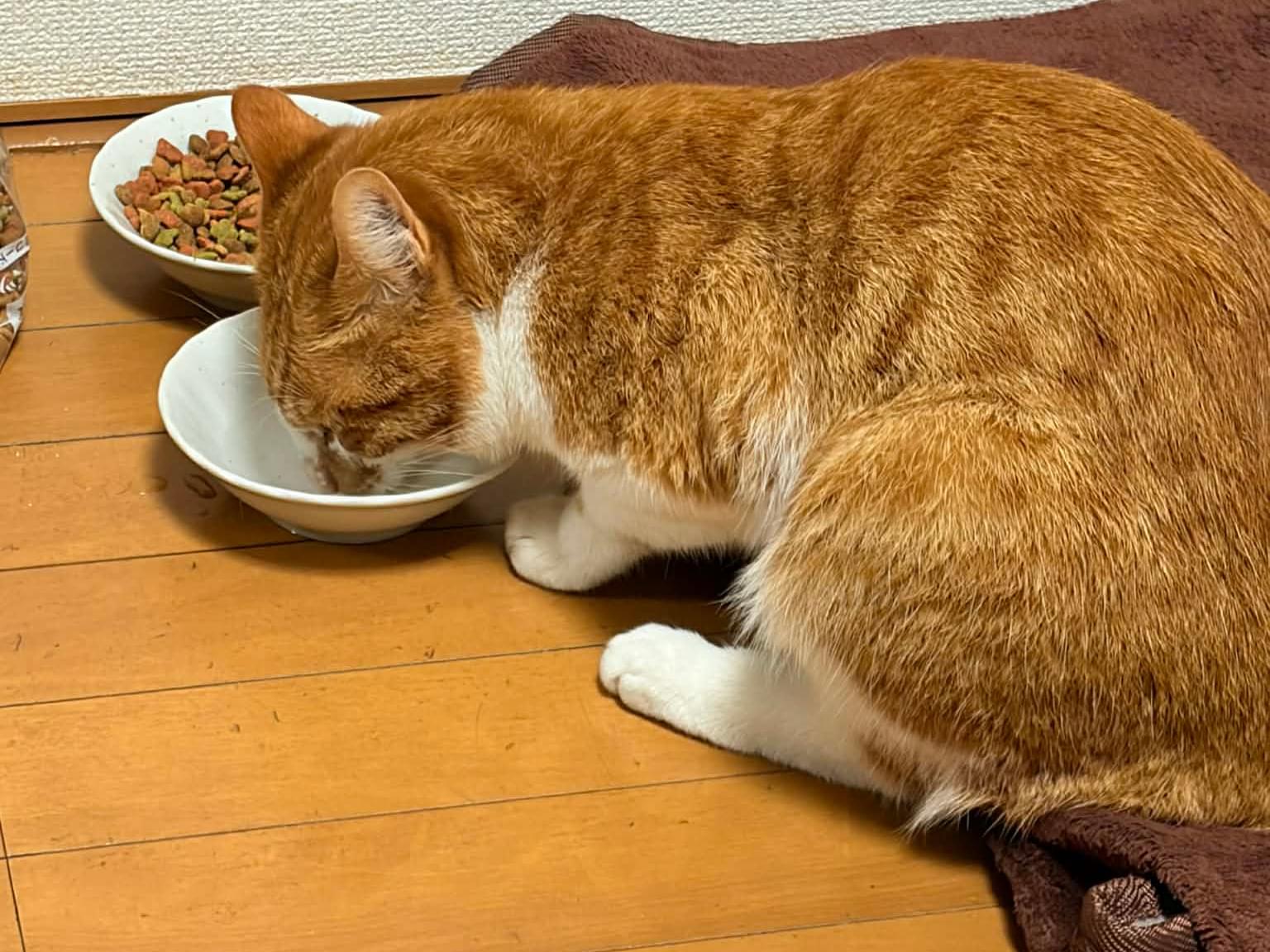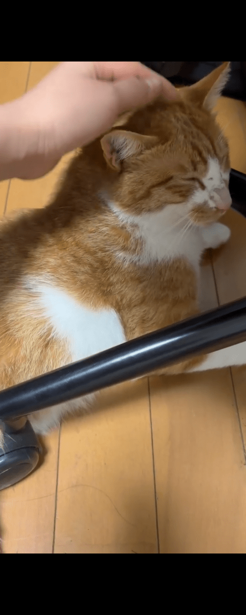 茶トラ白の猫です。顔は白い部分が広いハチワレで、ピンク色の鼻の周りにも小さな斑点があります。