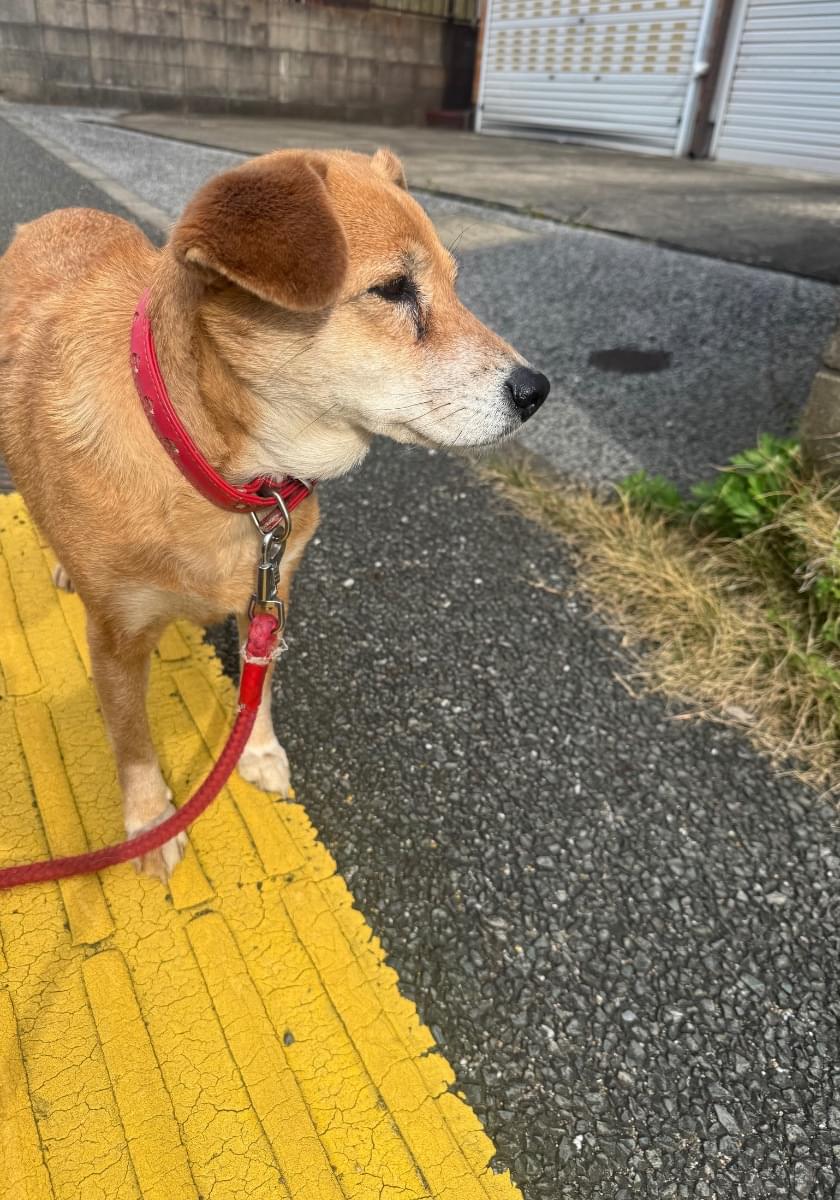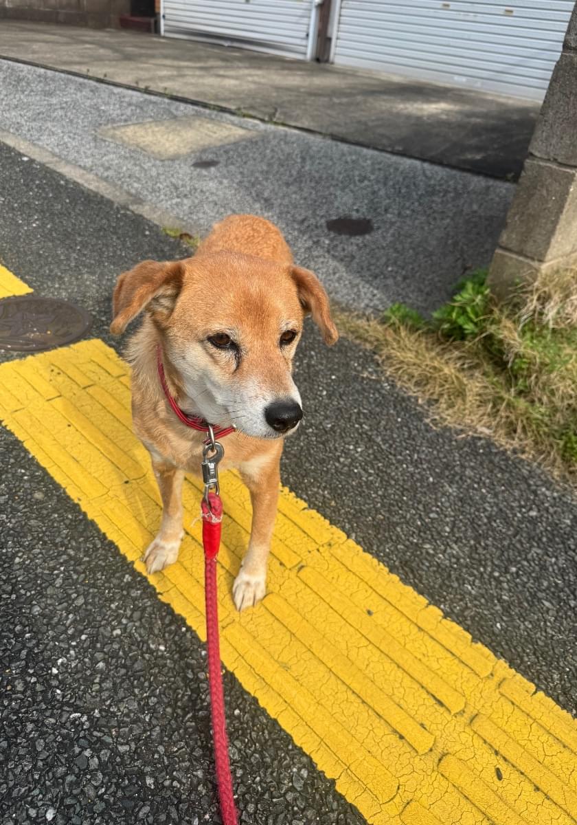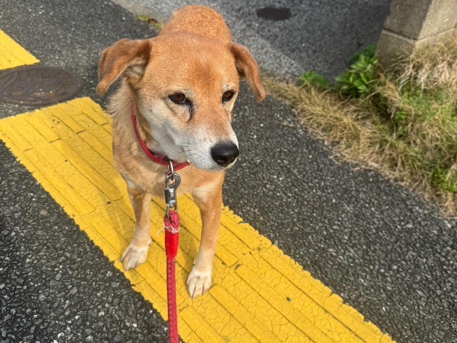 大野南小学校前のバス停の近くで赤い首輪をつけた迷子の犬を発見しました。