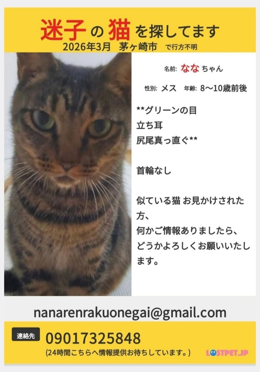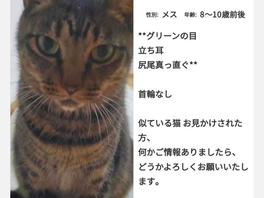 ホーム迷子猫神奈川県キジトラ探していますキジトラ探しています管理編集するポスター掲載終了最終更新日時:2026/04/03 18:49写真情報用件迷子名前なな性別メス年齢8~10歳前後場所神奈川県 茅ヶ崎市発生日時2026年3月3日(火)飼い主よし説明女の子 グリーンの目、立耳 尻尾真っ直ぐです。どうかよろしくお願いいたします連絡先URL未設定掲示板情報交換のための掲示板です。ユーザーからの情報提供、オーナーからの連絡などにご利用下さいませ。書き込んだ情報は、オーナーのメールに通知されます。まだコメントはありません。トピックを作成する
