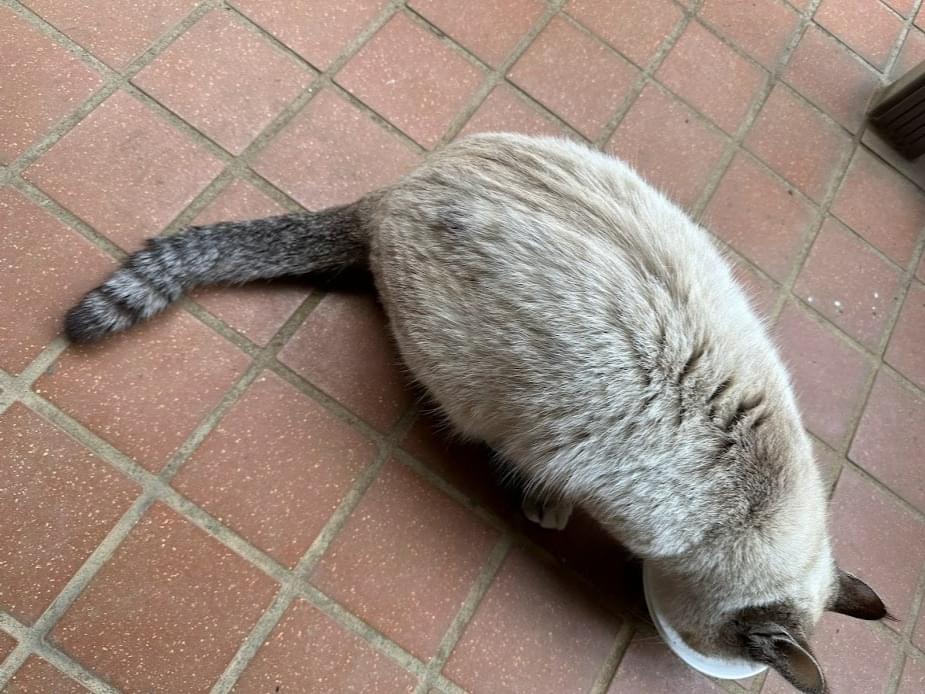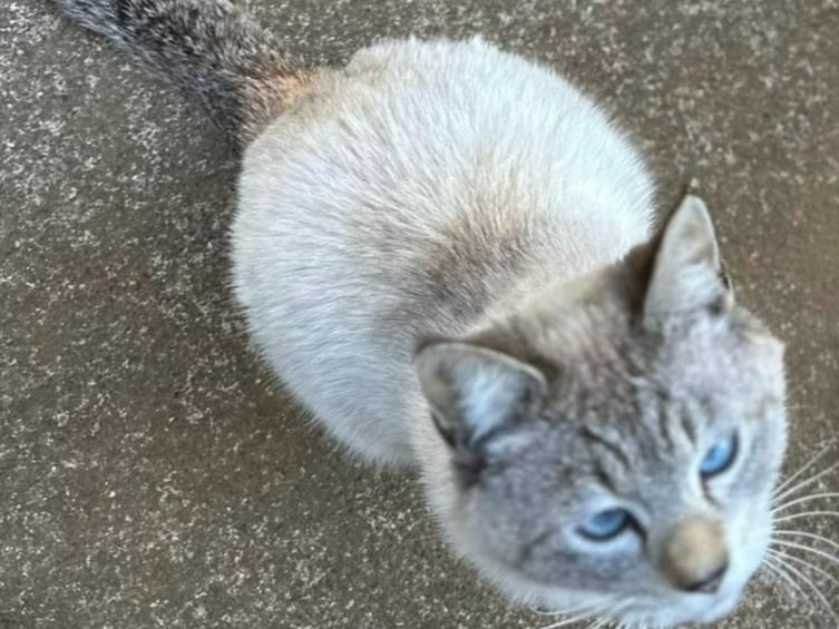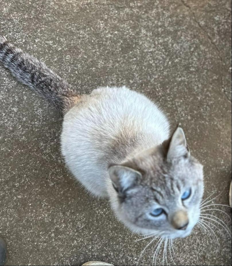 探しています。グレイと薄茶のミックス尻尾シマシマ ブルーの首輪装着