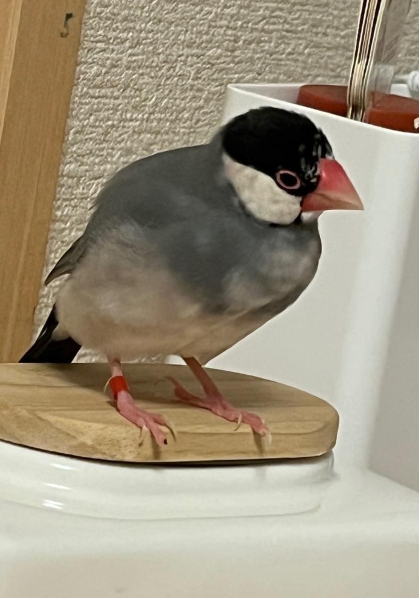 右脚に赤いリングをつけている文鳥
