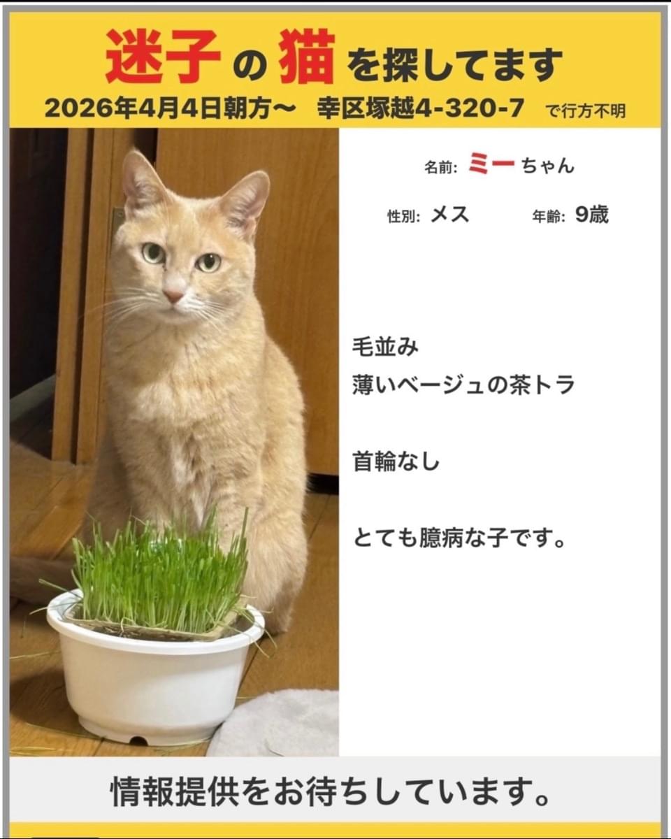 ホーム迷子猫神奈川県探しています!!探しています!!管理編集するポスター掲載終了最終更新日時:2026/04/04 17:45写真情報用件迷子名前ミー性別メス年齢9歳場所神奈川県 川崎市幸区塚越発生日時2026年4月4日(土)飼い主ぽちゆか説明薄いベージュの茶トラ 首輪はしてないです。 メスの9歳です。とても臆病な性格です。ご近所様で発見した際にはご連絡お待ちしております。宜しくお願い致します。連絡先URL未設定掲示板情報交換のための掲示板です。ユーザーからの情報提供、オーナーからの連絡などにご利用下さいませ。まだコメントはありません。トピックを作成する