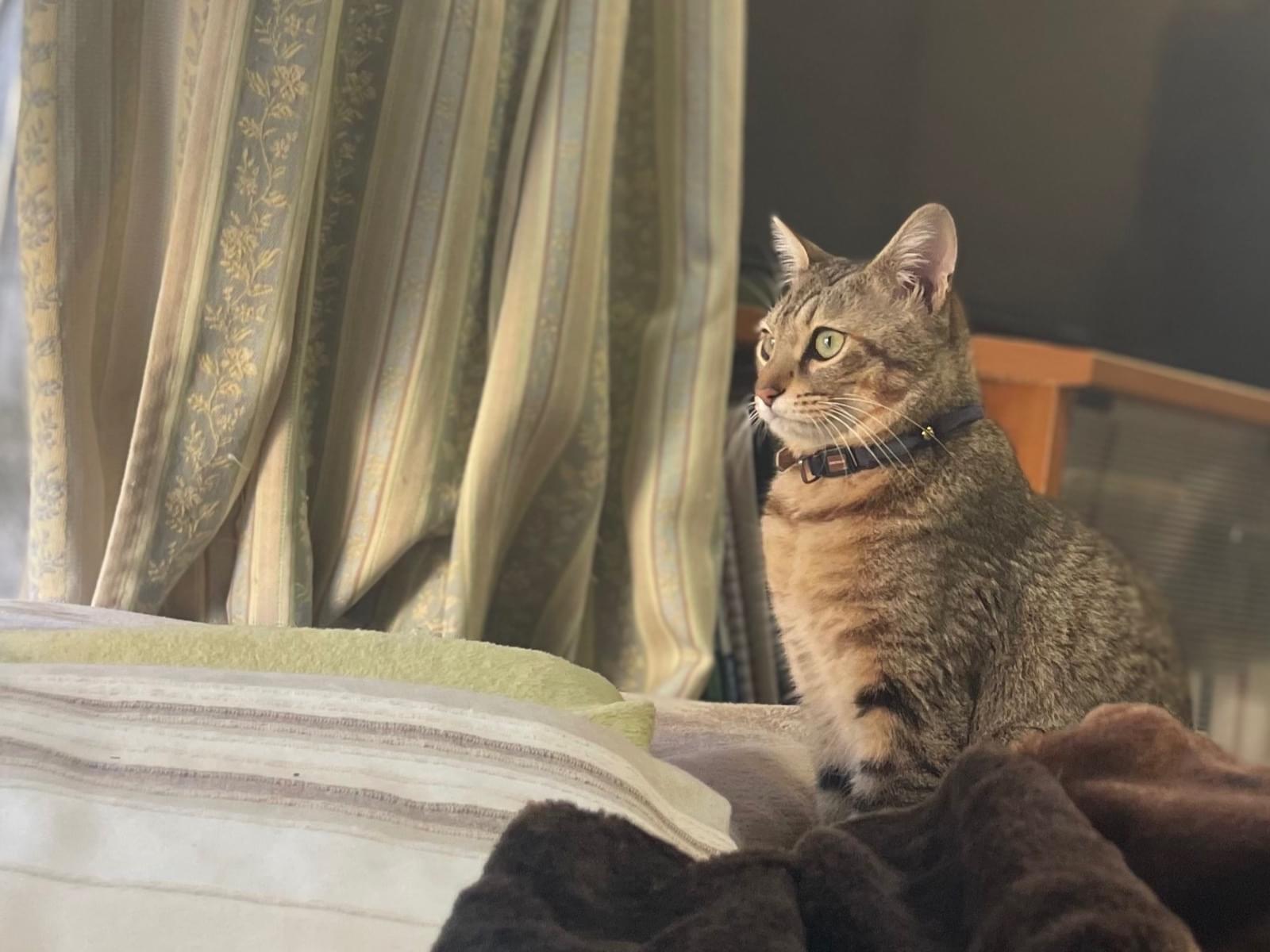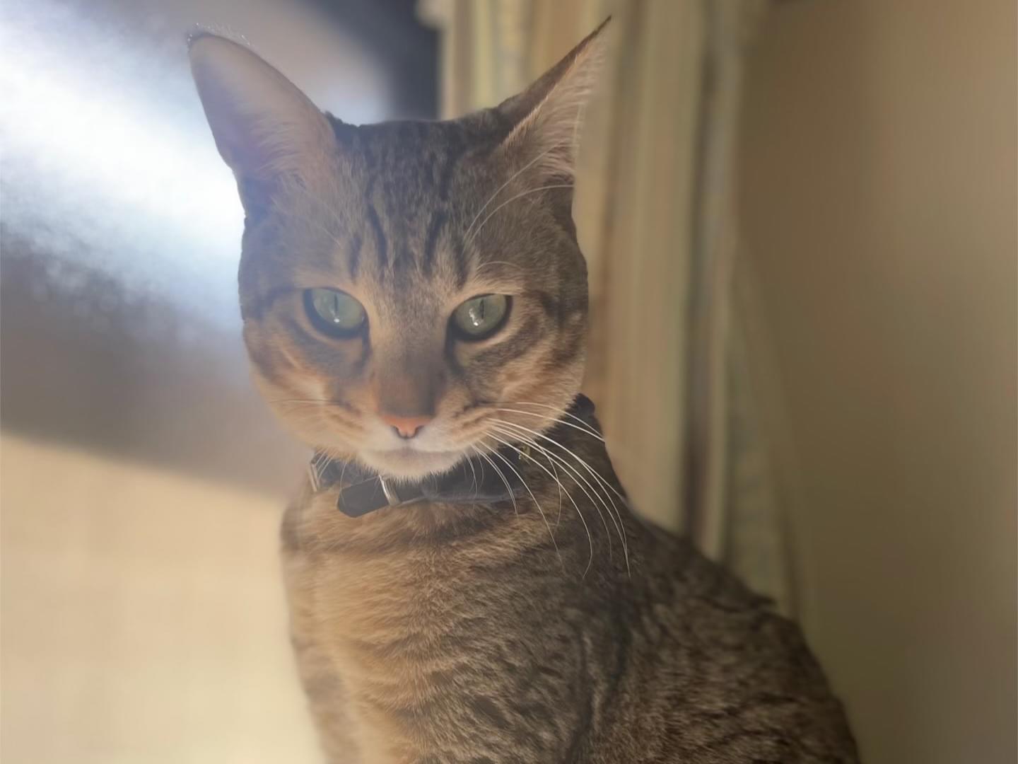 首輪は青色で、小さなリボンと金色の鈴が付いています。