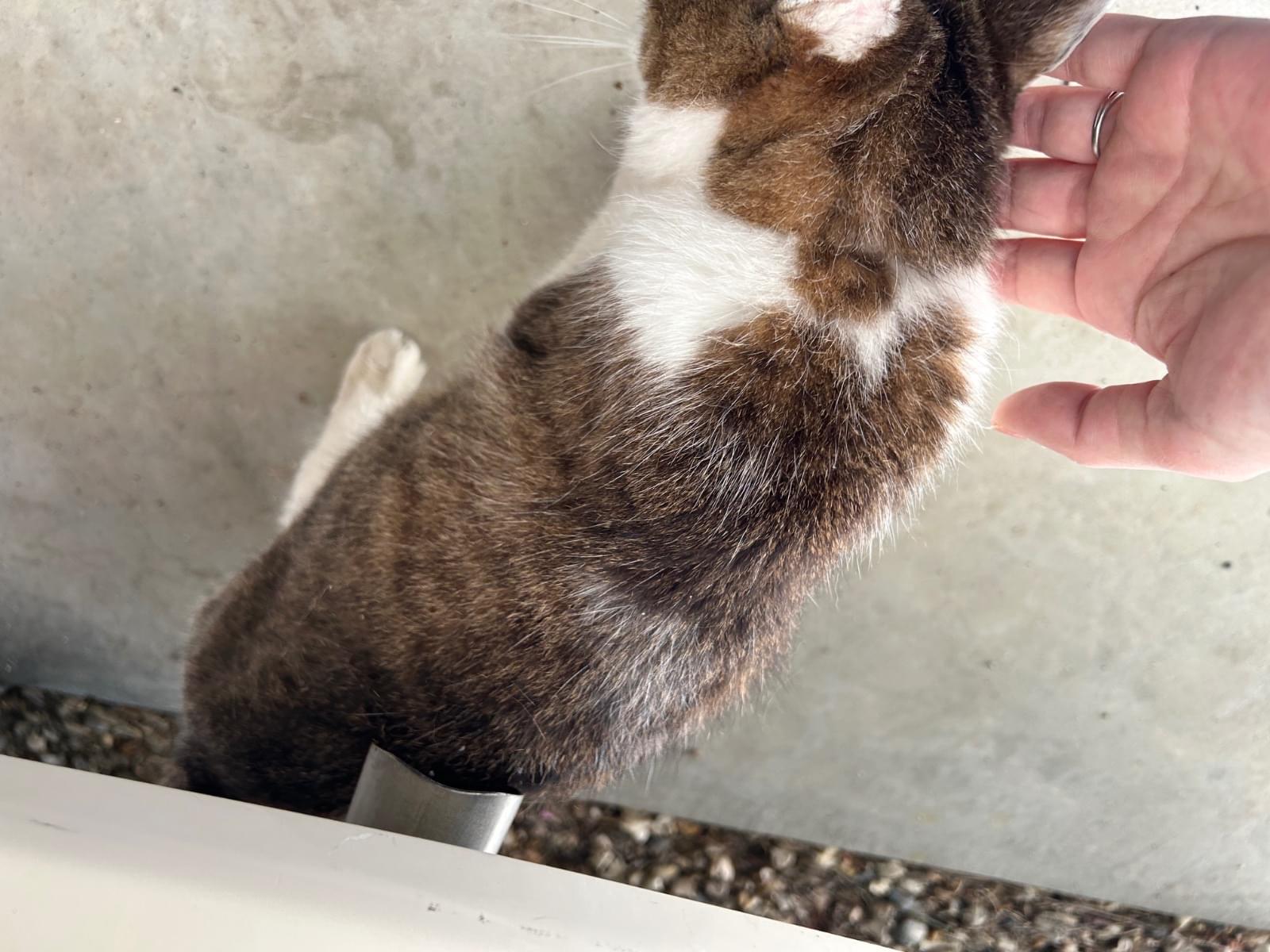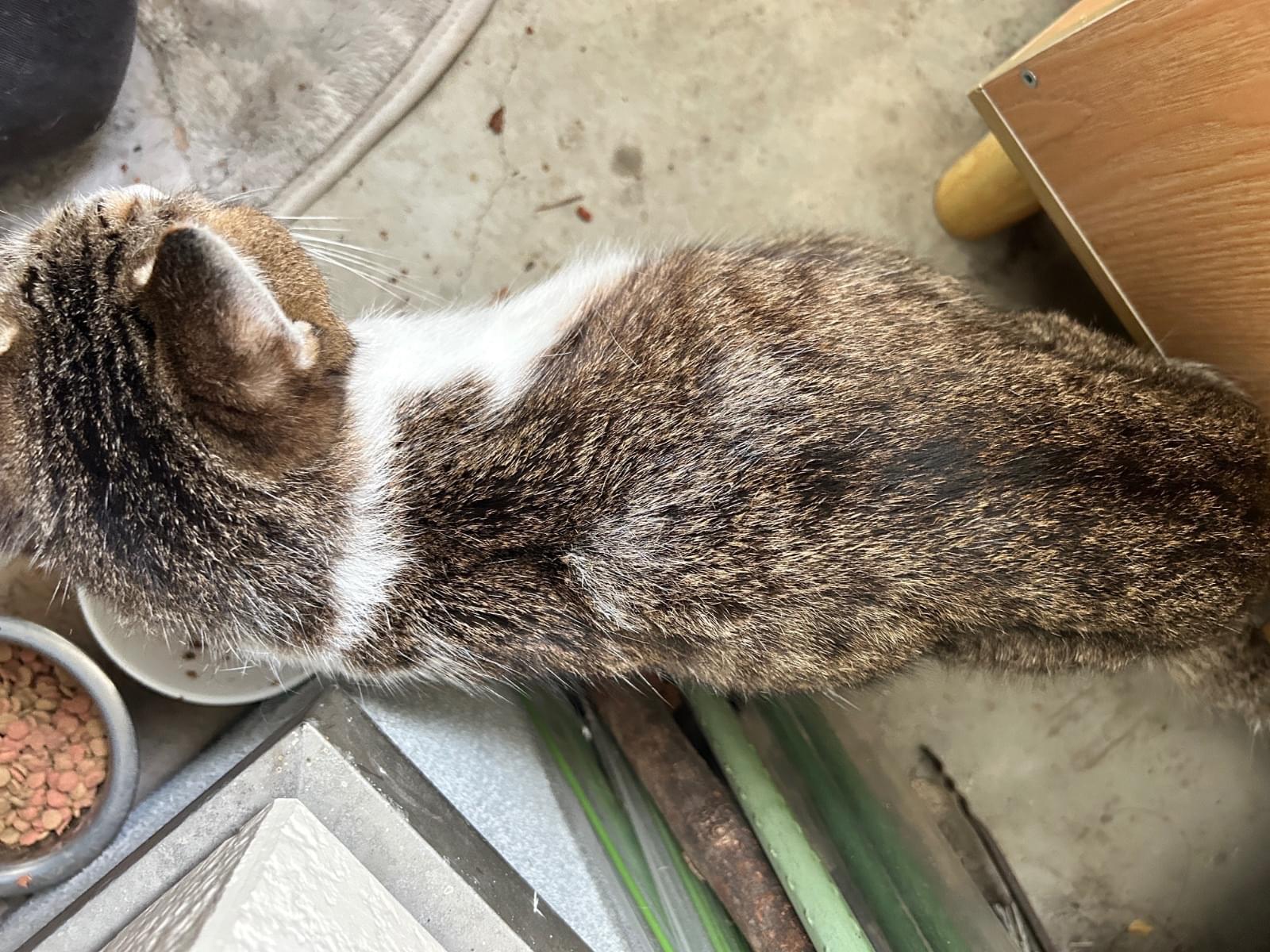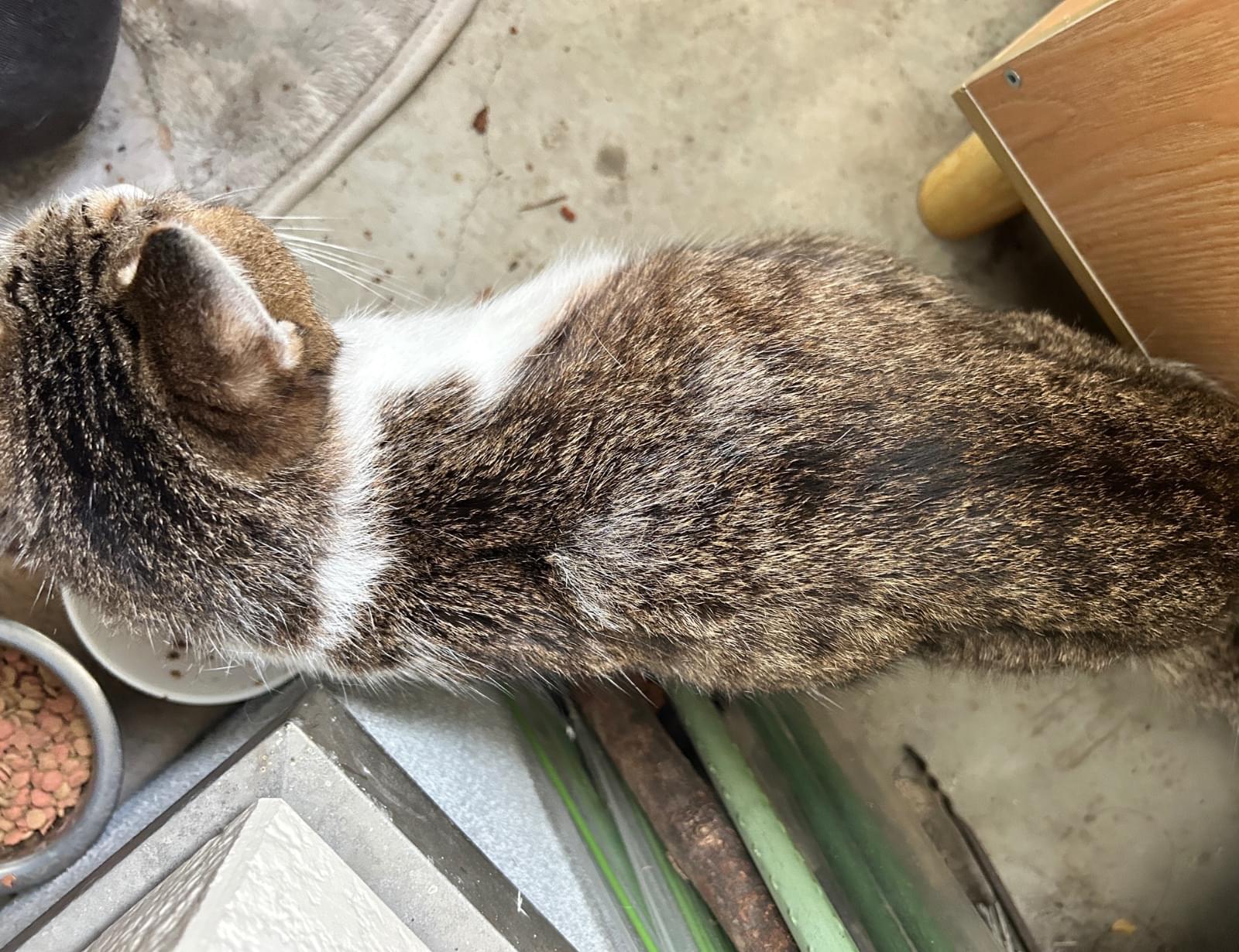 自宅のガレージ内の小屋で寝泊まりしています。最初から声をかけると鳴いて返事をしてくれます。とてもおしゃべりです。最近は慣れてきて抱っこ出来るようになり、腕に両手を回して喉を鳴らして甘えてくれます。痩せているため迷子になってから少し経過していると思います。首輪の跡と思われる脱毛があります。