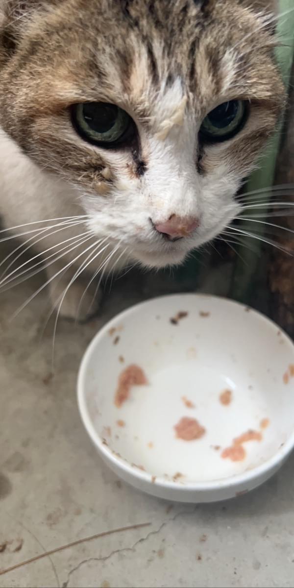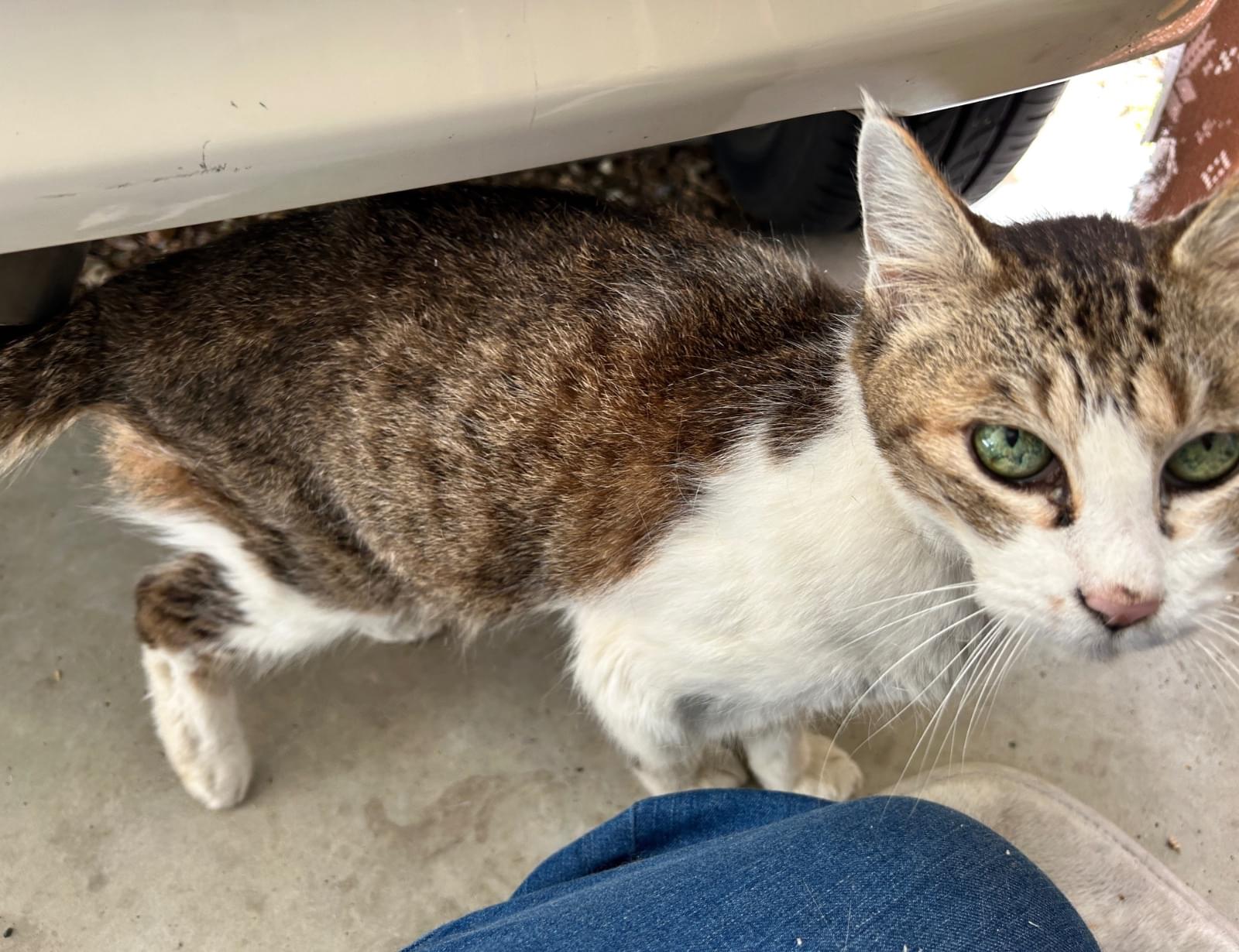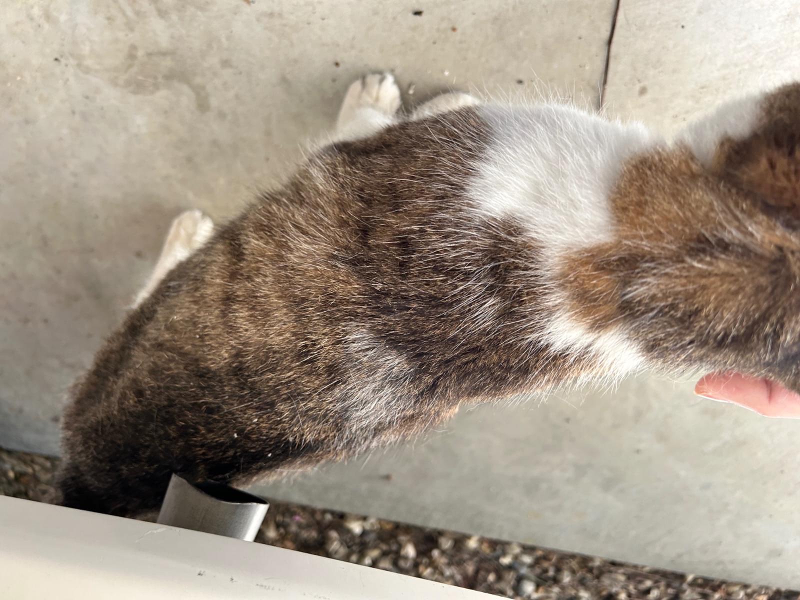 自宅のガレージ内の小屋で寝泊まりしています。最初から声をかけると鳴いて返事をしてくれます。とてもおしゃべりです。最近は慣れてきて抱っこ出来るようになり、腕に両手を回して喉を鳴らして甘えてくれます。痩せているため迷子になってから少し経過していると思います。首輪の跡と思われる脱毛があります。