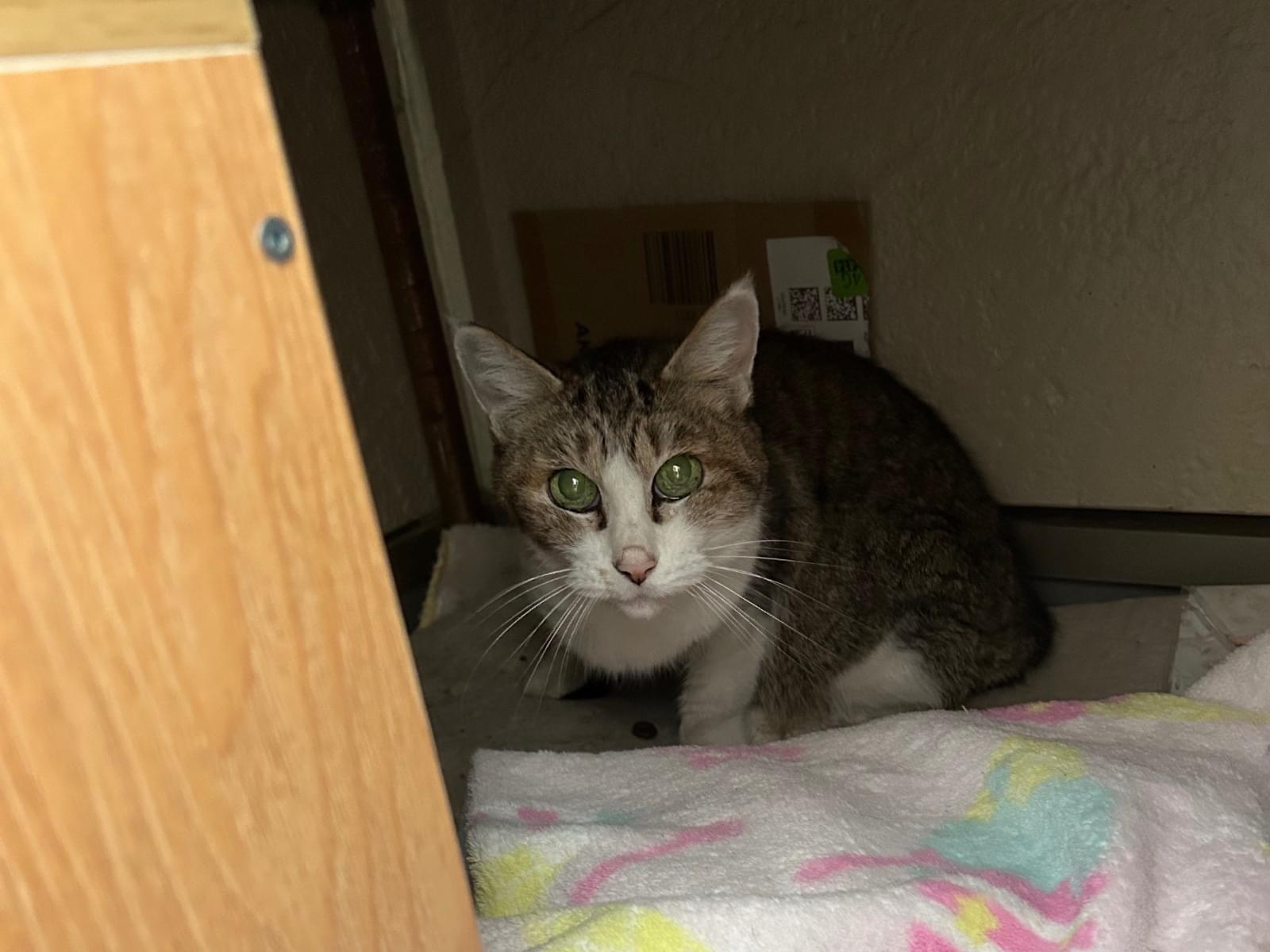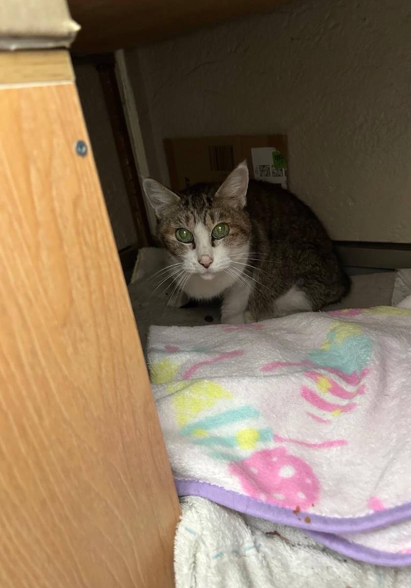 耳カットがないこと、人馴れしていることから避妊手術をされた迷子ではないかと思い当たりました。鳴き声のわかる動画があるのですがサイズが大きく掲載出来ませんでした。圧縮出来た際には追加したいと思います。お心当たりがあればお問い合わせをお願いします。