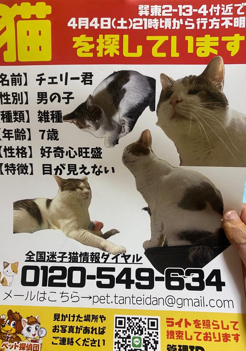 目が見えない猫ちゃんを探しています